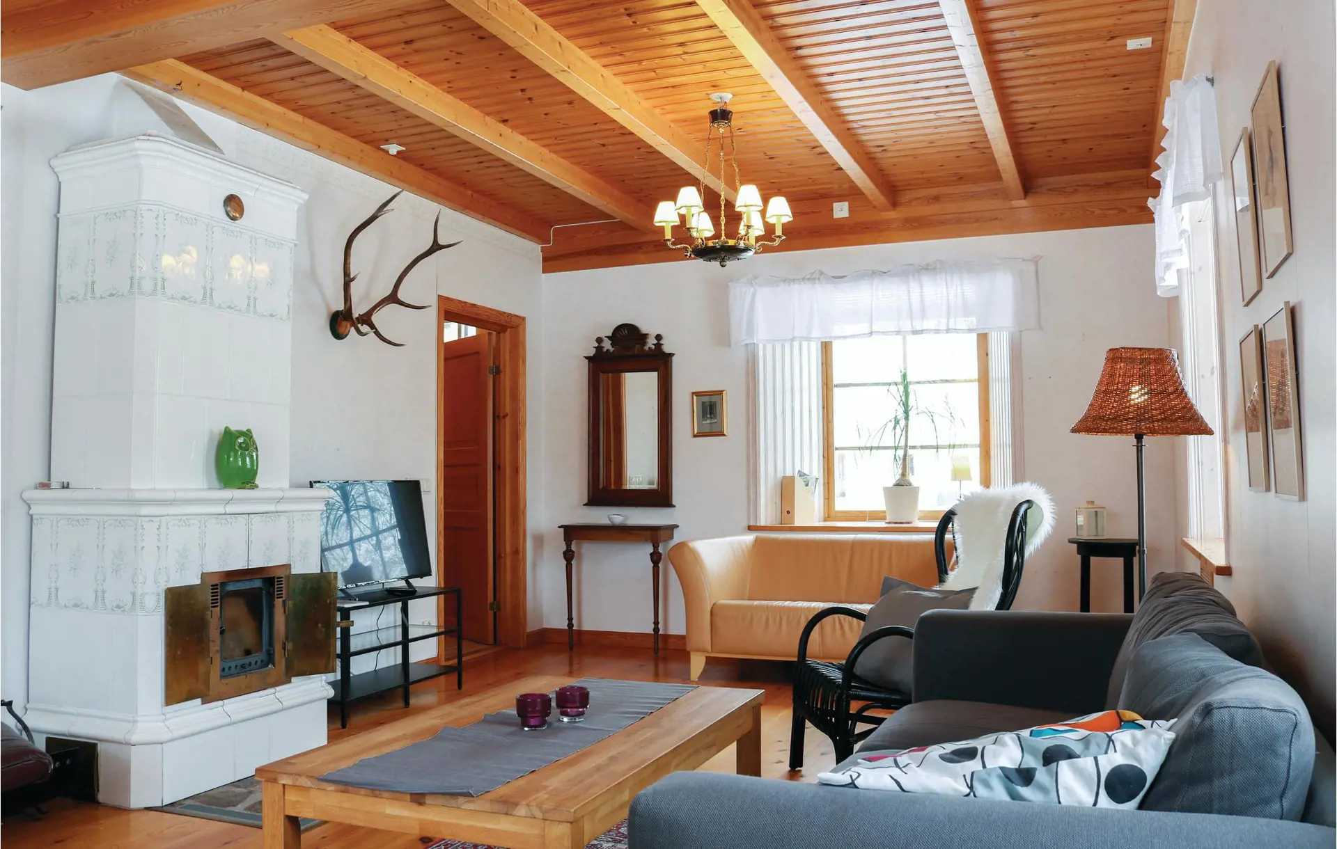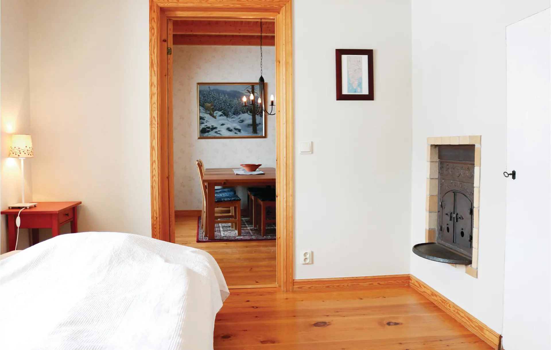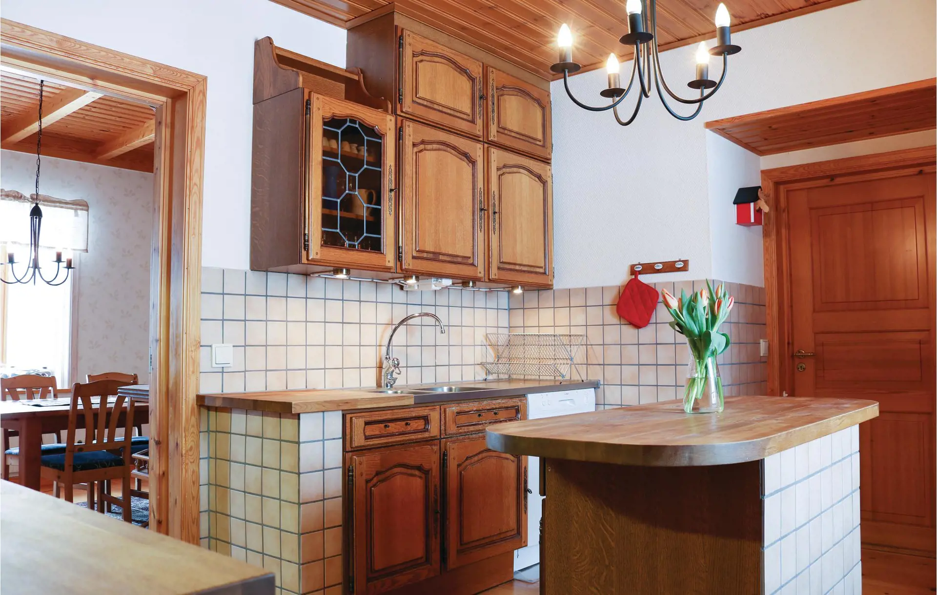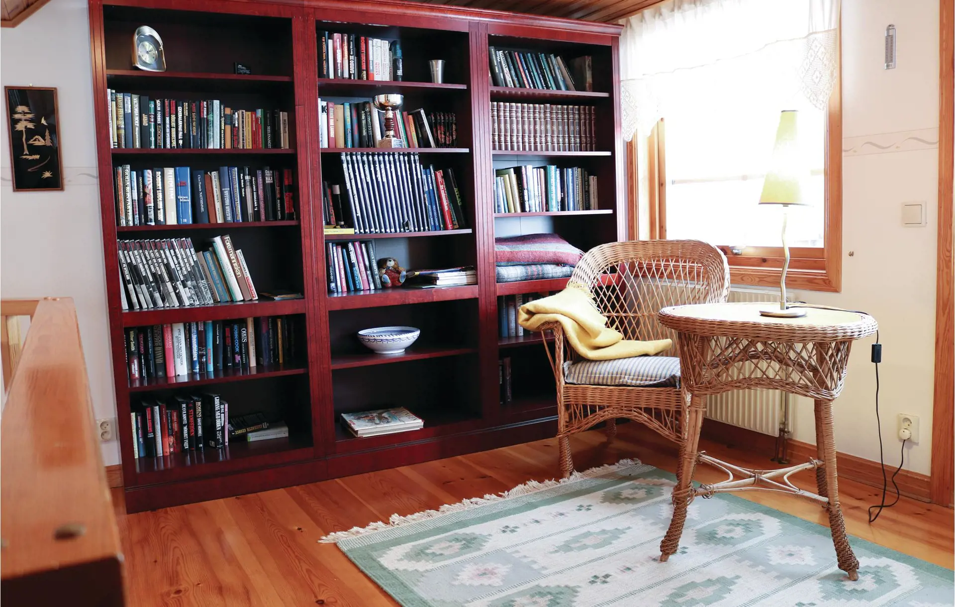 Das Haus verfügt über eine herrliche Küche mit Kochinsel. Klinker und Holzböden in fast allen Räumen. Großes, herrliches Wohnzimmer mit Kachelofen. Ein Schlafzimmer im Obergeschoss wird mit Vorhang abgetrennt. Gute Angelgewässer in den Seen Möckeln und Tornsjön (1,5 km).