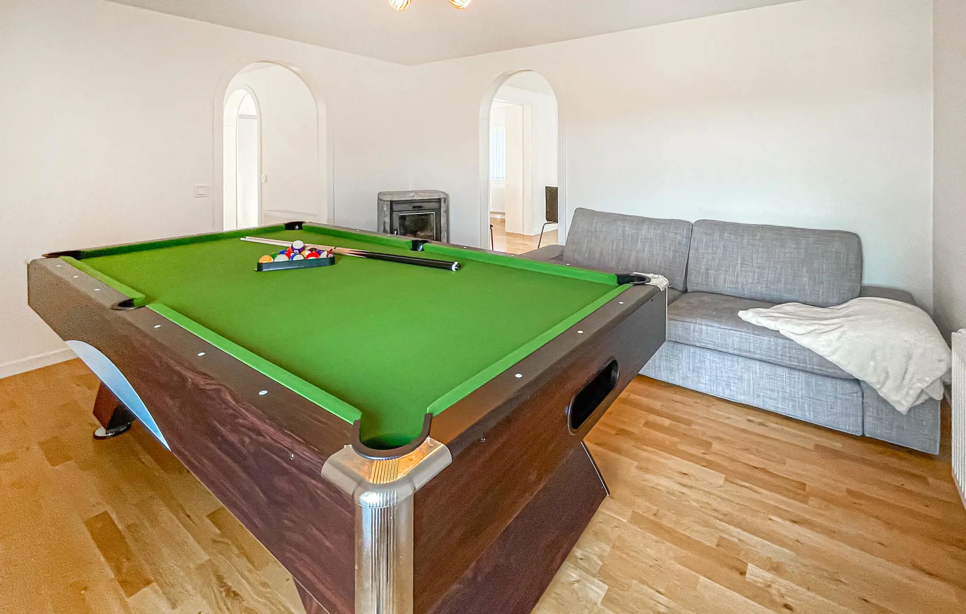Dieses Haus ist der ideale Rückzugsort, wenn Sie sich nach Ruhe und Erholung in der Natur sehnen. Helle Räume, eine schöne Holzoptik und modernes Mobiliar sorgen für eine angenehme Atmosphäre. Lehnen Sie sich mit einem duftenden Kaffee zurück, spielen Sie eine Runde Billard oder entzünden Sie an kühlenden Abenden den Kaminofen und entspannen Sie sich bei wohliger Wärme.