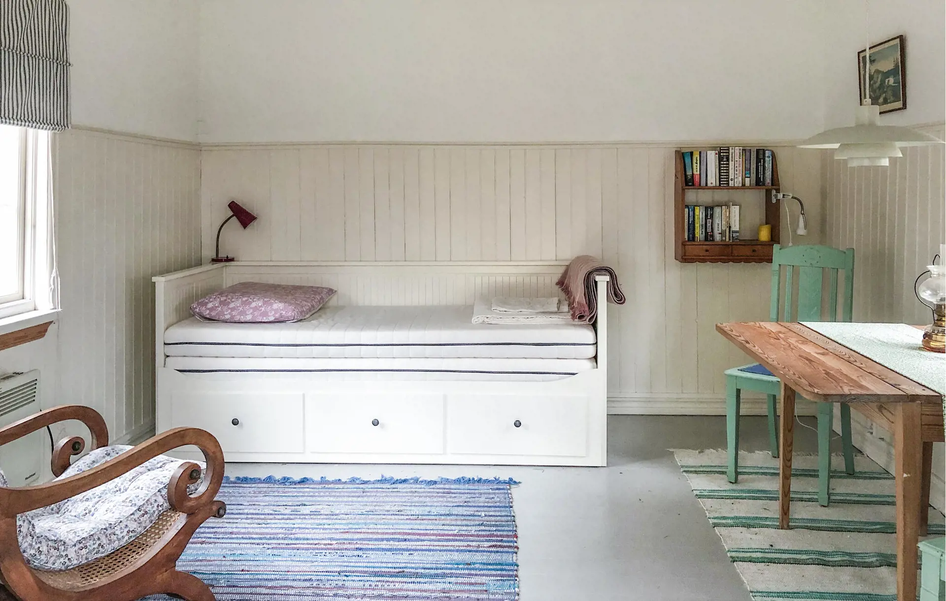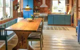 Das Haus stammt aus den 1800er Jahren und man spürt die Geschichte, denn breite Dielenböden, freiliegende Holzwände und schöne alte Kamine verleihen dem Wohnzimmer und den Schlafzimmern eine gemütliche Atmosphäre, die Sie auf einen Regentag hoffen lässt, an dem Sie ein Feuer im Kamin und ein gutes Buch oder ein Spiel genießen können. Es gibt auch einen Projektor im Haus, so dass man mit einem von zu Hause mitgebrachten PC auch das Heimkino einschalten kann. Die alte Küche des Hauses wurde beibehalten, aber erweitert, um Platz für eine große Familie und Freunde zu schaffen, und lädt dazu ein, die Himbeeren, Blaubeeren oder Pilze zuzubereiten, die Sie auf kurzen Spaziergängen in der Umgebung ernten können. Die Küche ist das Herzstück des Hauses und schließt direkt an die sonnige Terrasse und den Garten an, so können Sie, auch wenn Sie sich mit der Zubereitung köstlicher Speisen Zeit lassen wollen, mit den Aktivitäten der Familie Schritt halten. Das Obergeschoss ist für zusätzlichen Platz ausgelegt, denn das Haus kann problemlos viele Gäste beherbergen, und der kleine, gemütliche Anbau ist immer gefragt.