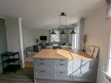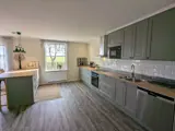 Der Flur führt zu einer großen Küche und zu einem Gäste-WC mit Waschbecken. Die Küche ist in offener Verbindung zum Wohnzimmer hin gestaltet und verfügt über eine Kücheninsel mit Sitzgelegenheiten, ein modernes Induktionskochfeld, eine Dunstabzugshaube, eine Kaffeemaschine, einen Wasserkocher, eine Mikrowelle und einen Toaster.
