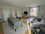 Das Wohnzimmer verfügt über einen Tisch mit Sitzgelegenheiten für 8-10 Personen, ein Sofa und einen Fernseher und hat einen neu geschliffenen Parkettboden. Doppelte Glastüren führen hinaus auf die große Terrasse.