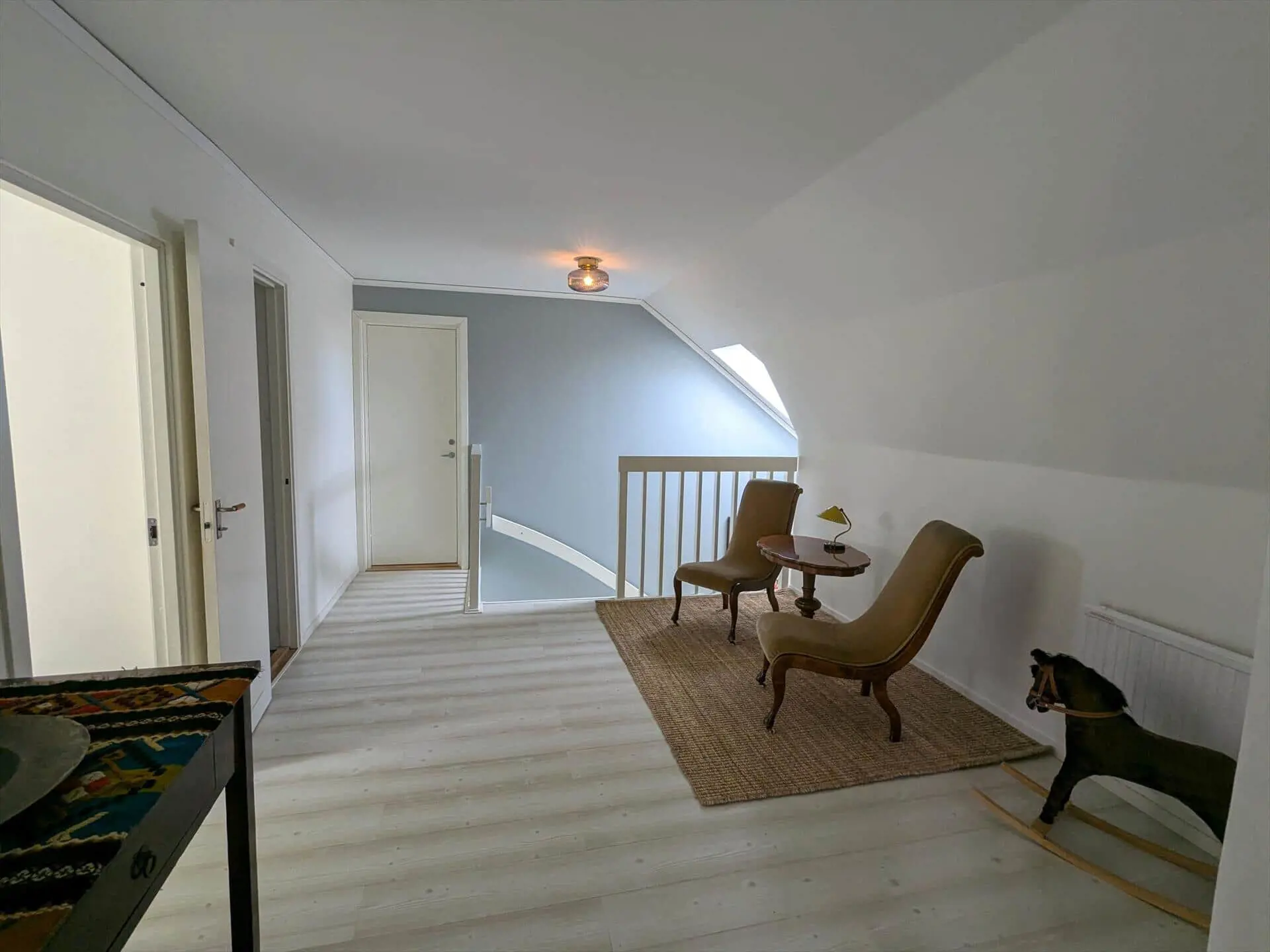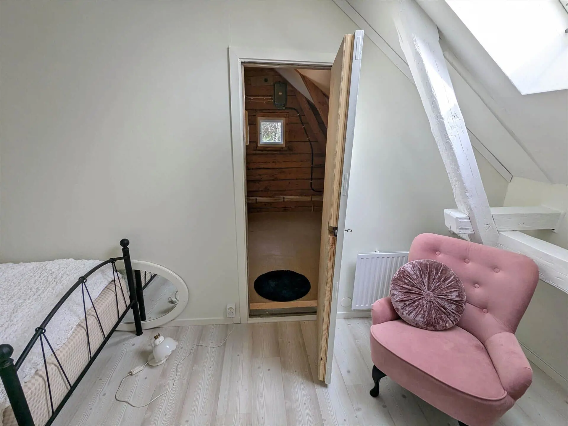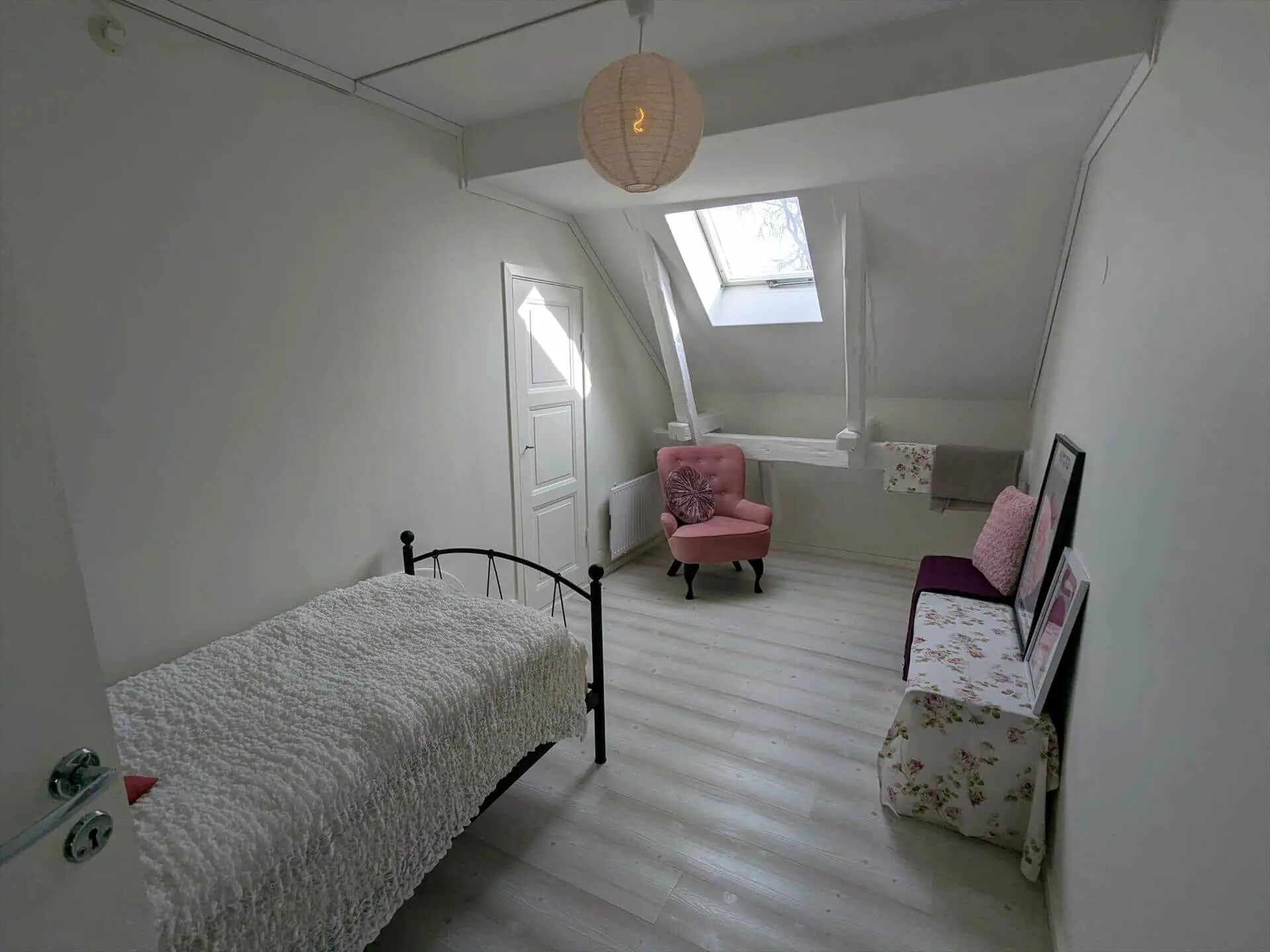 Die Treppe ins Obergeschoss führt in einen großen Flur, von dem aus man die beiden anderen Schlafzimmer erreicht. Das kleinere Schlafzimmer ist in Weiß und Rosa gehalten, hat offenliegende Deckenbalken, Oberlicht, ein Einzelbett (90 cm) und einen eigenen Abstellraum bzw. begehbaren Kleiderschrank. Das größere Schlafzimmer beinhaltet ein Doppelbett (2 x 90 x 200 cm) und einen Kleiderschrank.