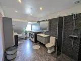 Vom Flur im Obergeschoss aus erreichen Sie einen anderen Abstellraum bzw. begehbaren Kleiderschrank (es gibt eine Menge Stauraum im Haus!) und ein großes Badezimmer mit Toilette, Dusche, Waschmaschine, Wäschetrockner, Bügelbrett und Bügeleisen.