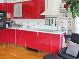 Der Küchen-/Wohnbereich hat firsthohe Decken und große Fenster, was den Raum besonders luftig und großzügig macht. Von hier hat man Zutritt zu einer ca. 40 m2 großen Holzterrasse mit schönem Ausblick, die sich für Sommertage und lauschige Grillabende anbietet. Sitzgelegenheiten, Sonnenschirm und Fjordblick inklusive!