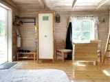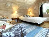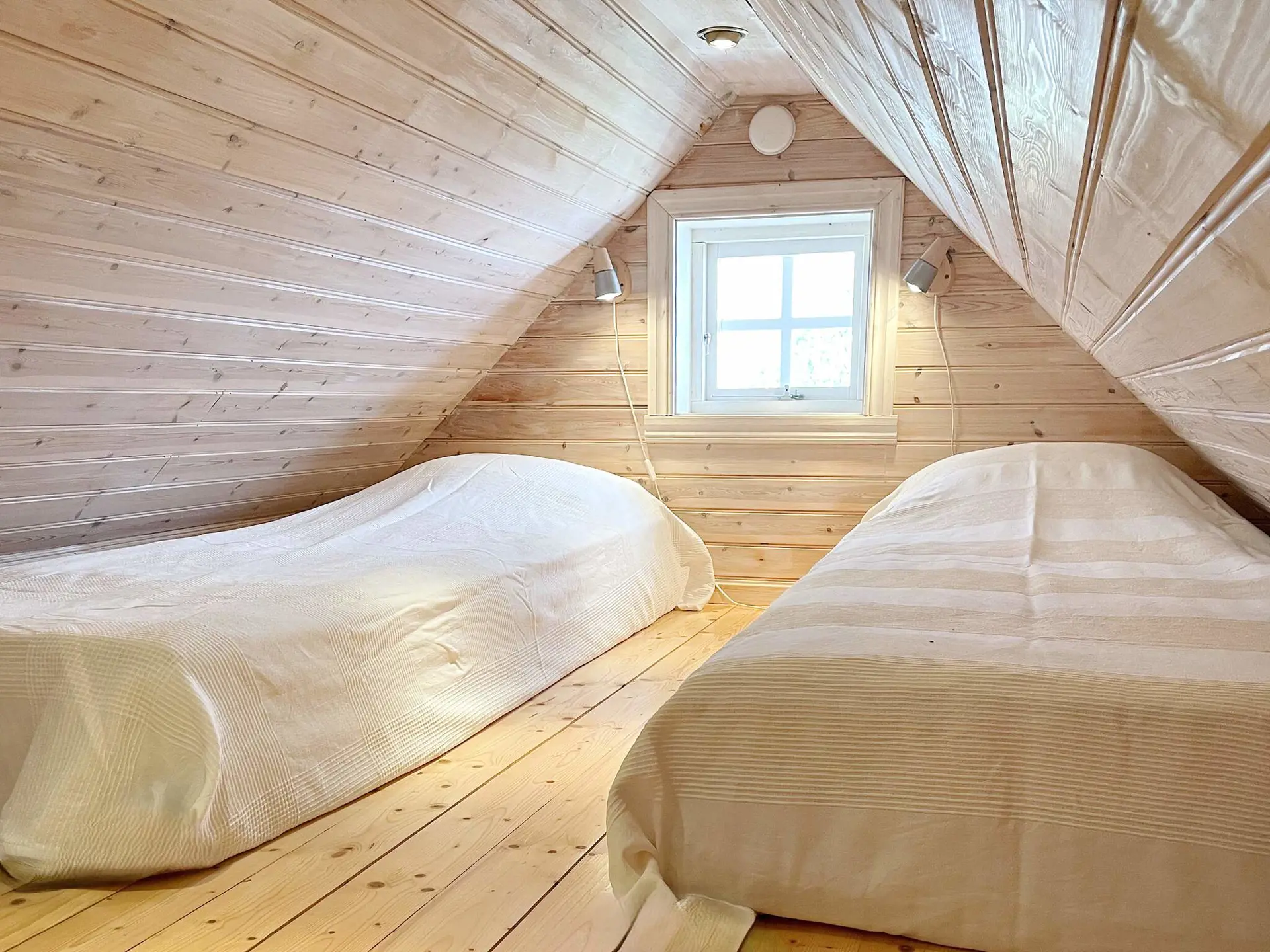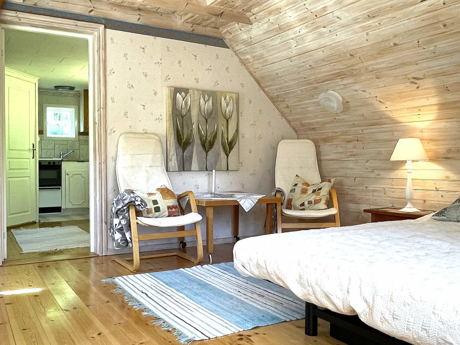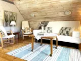 Entrance to the cottage from the terrace into the open hall with living room. In this cozy room there is a sofa bed for two and a ladder that leads up to the sleeping loft with two single beds which can easily be pushed together to make a double bed. Here the ceilings are a bit low but very cozy. On the lower level there is the kitchen with all the possibilities for self-catering. A sleeping alcove with bunk beds next to the kitchen and a very fresh bathroom with shower and toilet. Patio with barbecue barrel and benches where you can make a fire with wood or coal.