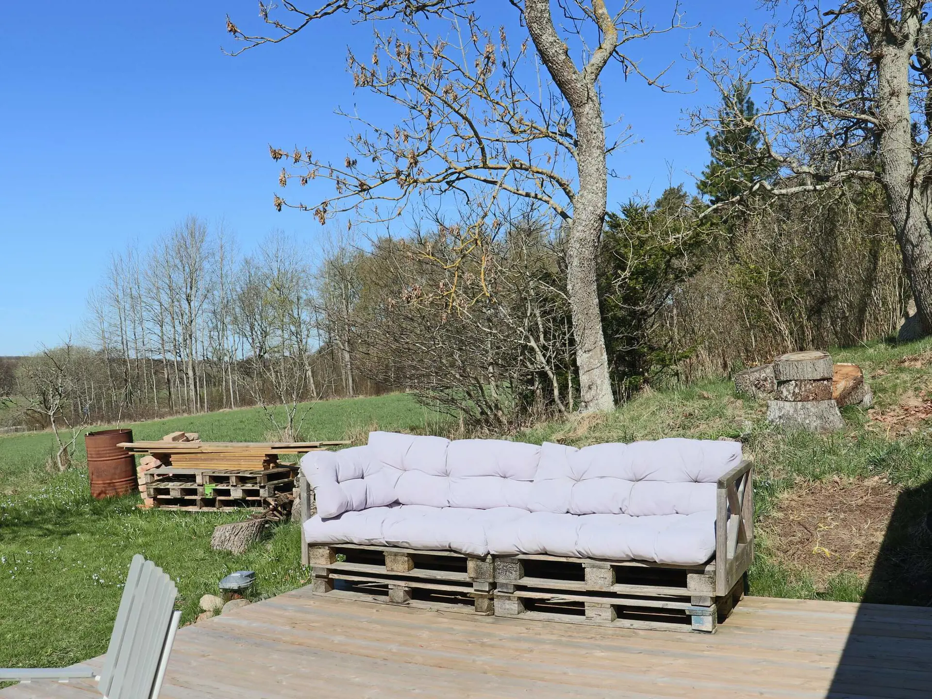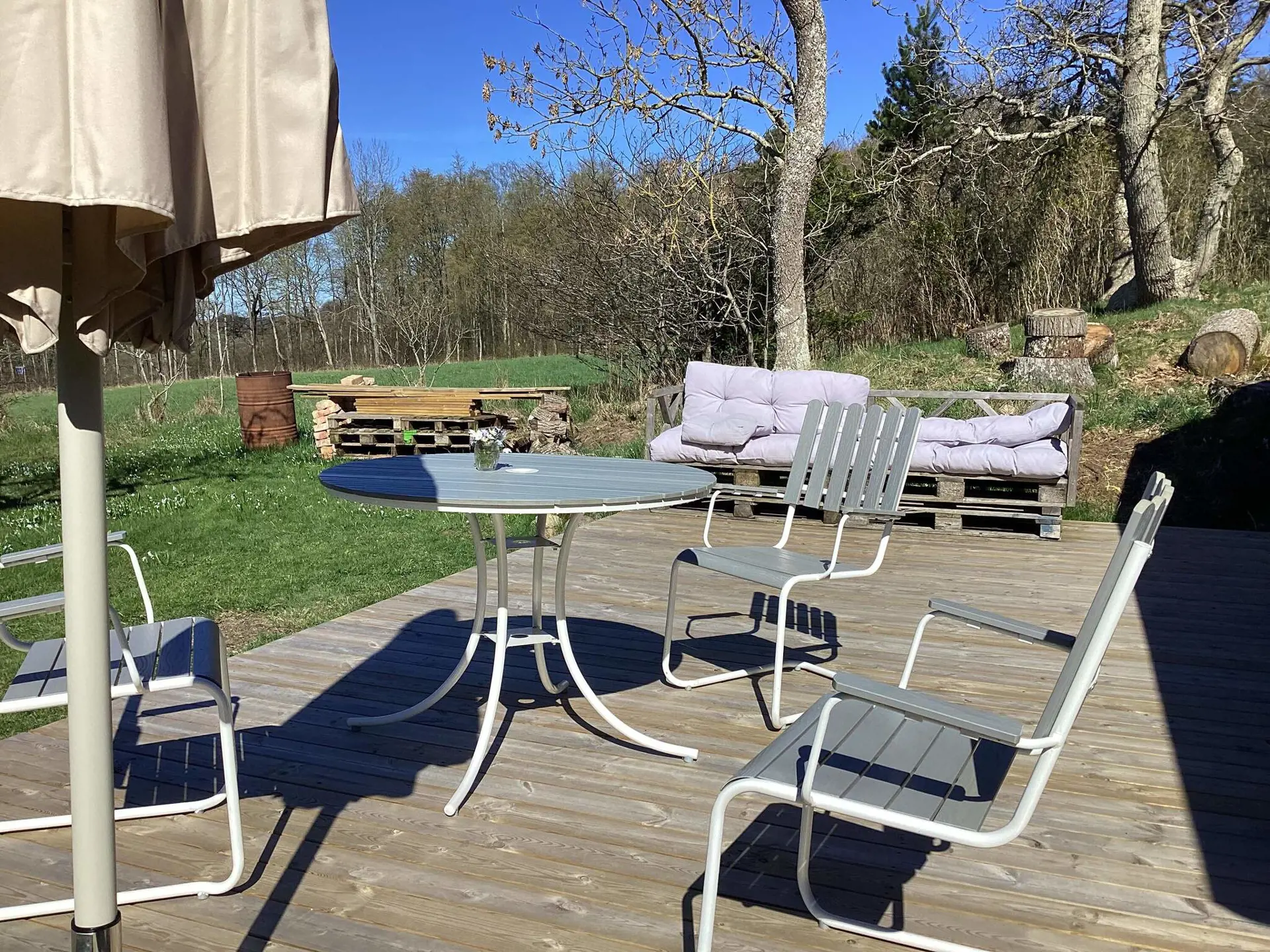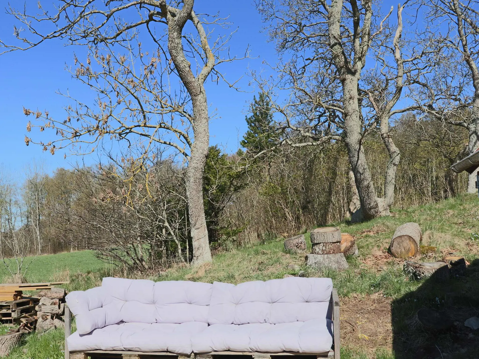 Im Erdgeschoss befindet sich ein geräumiges Wohnzimmer mit Esstisch, Schlafcouch für zwei Personen und Fernseher. Die Küche ist bestens ausgestattet. Ein Schlafzimmer unten verfügt über ein Doppelbett, das andere über ein Tagesbett für zwei Personen. Außerdem gibt es ein WC und ein Duschbad. Im Obergeschoss befindet sich ein weiteres Schlafzimmer mit Doppelbett. Das idyllische Grundstück bietet einen fantastischen Blick auf die sanft hügelige Landschaft und grenzt an einen üppigen Laubwald. Genießen Sie die Aussicht und die Sonne auf der großzügigen Terrasse. Folgen Sie dem kleinen Schotterweg hinauf zum Bergrücken – dort erwarten Sie schöne Wander- und Radwege inmitten einer bezaubernden Natur.