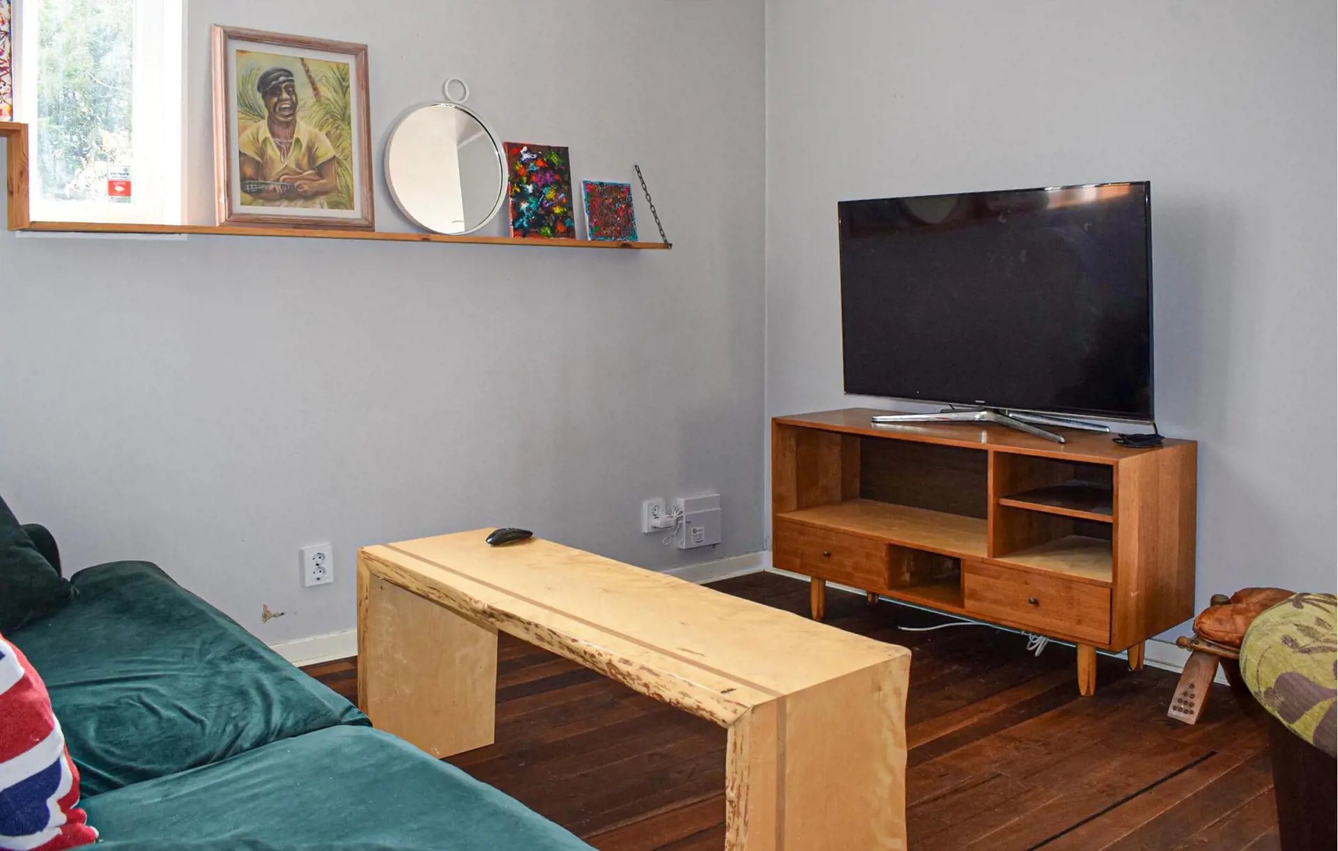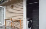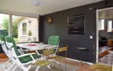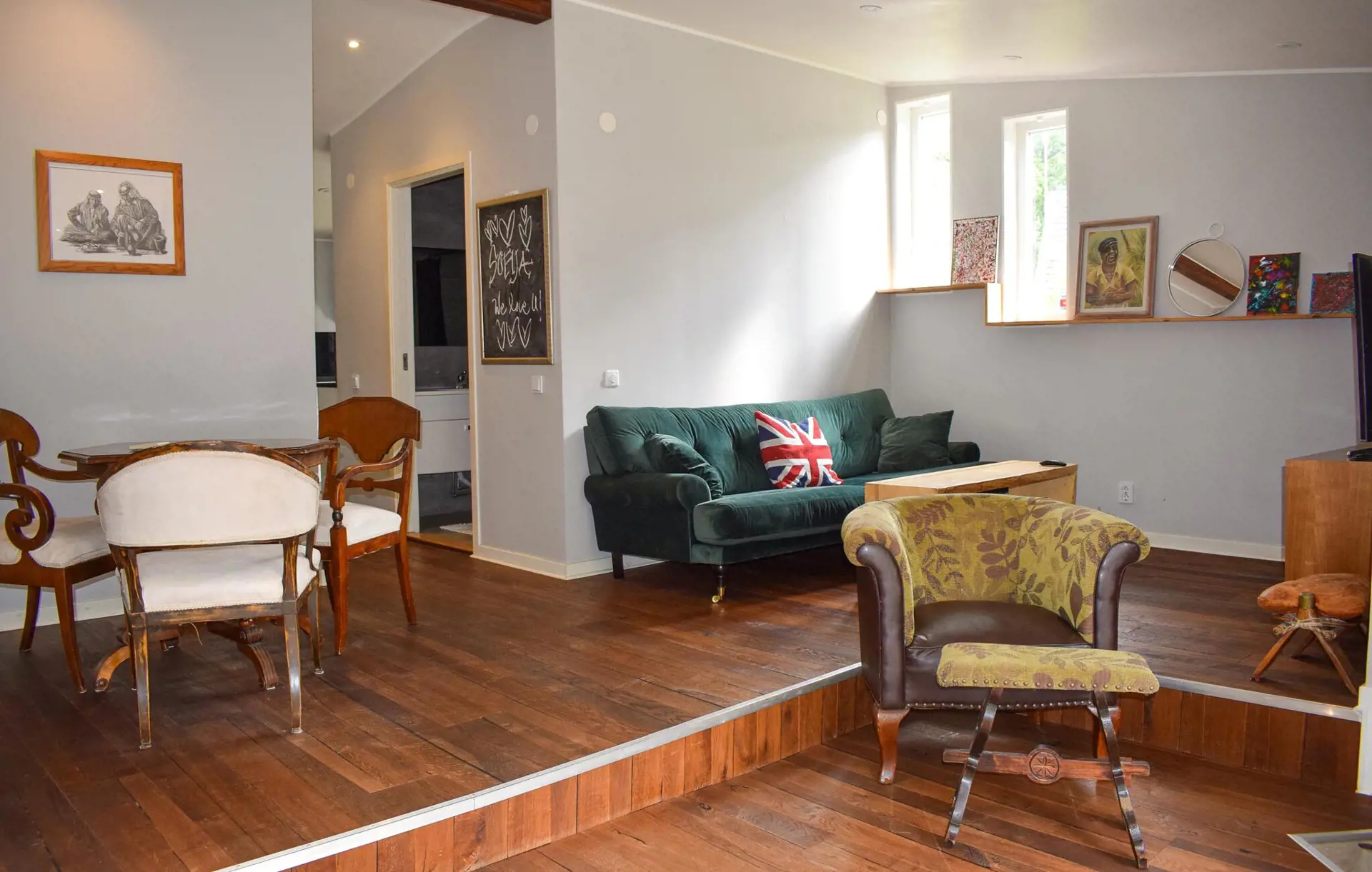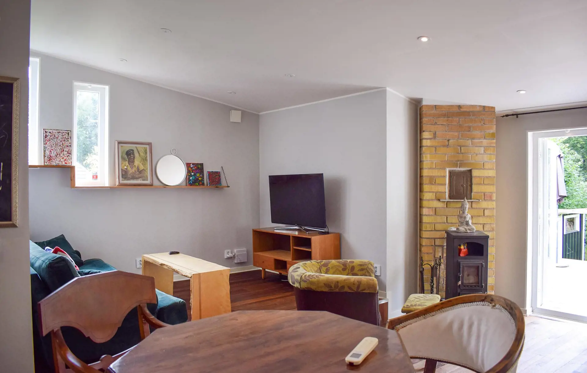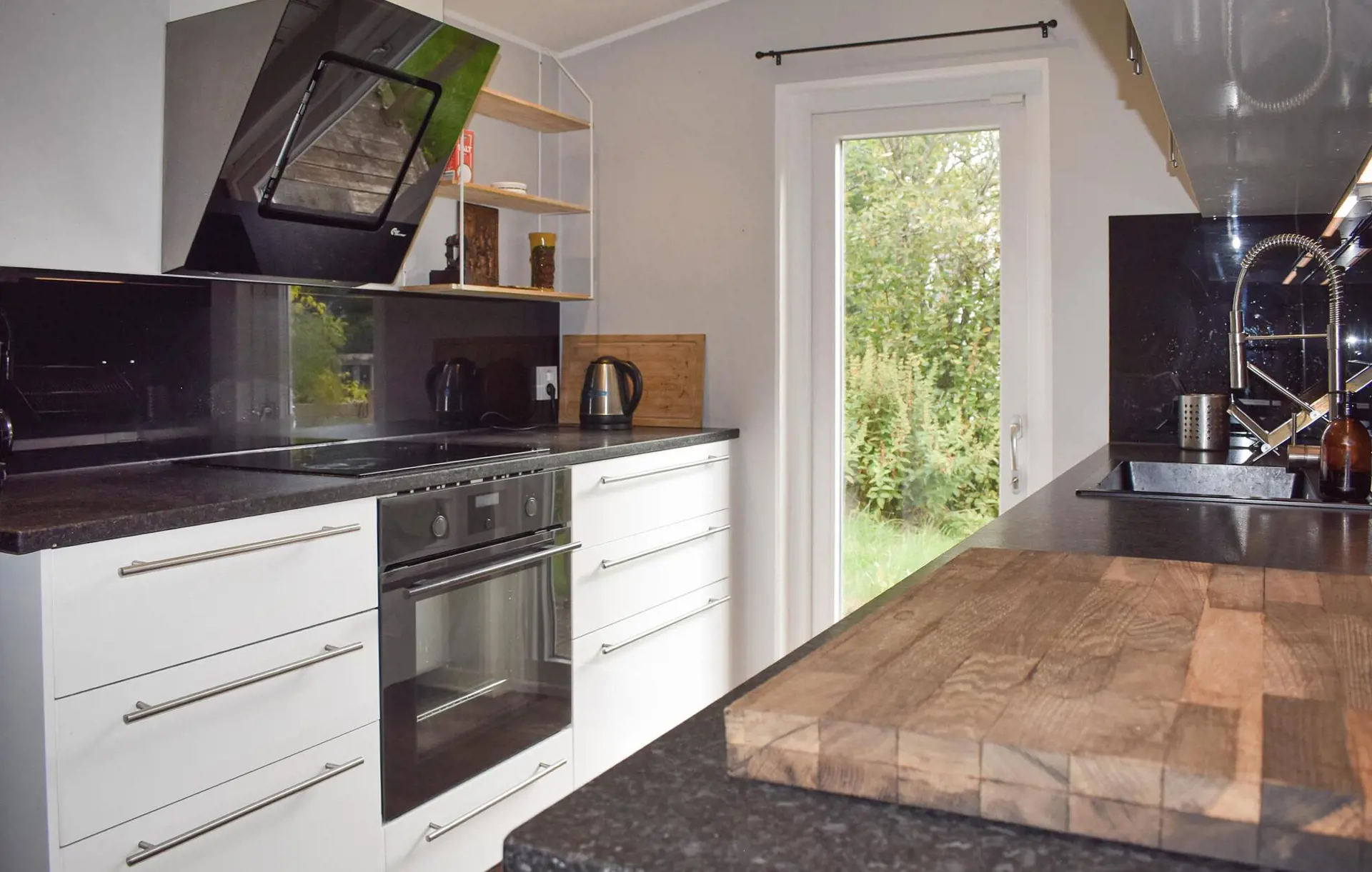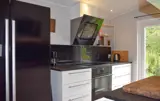 Dieses einladende Haus ist wie geschaffen für eine erholsame Auszeit vom Alltag. Große Fenster lassen viel warmes Tageslicht ins Innere, während Sie einen schönen Blick ins Grüne genießen. Zusätzlich schaffen eine warme Holzoptik, elegantes Mobiliar und ein gemütliches Sofa ein Ambiente, in dem Sie sich entspannt zurücklehnen können. Egal ob Sie einen Podcast streamen oder gemeinsam kochen, hier tanken Sie schnell neue Energie.