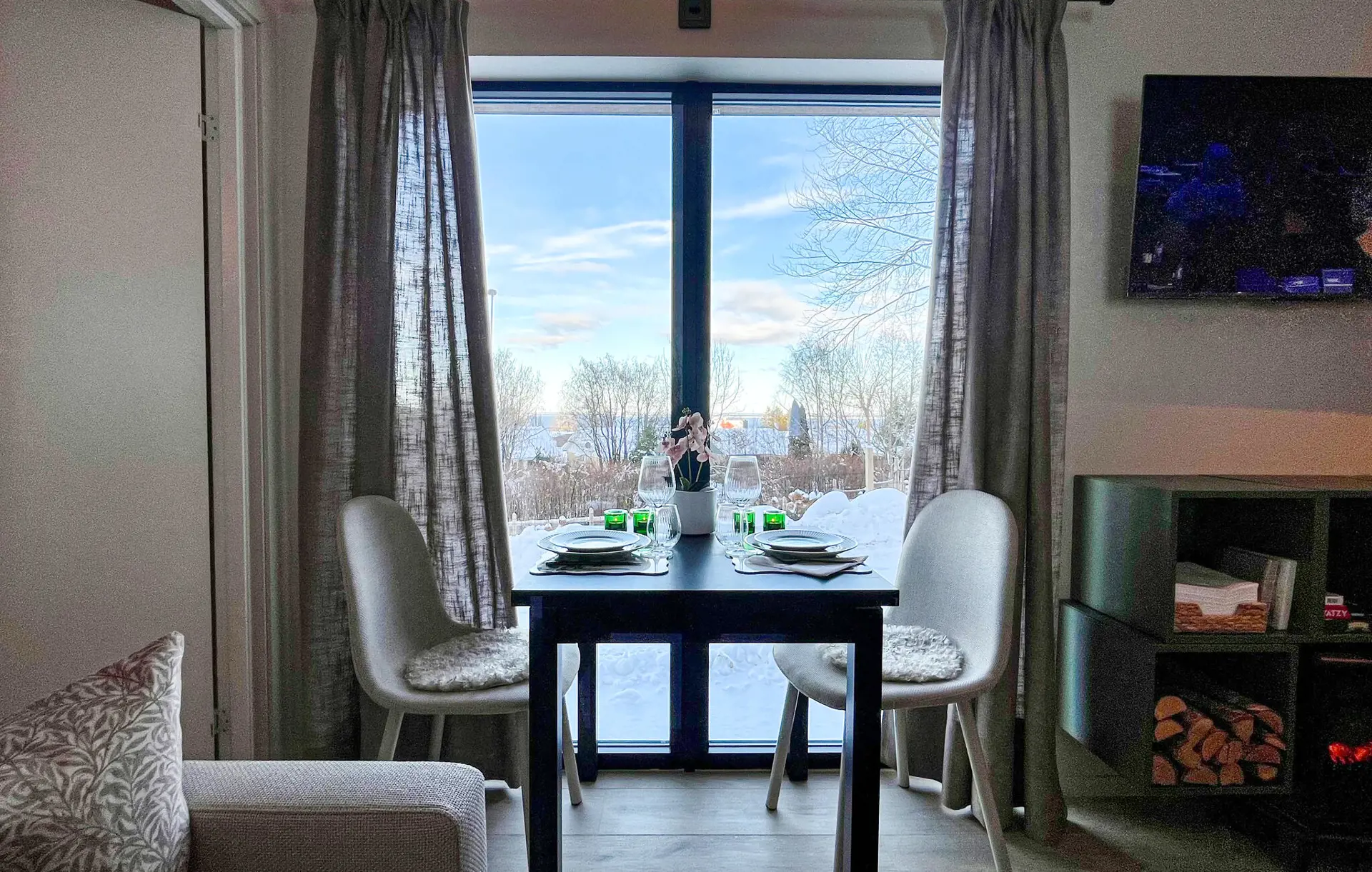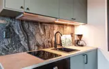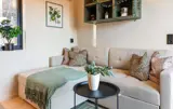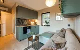Dieses Haus empfängt Sie mit einem einladenden Ambiente. Warme Farben, eine bequeme Sofalandschaft und eine kleine Küche schaffen eine Atmosphäre, in der Sie schnell vom Alltag abschalten können. Genießen Sie einen Blick ins Grüne durch die bodentiefen Fenster, lehnen Sie sich bei einem duftenden Kaffee zurück oder bereiten Sie gemeinsam frische Mahlzeiten zu.