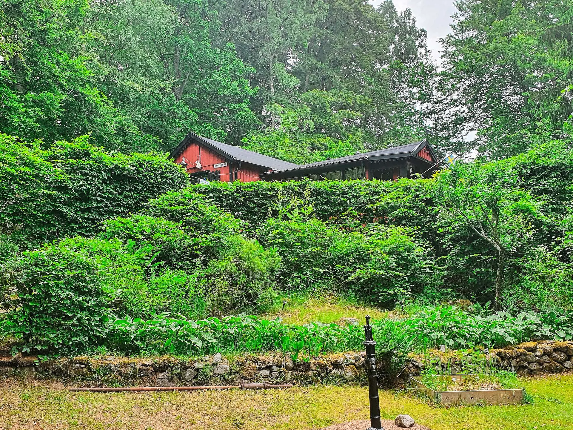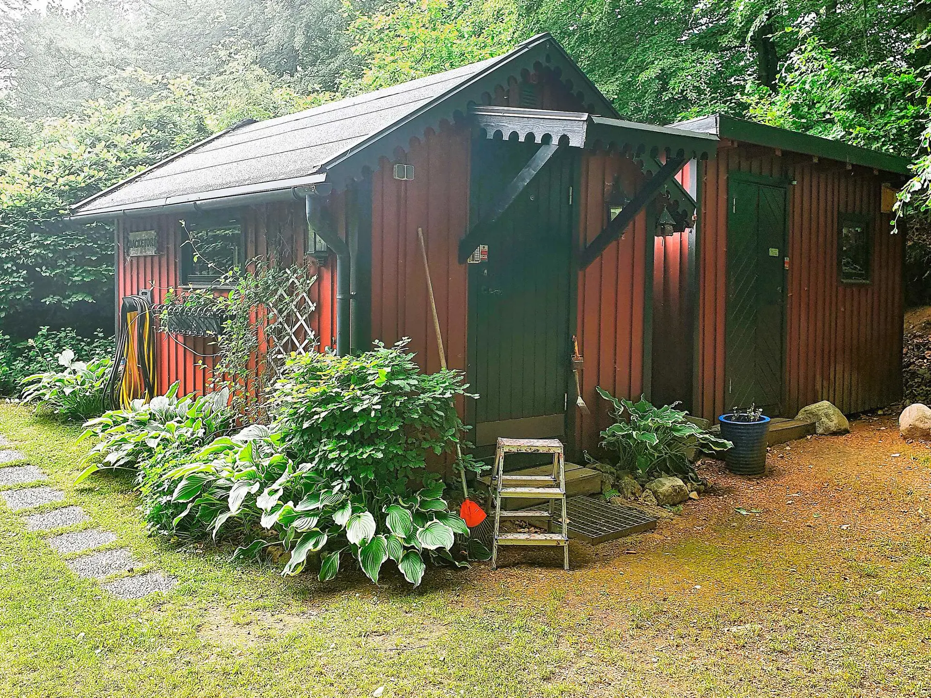Das Ferienhaus befindet sich auf einem hügeligen Grundstück mit guten Parkmöglichkeiten und liegt zusammen mit mehreren anderen kleinen Gebäuden, die zum Ferienhaus gehören, wie z.B. Annex, Schuppen etc.
