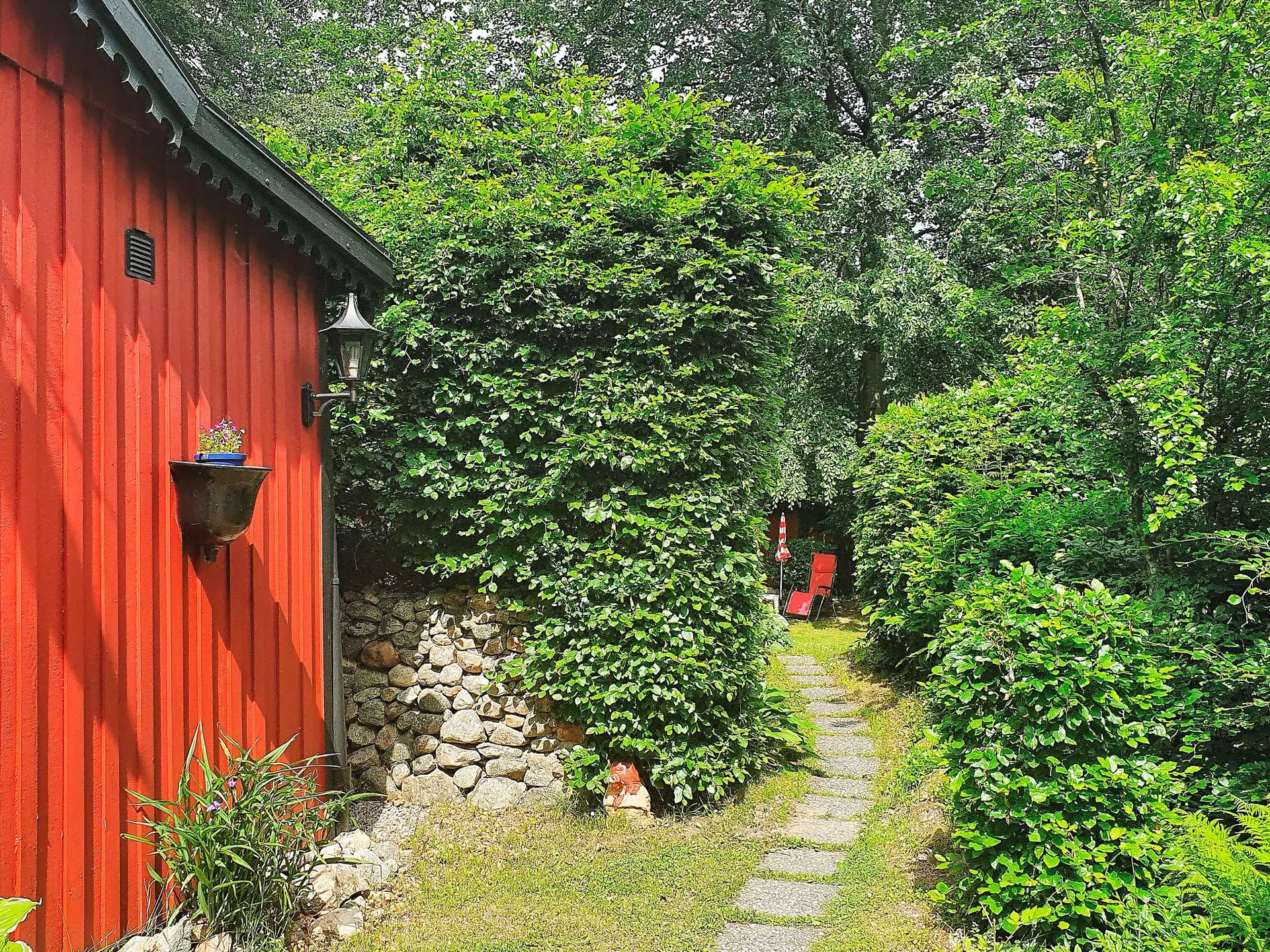 Im Annex nebenan auf dem Grundstück befindet sich ein weiteres, einfacheres Schlafzimmer mit zwei Betten und angrenzendem Abstellraum. Draußen gibt es eine Terrasse mit bequemen Gartenmöbeln und Hängematte. Die etwas abgeschirmtere Lage des Annexes bietet Platz für Sonnenbäder in den Liegestühlen. Im Sommer gibt es rund um das gesamte Naturgrundstück viele üppige Blumenbeete, Sträucher und Büsche. Eine passende Unterkunft für eine kleine Familie oder ein Paar, das eine der schönsten und friedlichsten Umgebungen von Skåne genießen möchte!