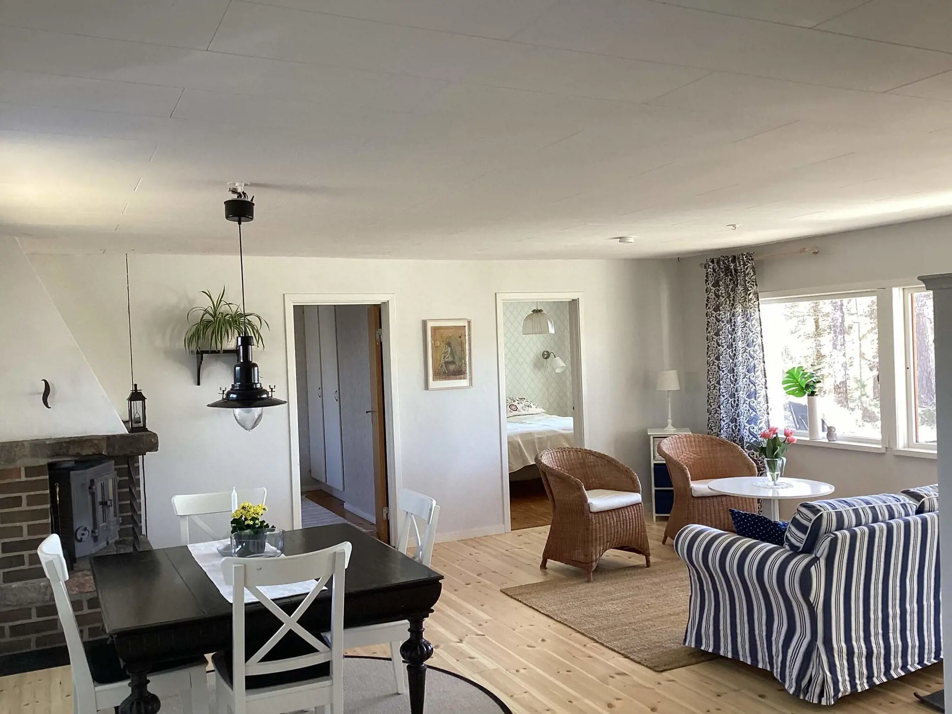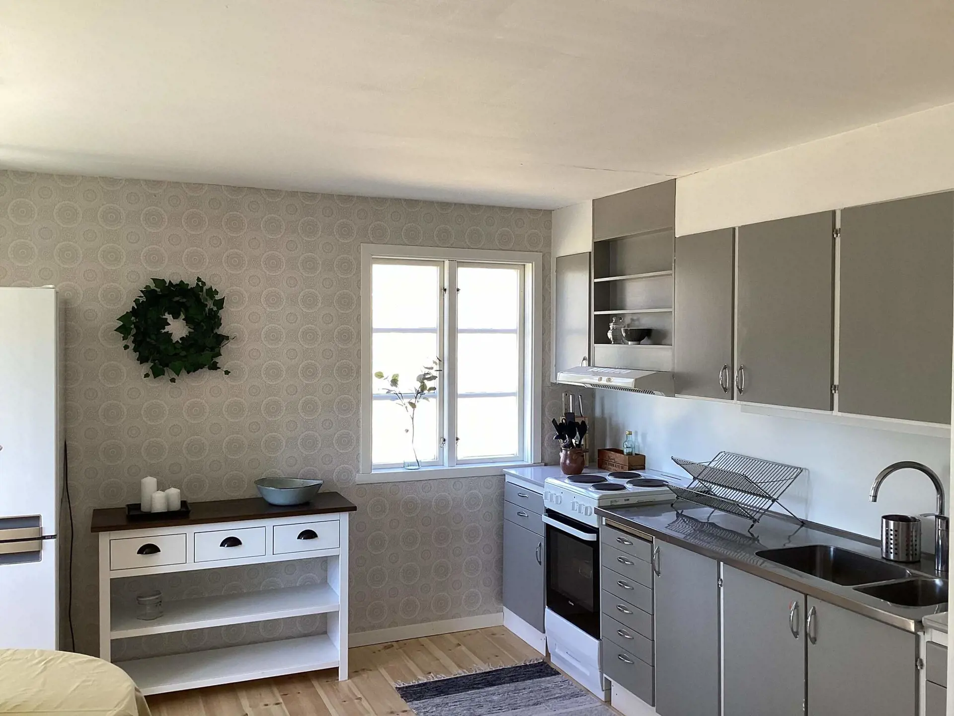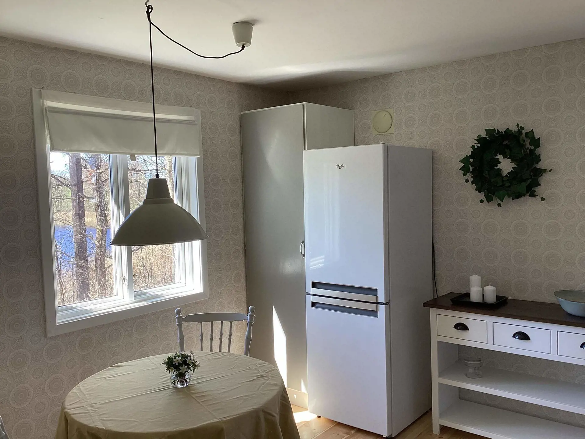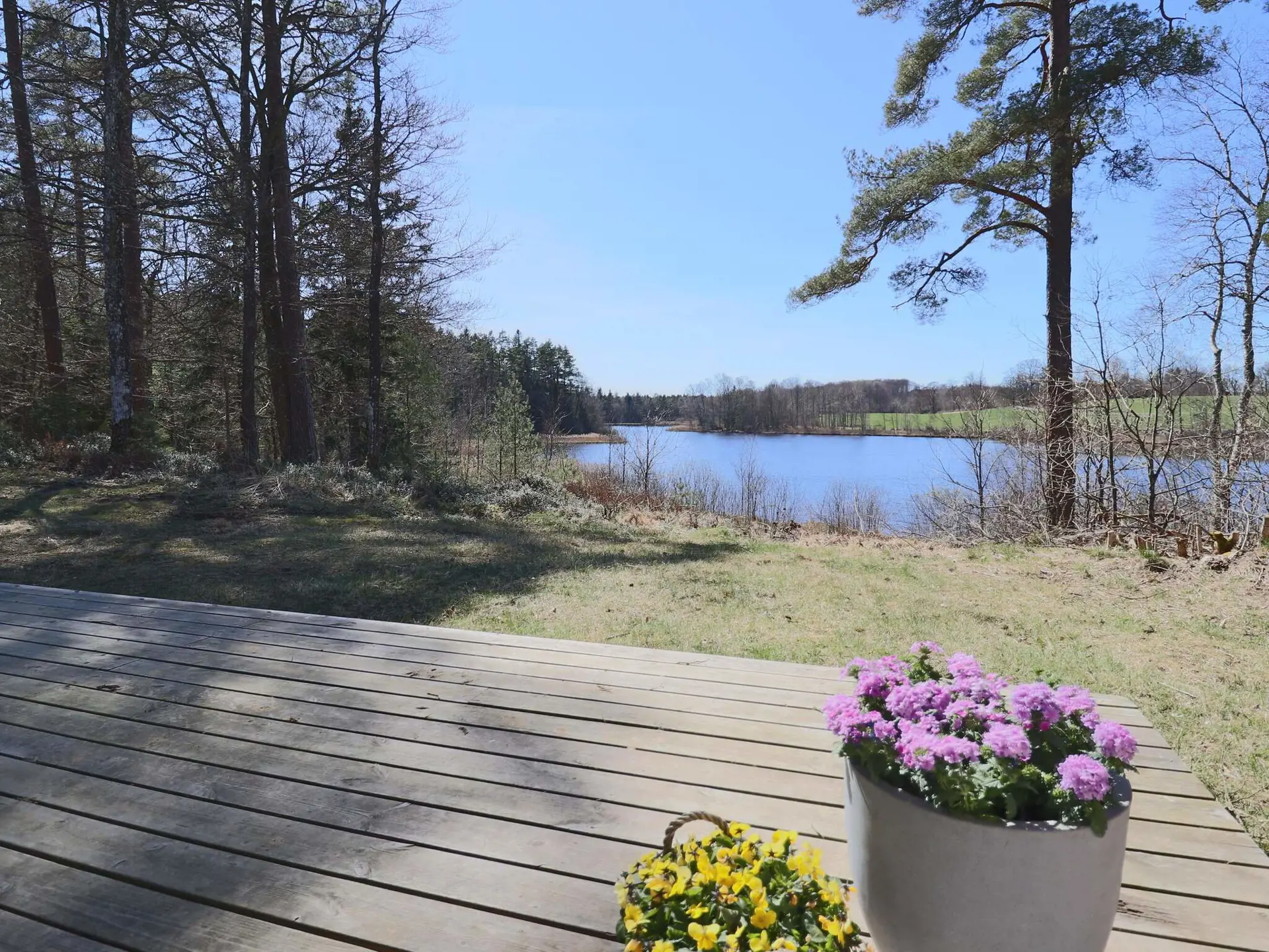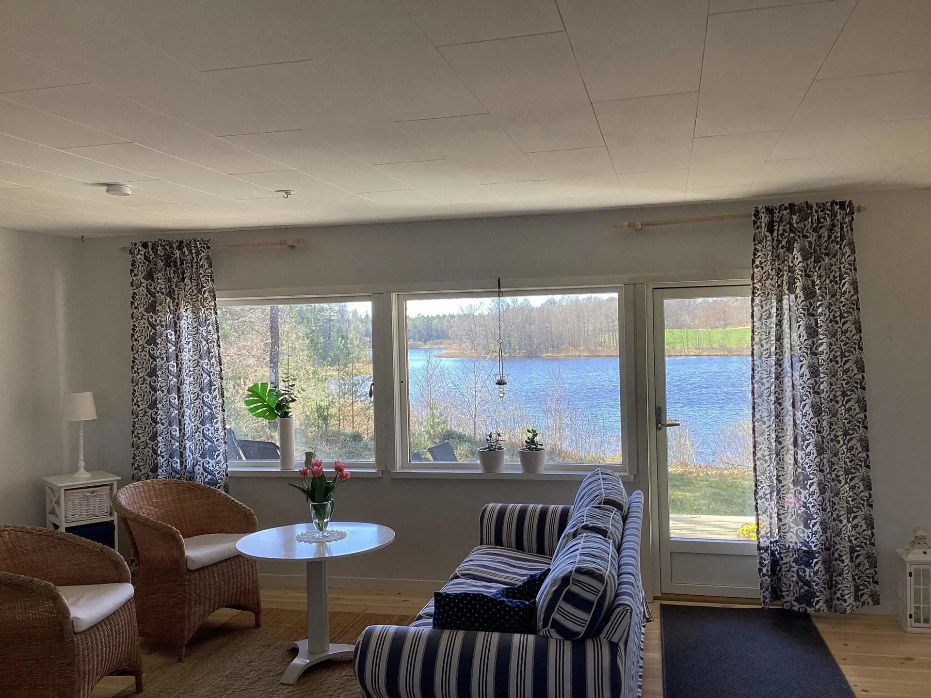 Das Ferienhaus verfügt über einen offenen Wohn- und Küchenbereich. Die Küche ist gut ausgestattet und bietet einen kleinen Essbereich. Im Wohnzimmer finden Sie einen großen Esstisch, bequeme Sitzgelegenheiten und große Fenster mit Seeblick. Ein Fernseher und ein Kaminofen sorgen für Gemütlichkeit. Ein Schlafzimmer ist mit einem Doppelbett, das andere mit zwei Einzelbetten ausgestattet. Das Badezimmer verfügt über Dusche und Waschmaschine. Vom Wohnzimmer aus gelangen Sie auf eine teilweise überdachte Terrasse mit Sonnenliegen, Gartenmöbeln und Grill. Genießen Sie die Ruhe!