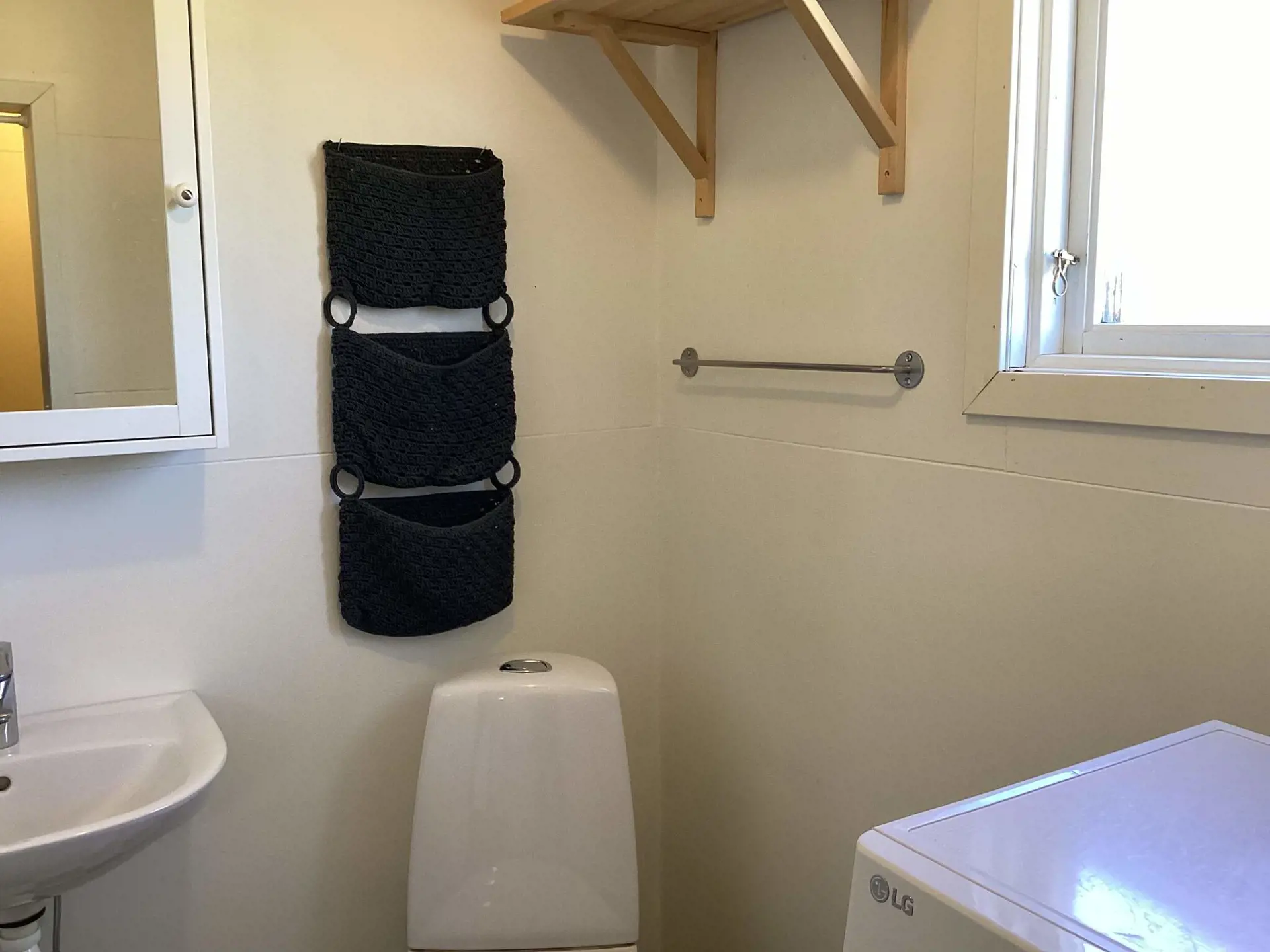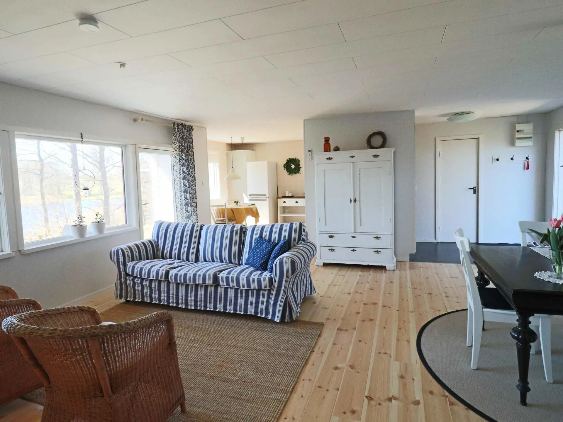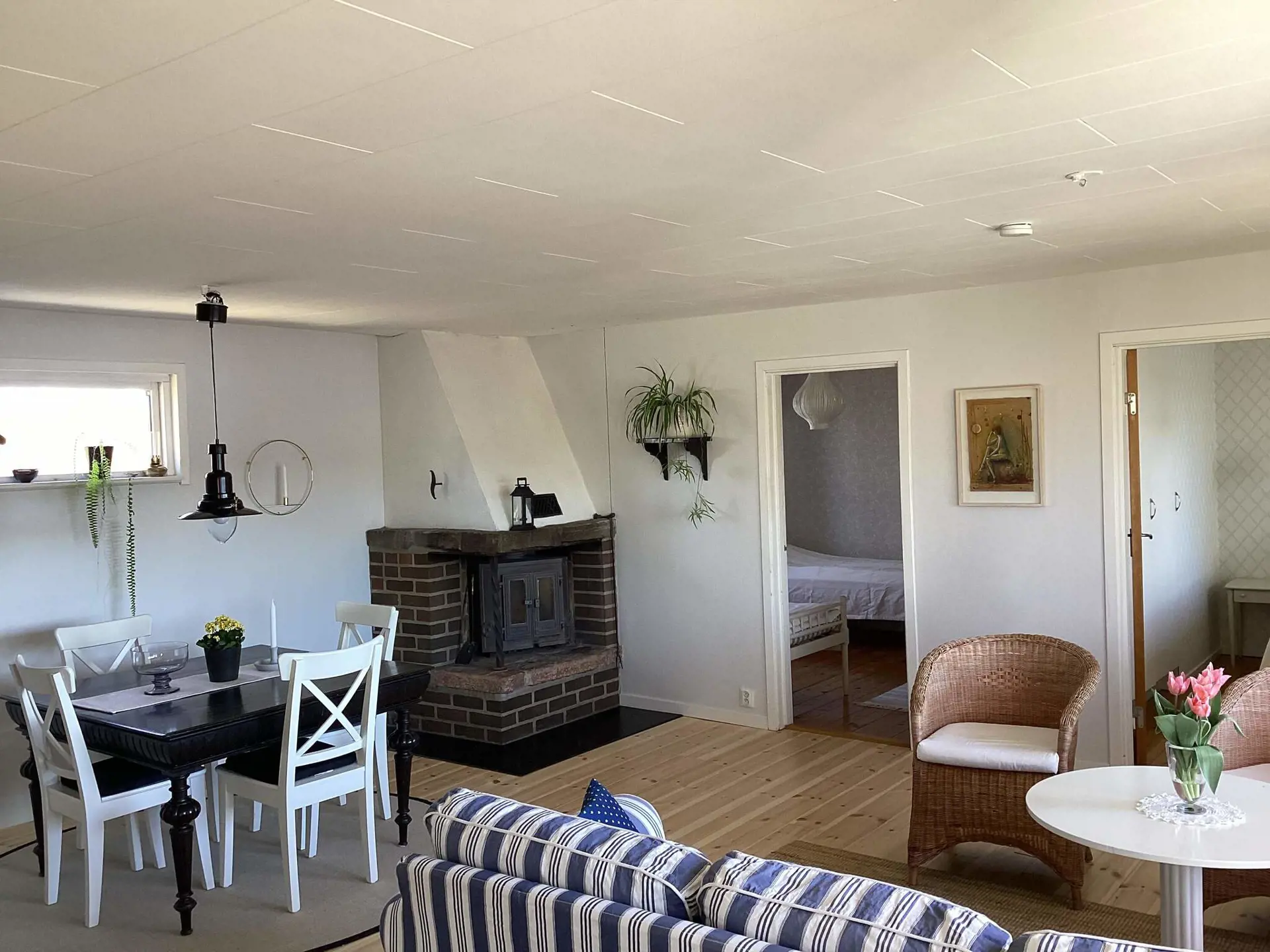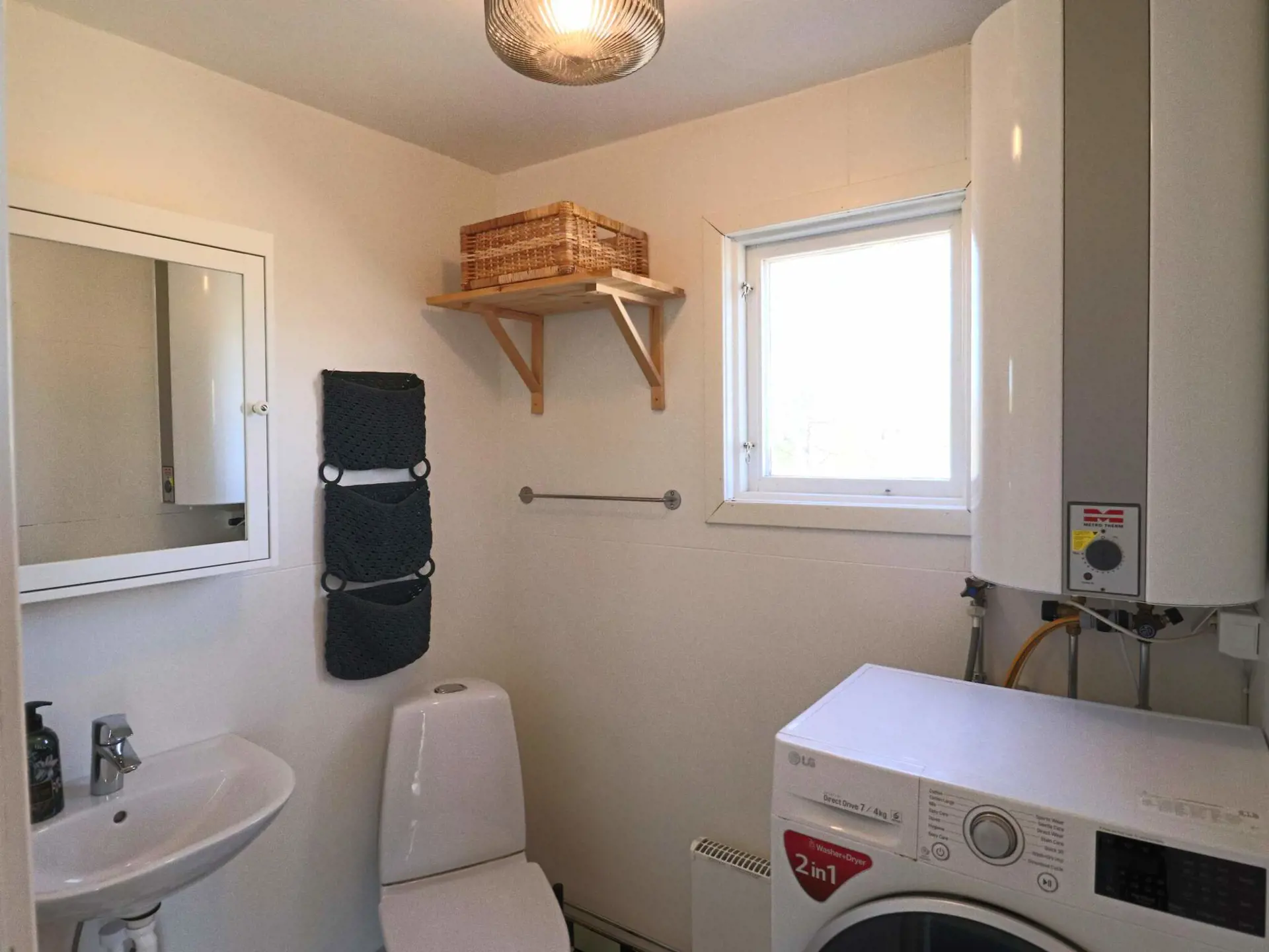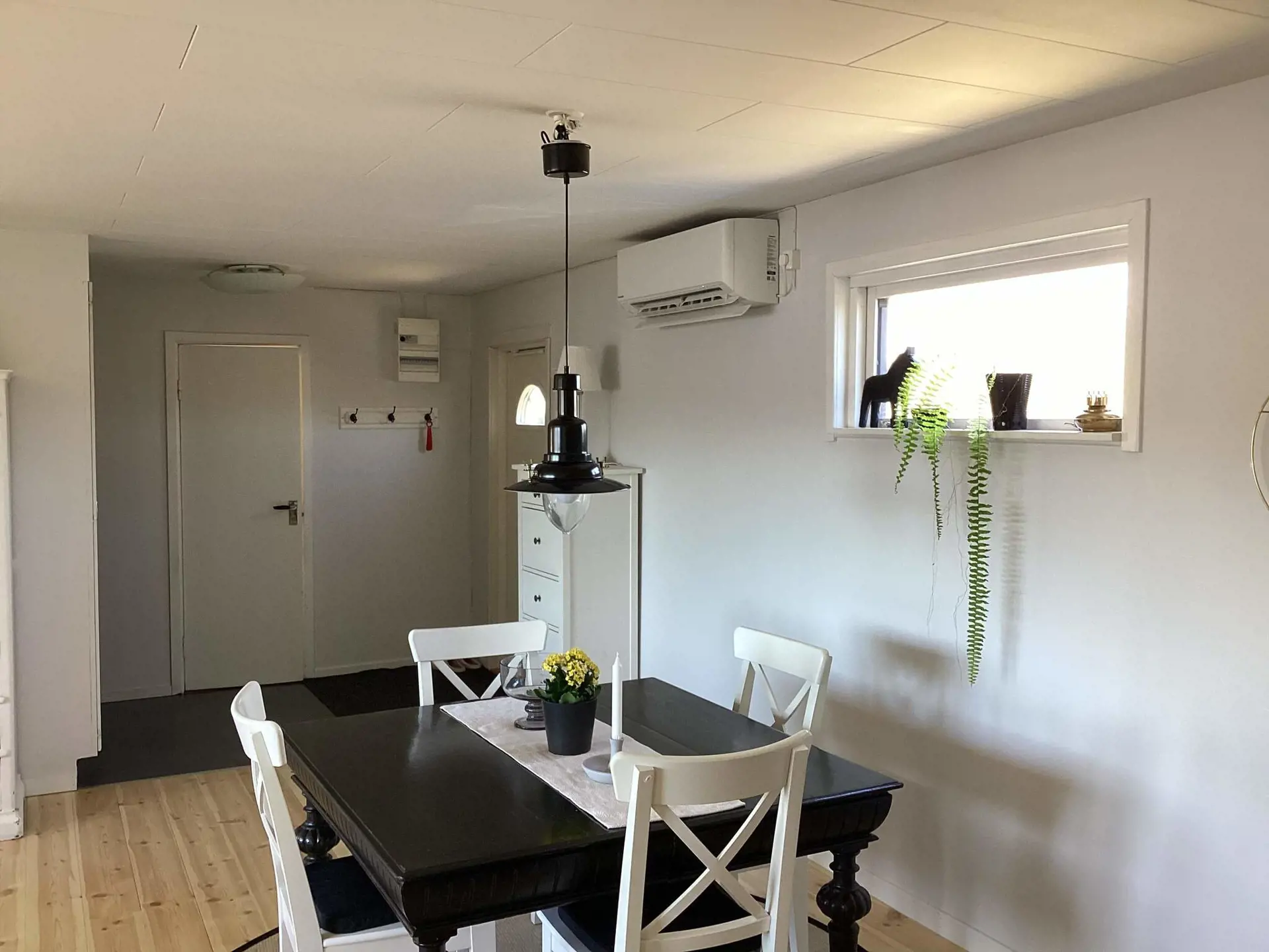 Das Ferienhaus verfügt über einen offenen Wohn- und Küchenbereich. Die Küche ist gut ausgestattet und bietet einen kleinen Essbereich. Im Wohnzimmer finden Sie einen großen Esstisch, bequeme Sitzgelegenheiten und große Fenster mit Seeblick. Ein Fernseher und ein Kaminofen sorgen für Gemütlichkeit. Ein Schlafzimmer ist mit einem Doppelbett, das andere mit zwei Einzelbetten ausgestattet. Das Badezimmer verfügt über Dusche und Waschmaschine. Vom Wohnzimmer aus gelangen Sie auf eine teilweise überdachte Terrasse mit Sonnenliegen, Gartenmöbeln und Grill. Genießen Sie die Ruhe!