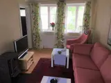 Das Wohnzimmer steht in offener Verbindung mit der Küche und ist mit einer Sofagruppe vor dem Fernseher und einem Holzofen eingerichtet. Internet steht Ihnen im Haus kostenfrei zur Verfügung.