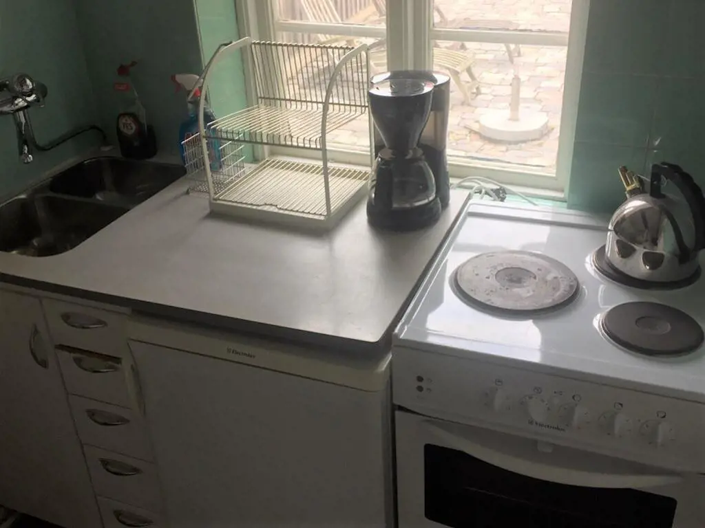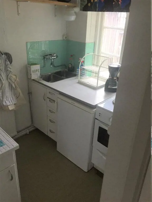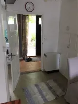 Im Erdgeschoss befindet sich eine gute kleine Küchenzeile mit ua Herd mit 3 Platten und Backofen und Kühlschrank. Die Küchenzeile ist in offener Kombination mit dem Esszimmer und der Halle, in der sich auch der Mikron und der Gefrierschrank befinden. Separates WC neben der Halle. Das Badezimmer, das sich in einem separaten Haus direkt neben dem Ferienhaus befindet, verfügt über eine Dusche, Waschmaschine und Trockner.