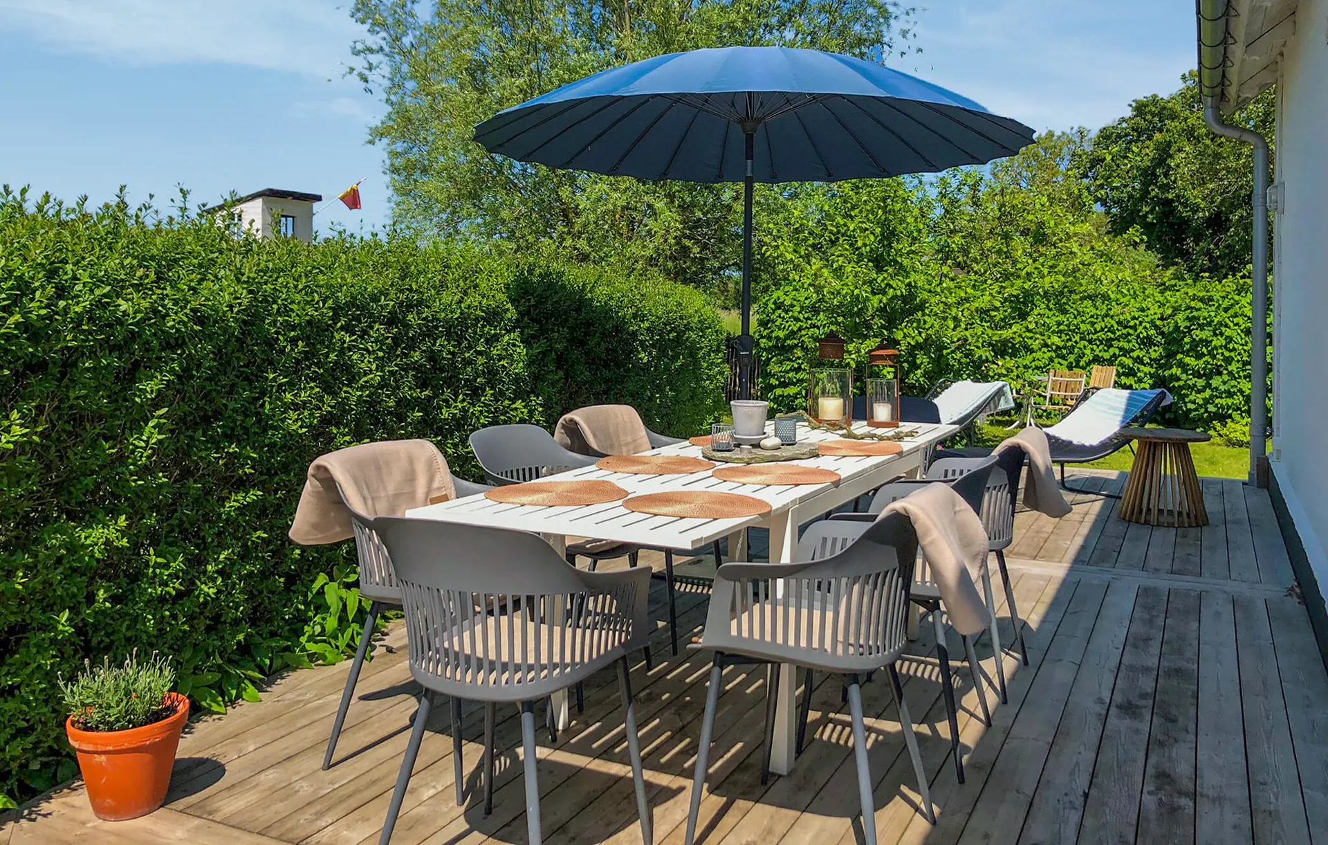 Treten Sie hinaus auf die schöne Terrasse und entspannen Sie sich inmitten der grünen Umgebung. Nehmen Sie Ihr Frühstück im Freien ein oder lassen Sie den Tag mit einem gemütlichen Grillabend ausklingen. Der gepflegte Garten bietet genügend Platz für gemeinsame Stunden in der Natur. Ihre Kinder werden sich bestimmt über das Spielhaus und die große Rasenfläche freuen.