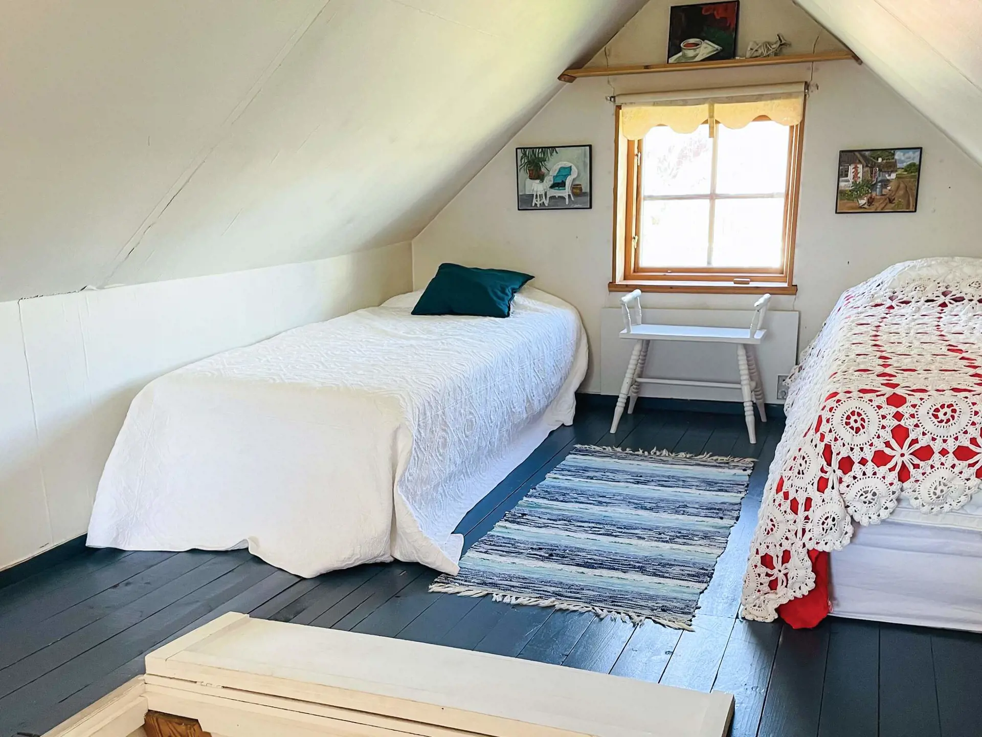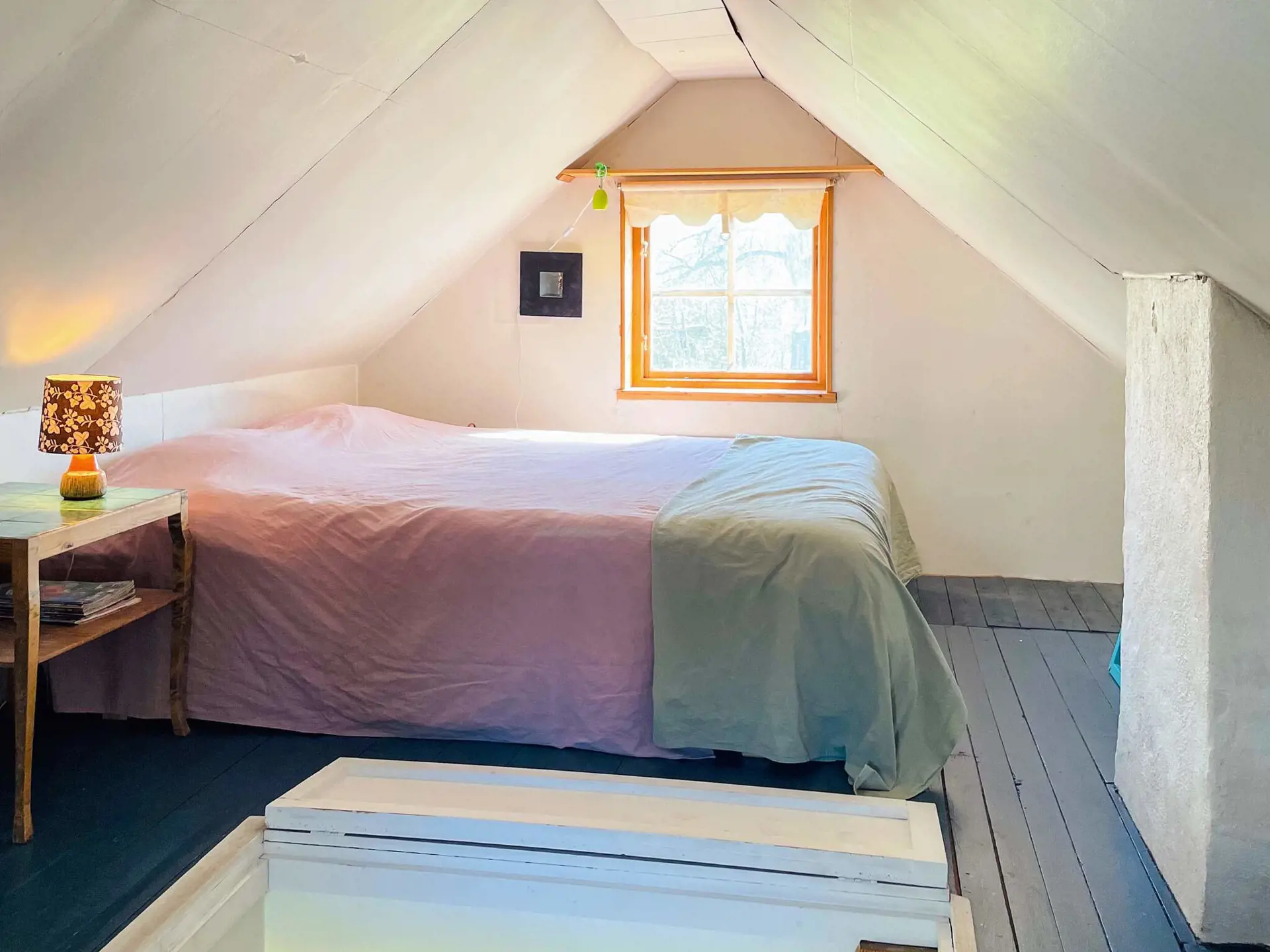 Das Häuschen bietet eine kleine, funktionale Küche zum Kochen. Angrenzend befindet sich ein Raum mit Essbereich und Zugang zu einer gemütlichen Terrasse. Ein Holzofen sorgt an kühleren Tagen für wohlige Wärme. Das geräumige Wohnzimmer ist mit einer großen Eckcouch ausgestattet und bietet viel Platz zum geselligen Beisammensein mit Musik, Brettspielen und Puzzles. Ein Smart-TV mit eigener Programmauswahl steht ebenfalls zur Verfügung. Das Schlafzimmer verfügt über ein komfortables Doppelbett und direkten Zugang zu einer weiteren möblierten Terrasse. Eine steile und schmale Treppe führt hinauf zu einem Schlafboden mit einem Doppelbett und zwei Einzelbetten. Der Schlafboden ist aufgrund der einfachen Bodenluke nur eingeschränkt zugänglich und daher nicht für kleine Kinder geeignet. Es besteht die Möglichkeit, zwei Matratzen herunterzunehmen und im geräumigen Untergeschoss ein Bett einzurichten. Decken und Kissen sind für alle sechs Betten vorhanden, Bettwäsche und Handtücher müssen jedoch selbst mitgebracht werden. Das Badezimmer ist mit einer Dusche ausgestattet.