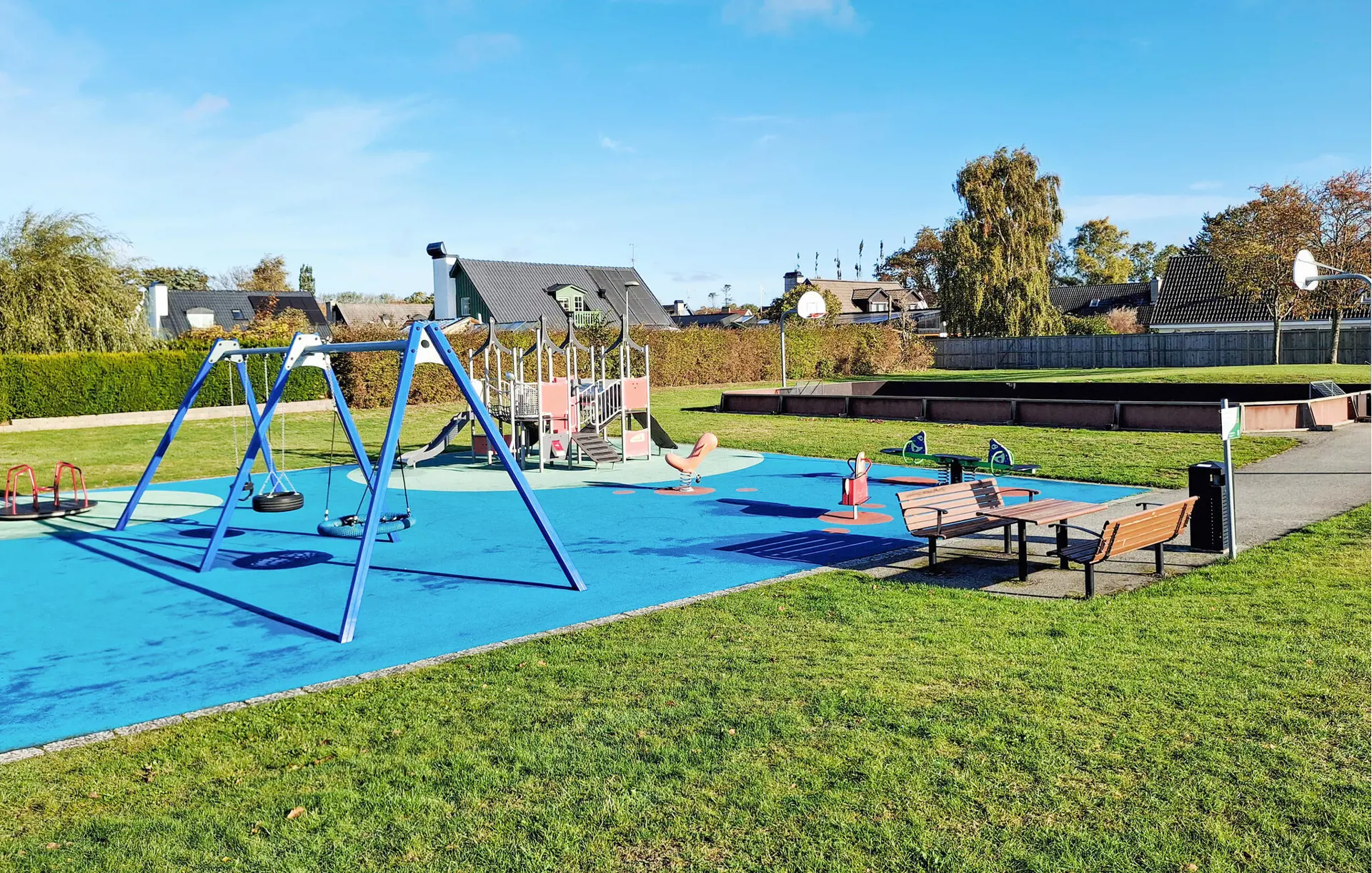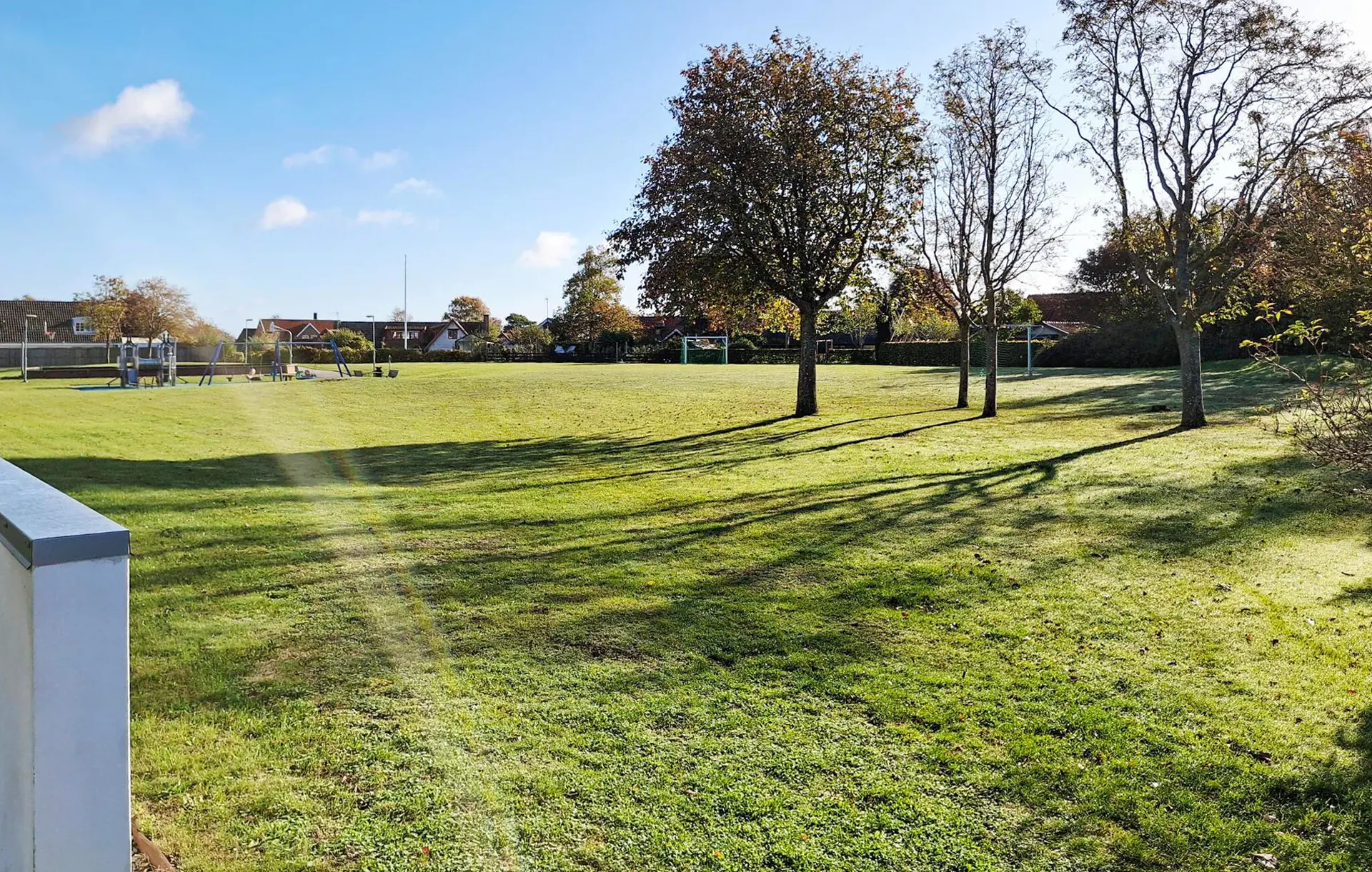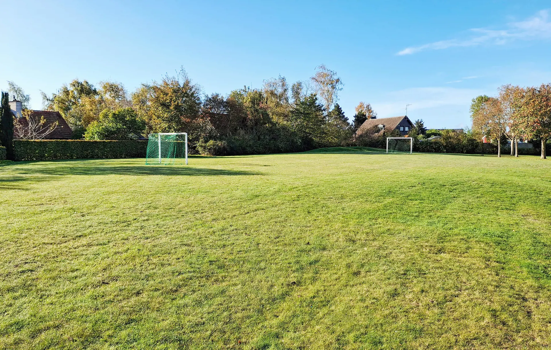 Treten Sie hinaus in den gepflegten Garten. Entspannen Sie sich auf der Terrasse mit Gartenmöbeln oder nutzen Sie die Grillmöglichkeit für gemeinsame Mahlzeiten im Freien. Genießen Sie von hier aus den Blick auf die große Rasenfläche mit Fußballfeld und Spielplatz.
