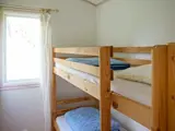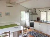 Das Ferienhaus selbst besteht aus einem hellen Küchen-/Aufenthaltsbereich mit einer ausziehbaren Schlafliege und zwei Stühlen als Sitzgelegenheit am Esstisch. Von hier hat man Zutritt zur Terrasse davor. Außerdem zwei kleinere Schlafzimmern mit jeweils einem Etagenbett, eines davon schmaler, mit nur 70 cm Breite. Die Einrichtung ist funktional und schlicht.