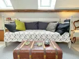 Oben im Dachgeschoss mit Zugang über eine steile Treppe finden Sie zwei weitere Schlafzimmer und einen größeren Aufenthaltsbereich. Das eine Schlafzimmer hat zwei Einzelbetten (jeweils 90 cm), das andere ein Doppelbett mit 140 cm Breite. Im Aufenthaltsbereich steht zudem ein Daybed bereit, auf dem Sie sich entspannen und vielleicht ein Buch lesen können. Die obere Ebene ist ansonsten perfekt für die Kinder.
