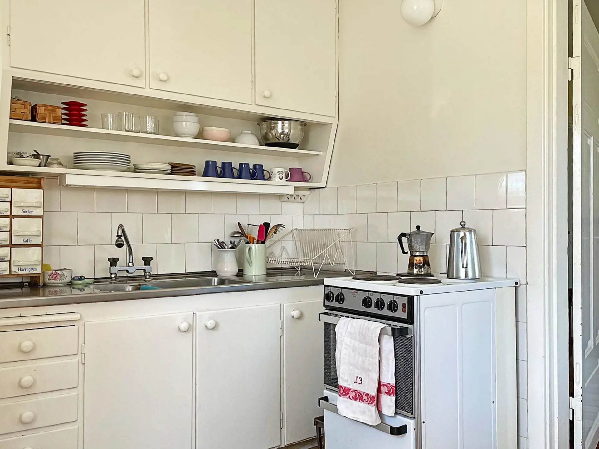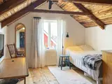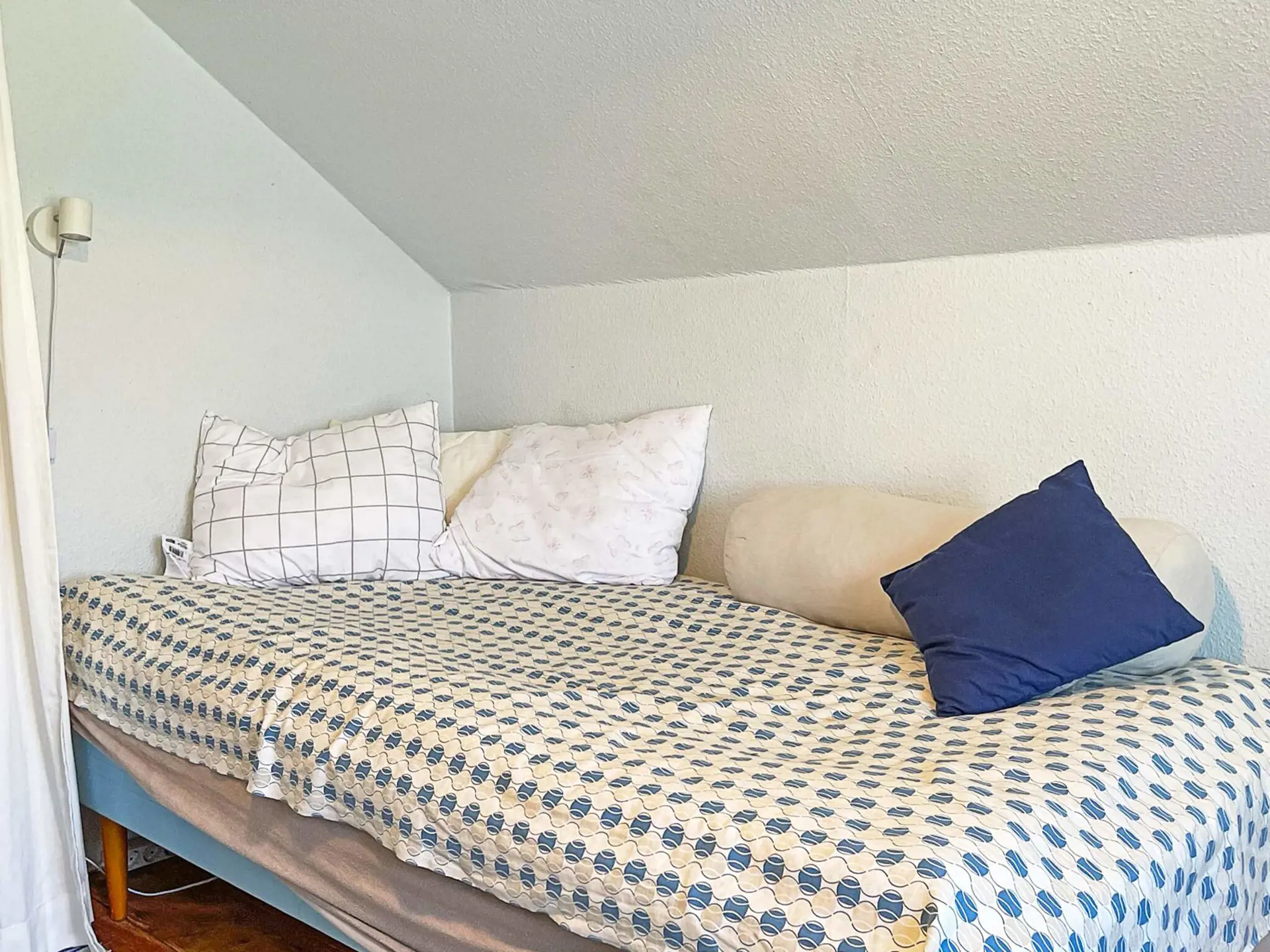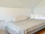 Von der Küche aus haben Sie einen Blick auf den schönen Garten. Neben der Küche befindet sich Schlafzimmer Nummer eins mit einem Doppelbett (140 cm). Für gemütliche Abende im Innenbereich gibt es außerdem ein großes Familienzimmer mit Essbereich und Sitzgruppe. Im Obergeschoss befinden sich zwei größere Schlafzimmer, eines davon mit zwei Einzelbetten. Das andere mit einem Einzelbett ist nicht isoliert, was bedeutet, dass es im Sommer heißer werden kann. Zwei wunderschöne Schlafzimmer, in denen die Kinder die Möglichkeit haben, sich ein wenig zurückzuziehen. Die Kelleretage ist nicht zugänglich bzw. privat!