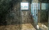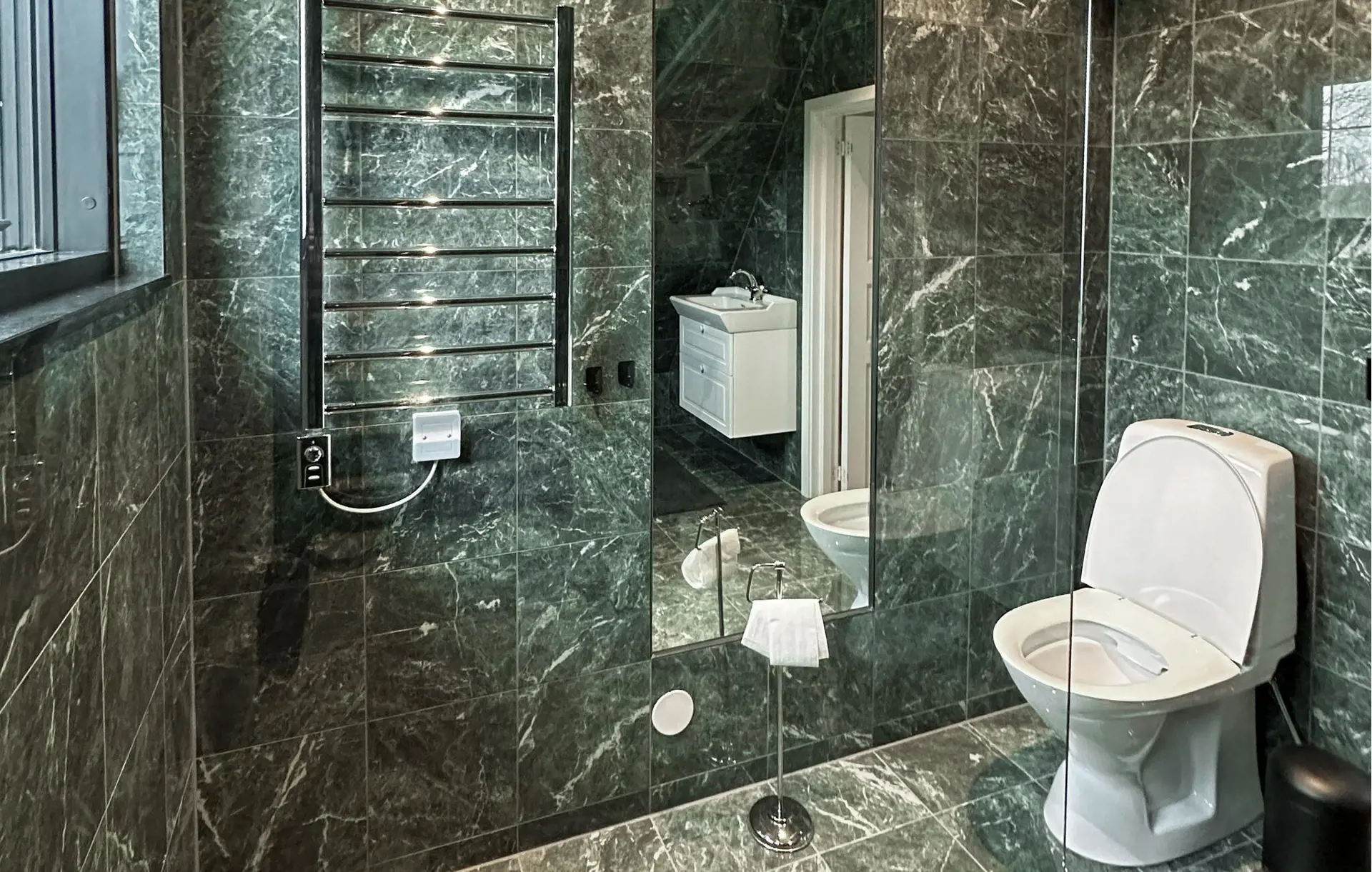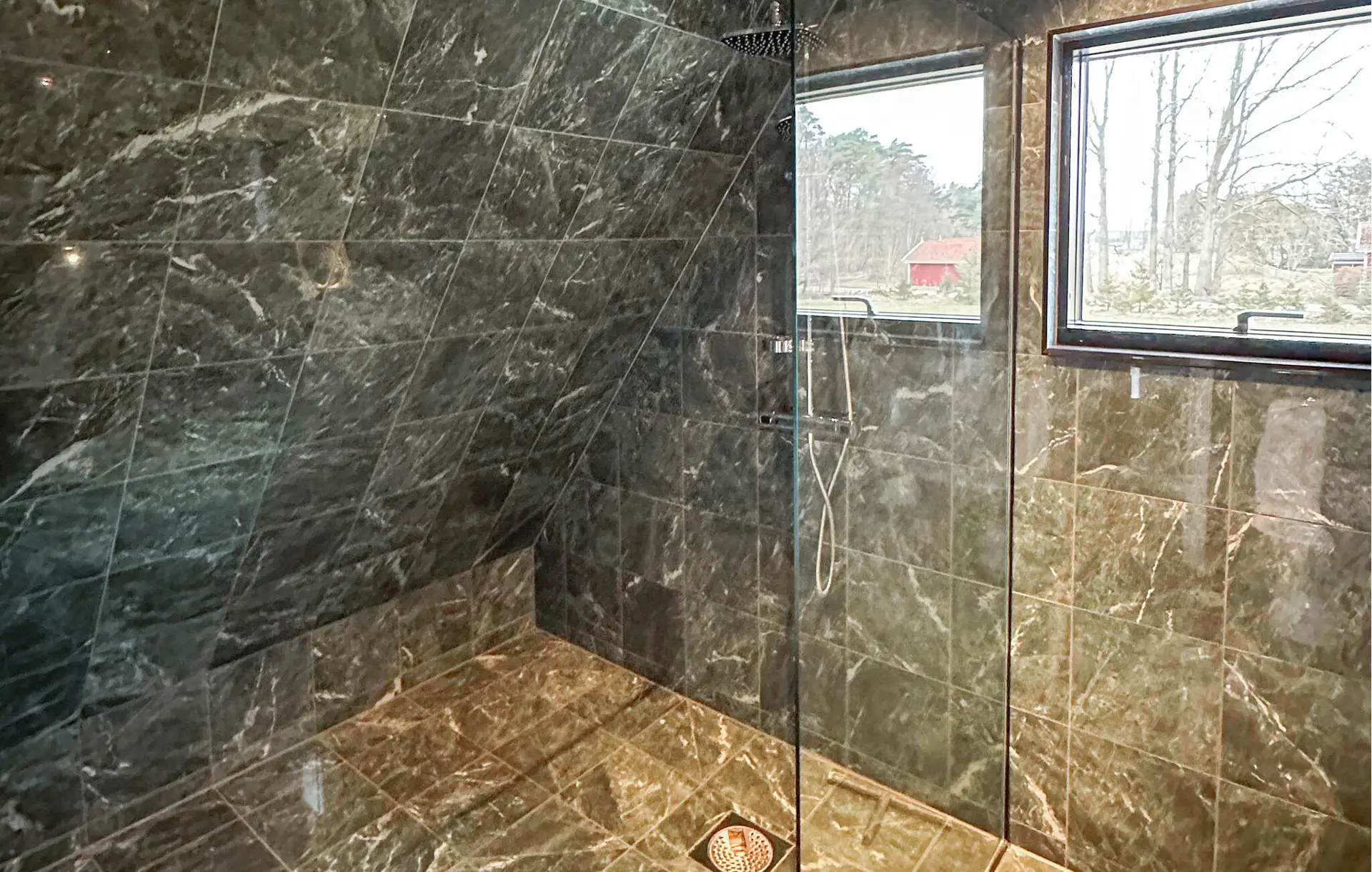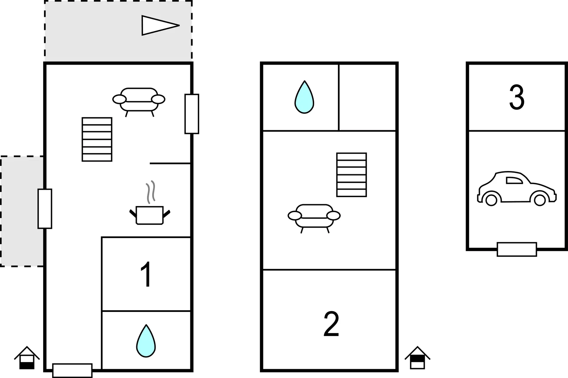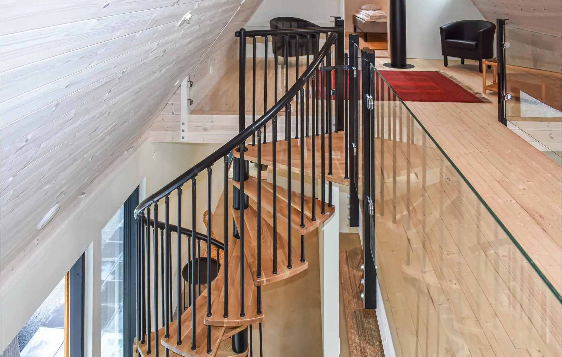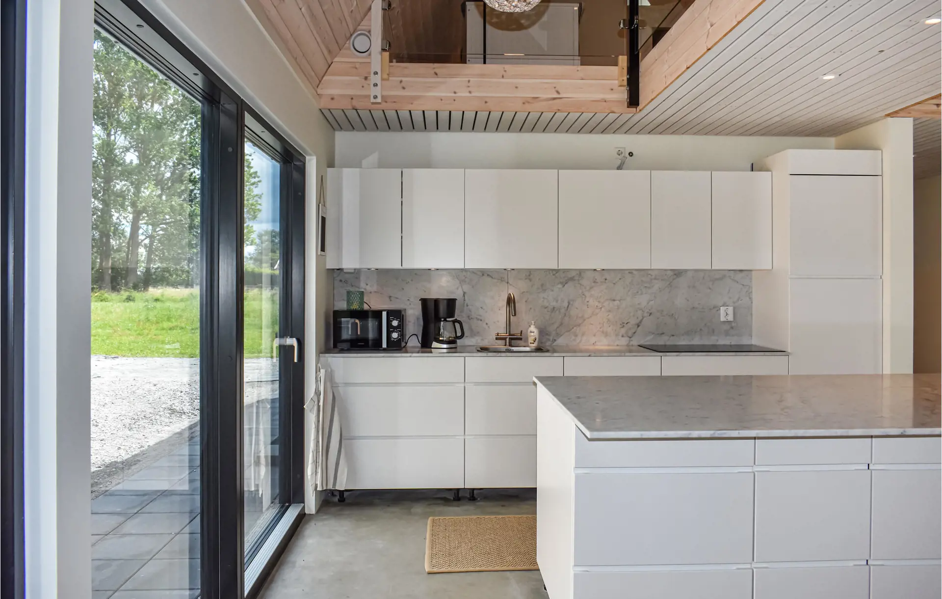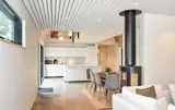 Im Hauptgebäude befinden sich drei Schlafzimmer, ein Schlafzimmer befindet sich im Nebengebäude. Die Küche und das Wohnzimmer haben einen offenen Grundriss. Große offene Glasfronten lassen viel Licht herrein.