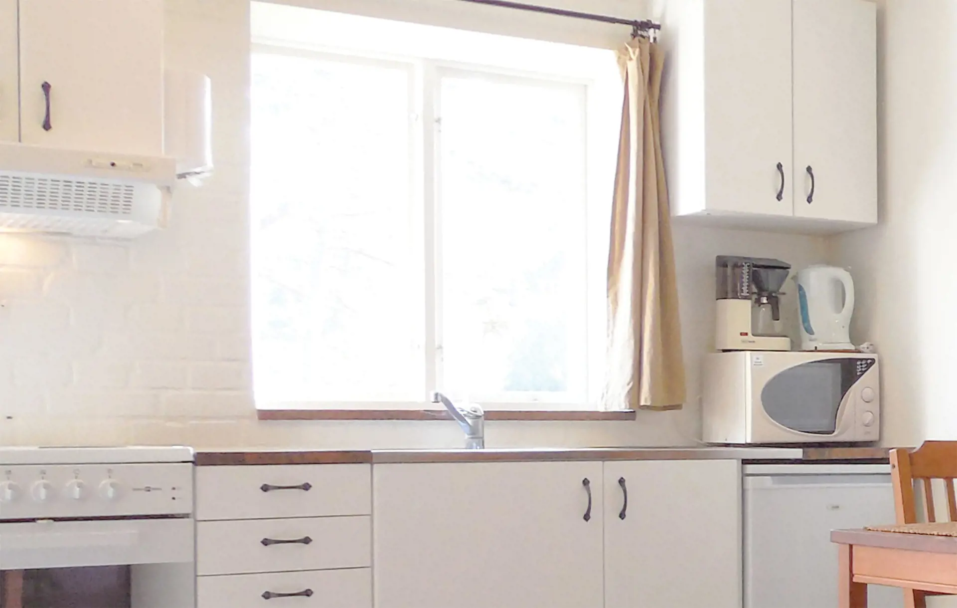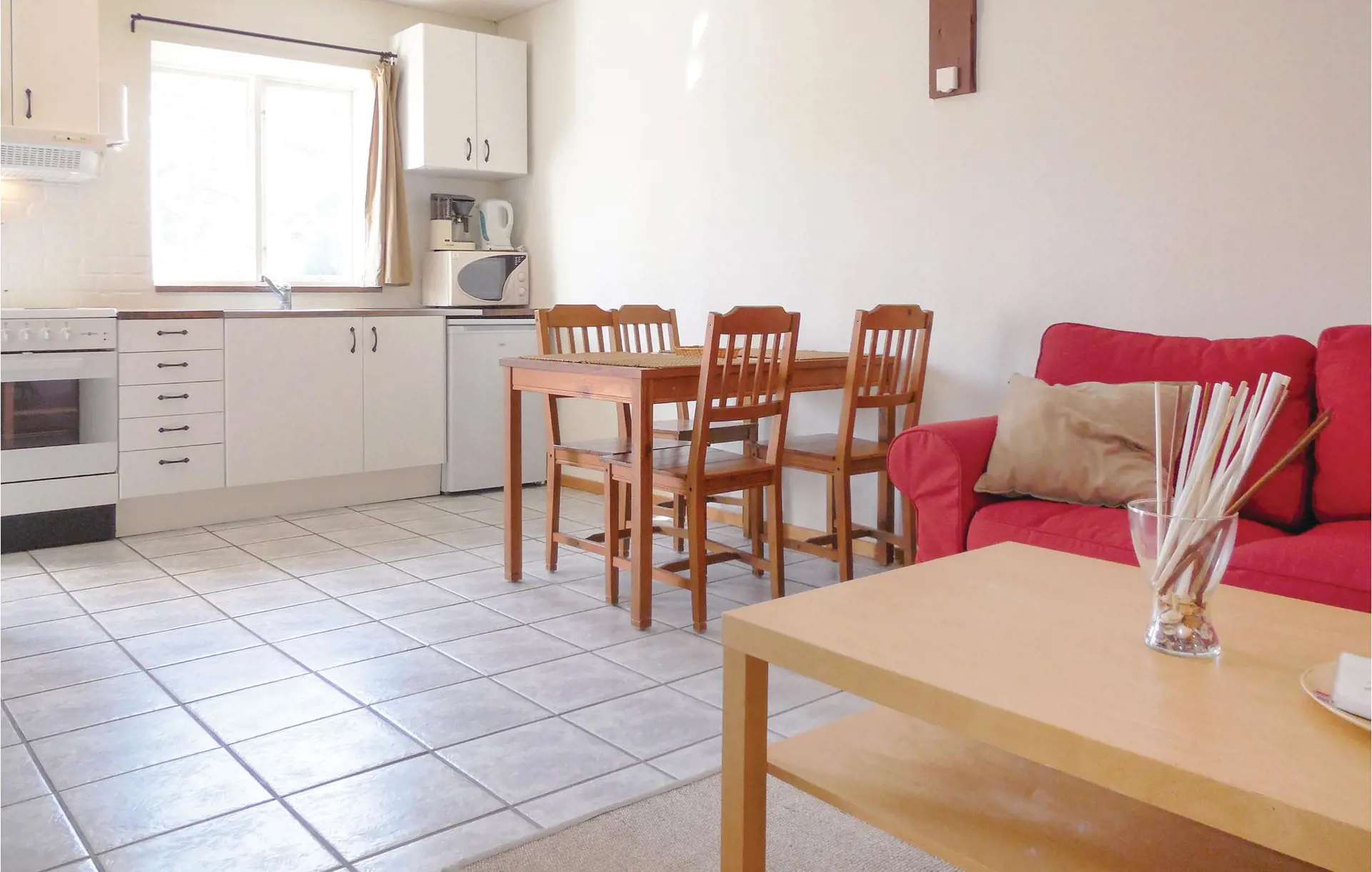 Die Schlafgelegenheiten verteilen sich auf ein Schlafzimmer und einen Schlafboden, abgeteilt durch einen Vorhang. Die Küche ist zum Wohnzimmer offen. Auf der sichtgeschützten Terrasse können Sie bequem sitzen und grillen. Der Rasen wird mit mehreren Wohnungen der Anlage Stallgården gemeinsam benutzt, der Betreiber der Anlage ist der Verein KFUM.