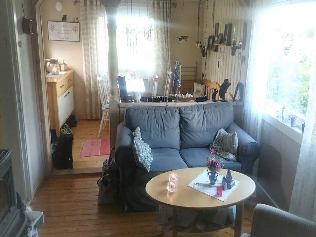Das Wohnzimmer ist mit einer gemütlichen Sitzecke und einem Holzofen ausgestattet und hat einen Fernseher mit schwedischen Kanälen. Mit dem Holzofen kann man zusätzlich Heizen oder sich bei der Stimmung, die ein solcher Ofen vermittelt, wohlfühlen.