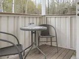 Das Ferienhaus hat einen komplette Küche mit Essbereich für vier Personen sowie ein Badezimmer mit Waschbecken, Toilette, Dusche und Waschmaschine. Vor dem Eingang befindet sich eine gemütliche, kleine Veranda mit zwei Stühlen und Tisch für den Morgenkaffee. Vor dem Ferienhaus liegt zudem eine private Terrasse mit Gartenmöbeln. Hier sitzt man ungestört und kann die auf der Wiese spielenden Kinder beaufsichtigen.