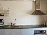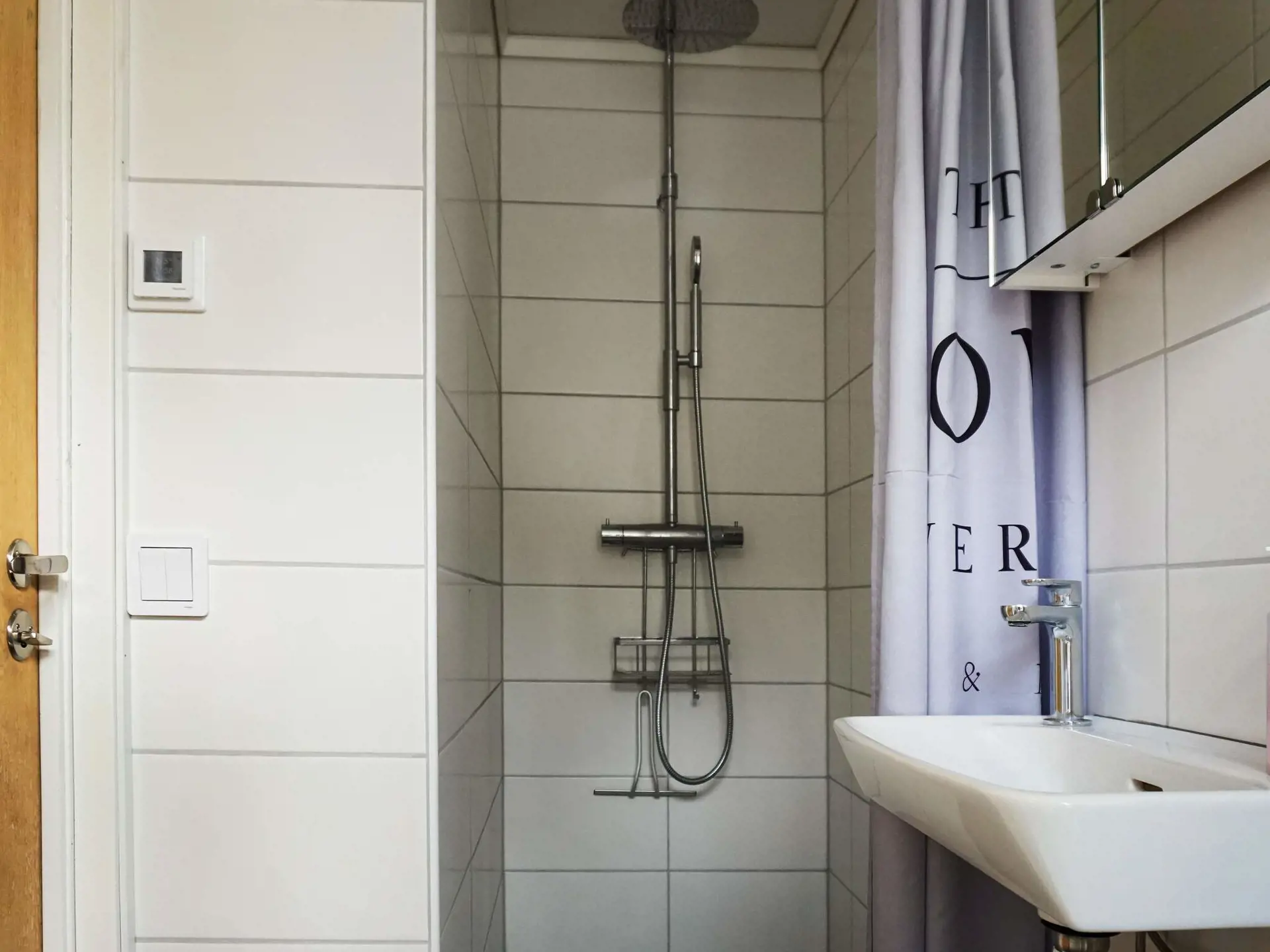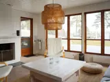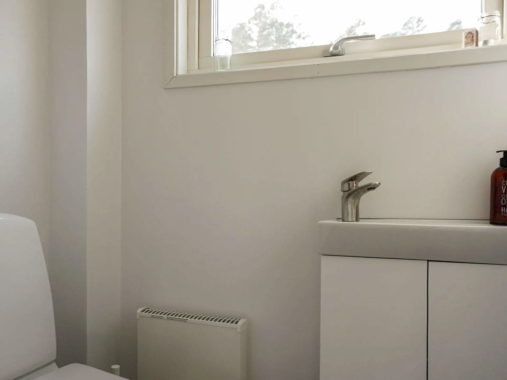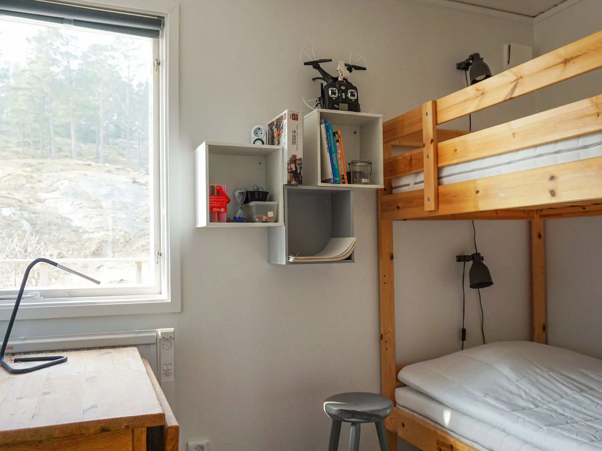Bei Ankunft erreichen Sie über eine große Holzterrasse den Eingang des Ferienhauses. Man betritt zunächst die Eingangsdiele, dann den großen Küchen-/Wohnbereich für das Familienleben, der herrlichen Ausblick zu Wald und Fjord bietet. In dem hellen, offenen Bereich finden Sie eine gut ausgestattete Küche mit Herd, Mikrowelle, Kühl-/Gefrierschrank und Geschirrspüler, einen Essbereich und ein Wohnzimmer mit TV und Kamin. Außerdem stehen im Haus drei Schlafzimmer bereit; eines mit Doppelbett, das zweite mit Einzelbett, das dritte mit einem Etagenbett mit zwei Kojen. Nebenan im separaten Annex findet man zwei weitere Schlafzimmer mit Doppelbett bzw. einem Etagenbett sowie eien Toilette. Unter dem Ferienhaus befindet sich ein Kellerraum mit Waschmaschine.