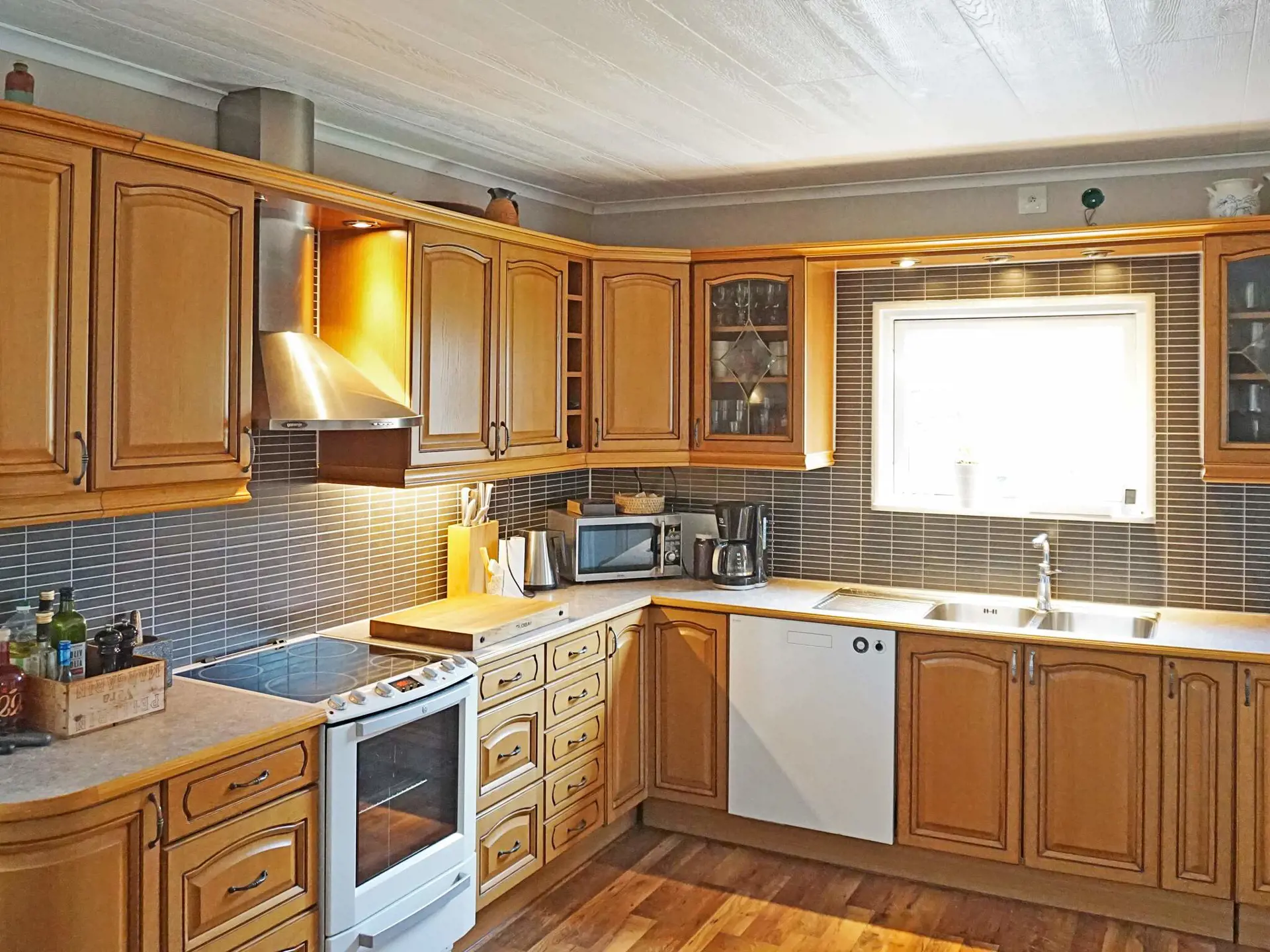 Über eine Treppe erreichen Sie die Eingangsebene der Villa. Im Inneren werden Sie von einem einladenden Flur begrüßt, der in eine Küche mit Essbereich sowie Herd, Mikrowelle, Kühl-/Gefrierschrank, Kaffeemaschine und Geschirrspüler übergeht. Im Erdgeschoss gibt es auch ein Wohnzimmer mit einer schönen großen Sitzecke mit Fernseher, ein Schlafzimmer mit einem Doppelbett und eine Toilette. Freies WLAN im Haus per Glasfaser.