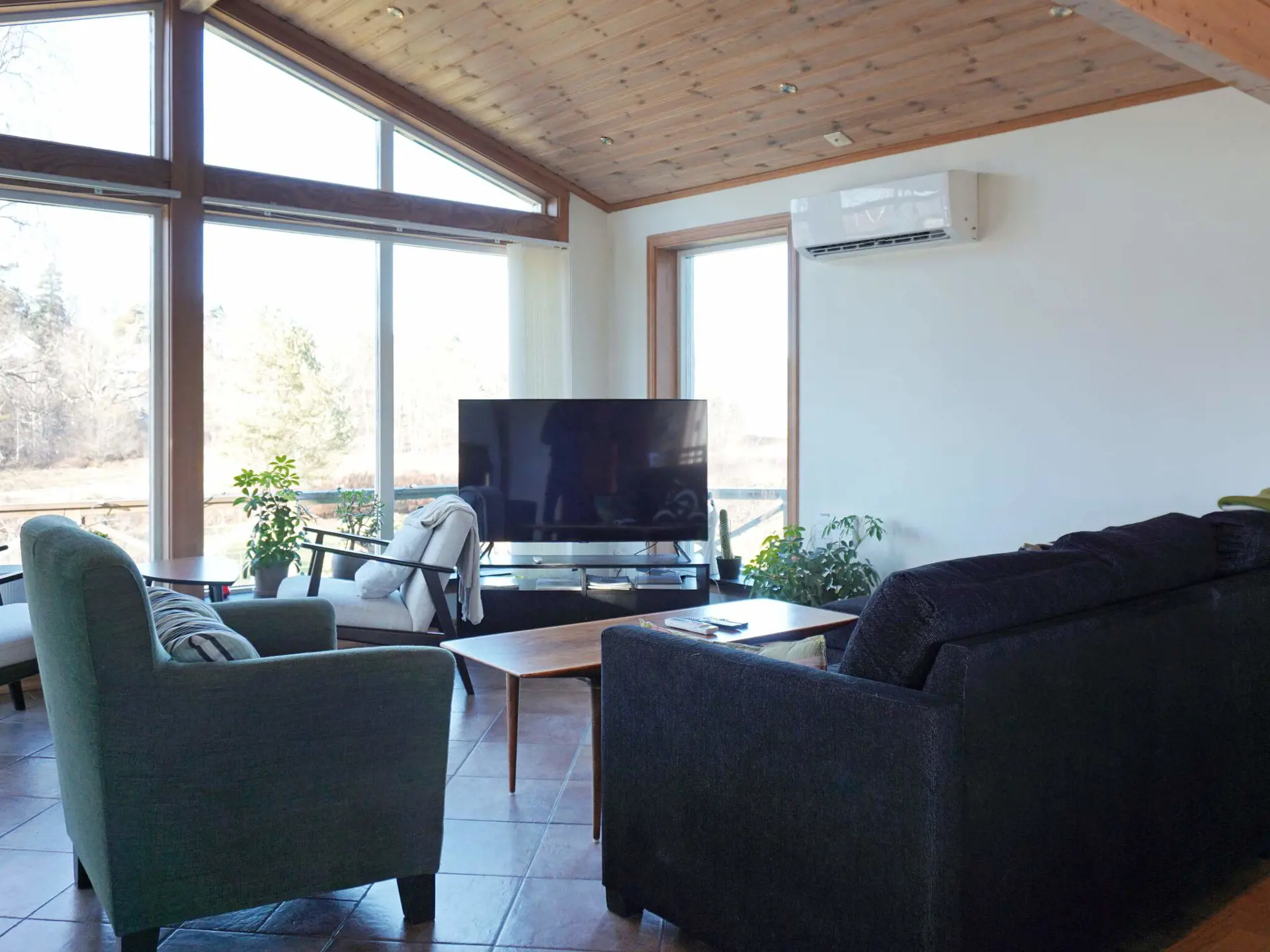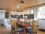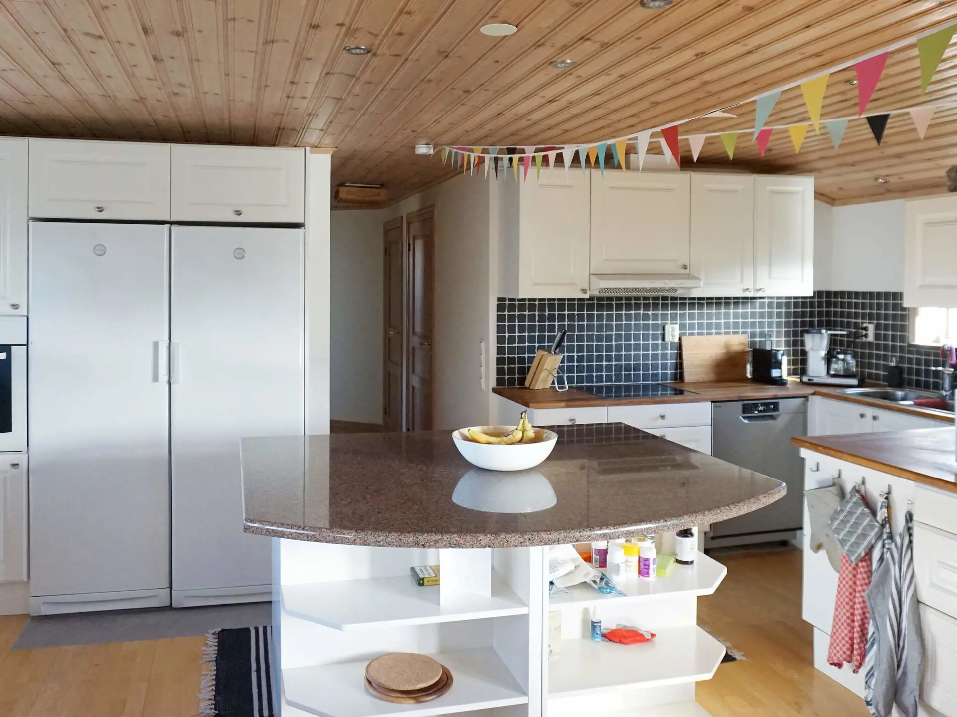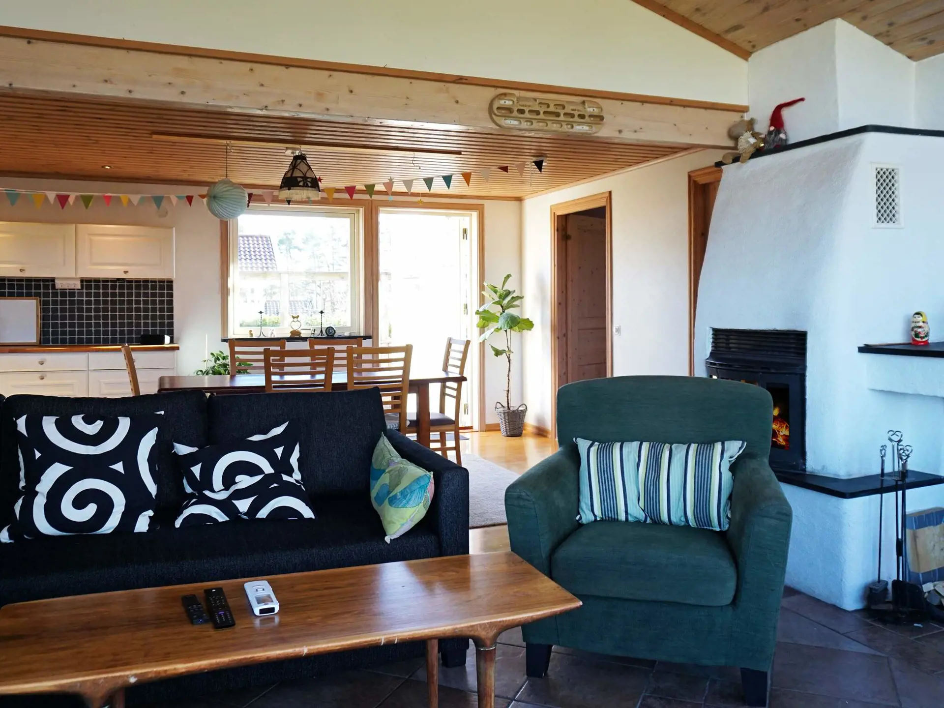 Über eine Treppe erreichen Sie den Eingang des Hauses. Im Inneren erwarten Sie ein Flur mit Zugang weiter zur großen, offenen Küche mit Essecke und offenem, großen Wohnbereich. Von dort schaut man durch die großen Fenster hinaus in den Garten. Der Küchenteil mit Kochinsel ist mit Herd, separatem Backofen, Mikrowelle, Kühl-/Gefrierschrank, Kaffeemaschine und Geschirrspüler ausgestattet. Das gemütliche Wohnzimmer verfügt über einen wärmenden Holzofen, bequeme Sessel sowie ein Schlafsofa für eine Person und einen Fernseher. Freies WLAN im Haus.