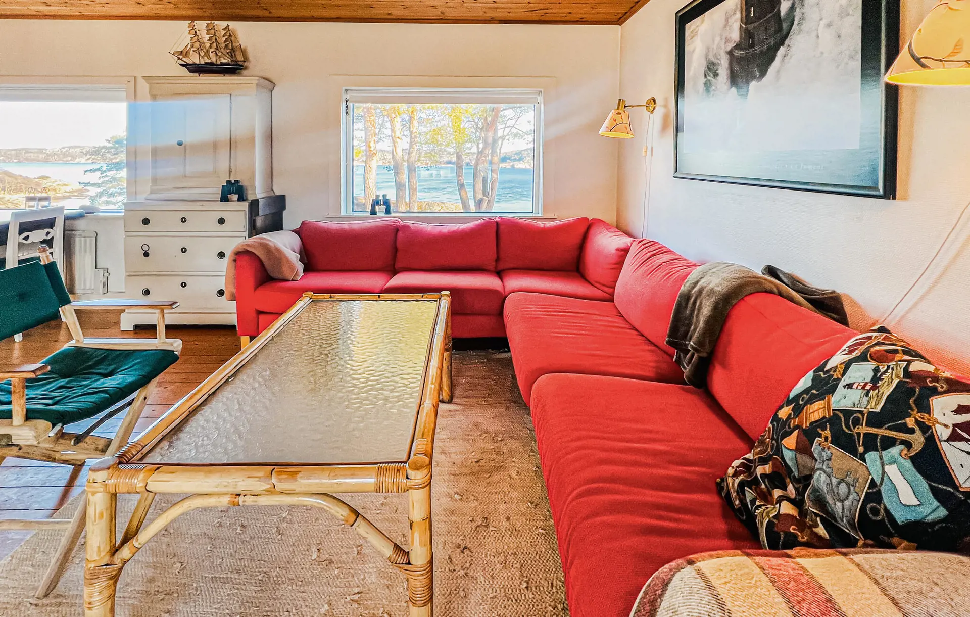 Ihr Ferienhaus in fantastischer Lage ist nur einen Katzensprung vom Meer entfernt. Das Wohnzimmer empfängt Sie mit einem großen Sofa und einer heimeligen Atmosphäre. Spielen Sie gemeinsam Karten oder schauen Sie einen Film, während das Feuer im Kaminofen für Wärme und Gemütlichkeit sorgt. Genießen Sie Ihre Mahlzeiten am großen Esstisch mit Panoramablick durch das Fenster.