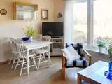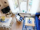 Das Haus besteht aus einem offenen Küchen-/Wohnbereich für das Familienleben, inklusive Ess- und Sitzecke sowie WLAN. Außerdem ein Schlafzimmer mit Etagenbett und ein Hems oben unter der Dachschräge mit Doppelbett und Zugang über eine Leitertreppe vom Wohnbereich aus. Zudem helles Badezimmer mit u.a. Dusche im Haus.