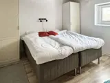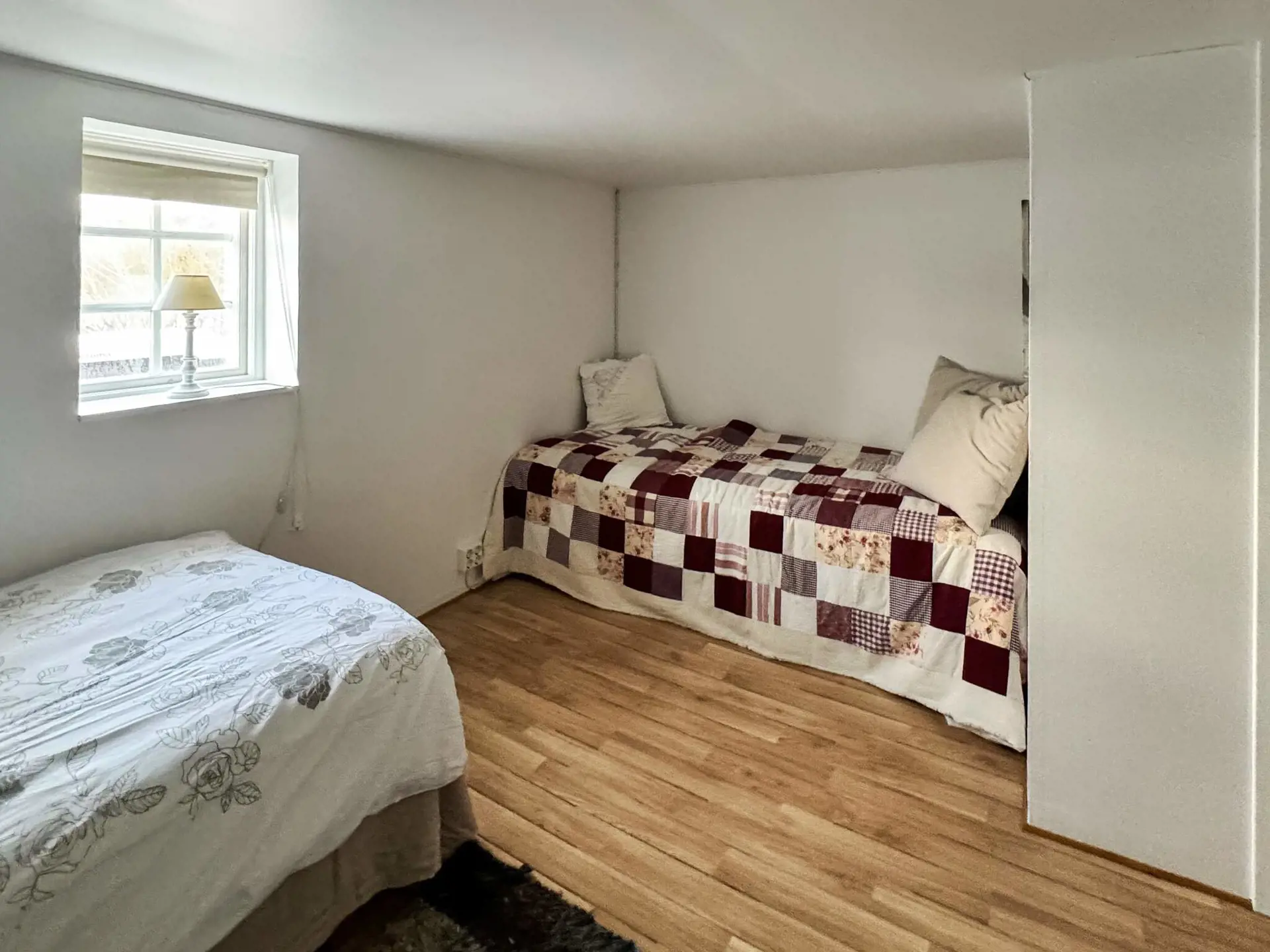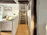 Eine kleinere, etwas steile Treppe führt hinauf ins Dachgeschoss, wo Sie zwei Schlafzimmer finden; eines mit Doppelbett, das andere mit drei Einzelbetten. Die Deckenhöhe an der Treppe ist etwas begrenzt, daher sollten einige Gäste darauf vorbereitet sein, in die Knie zu gehen.