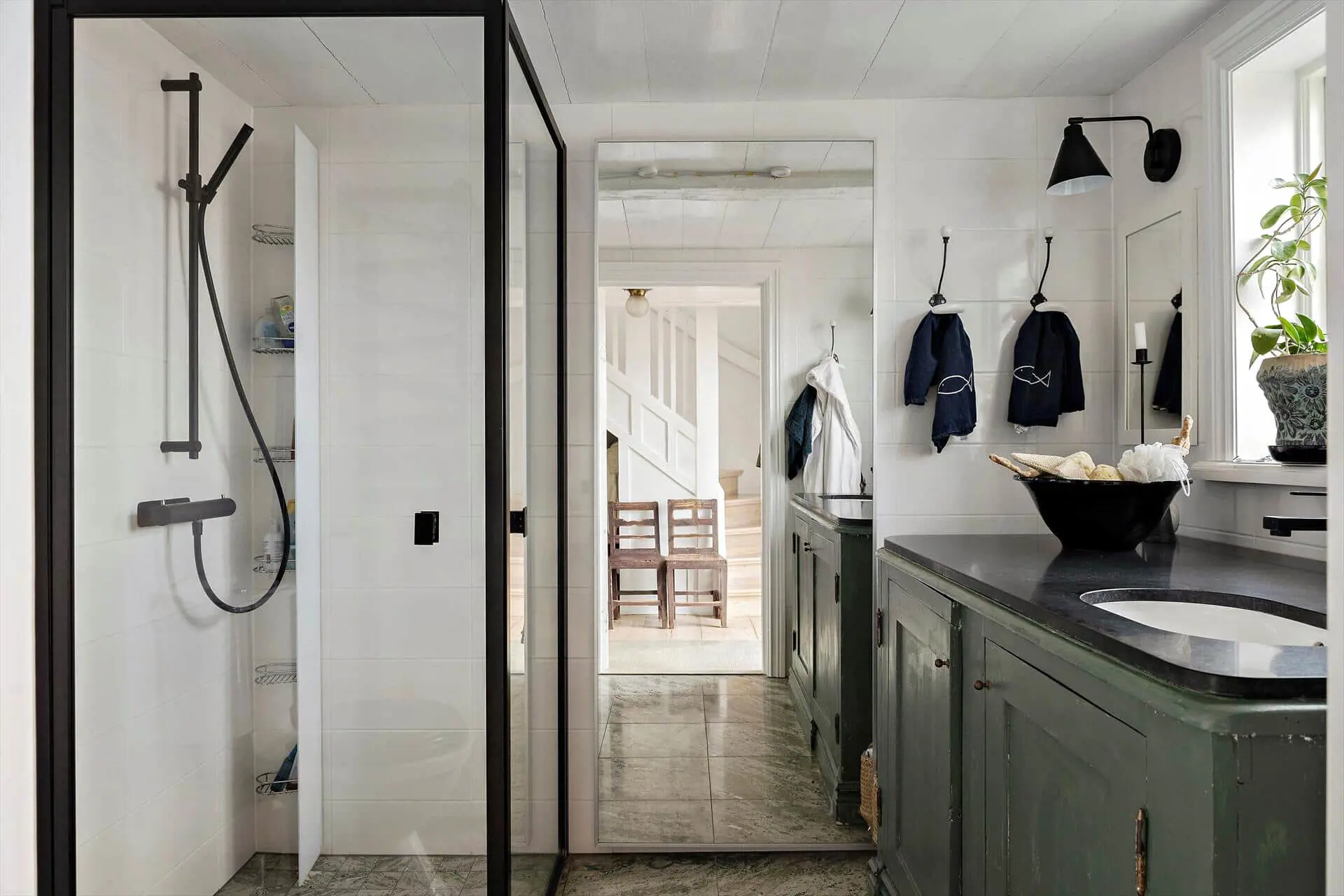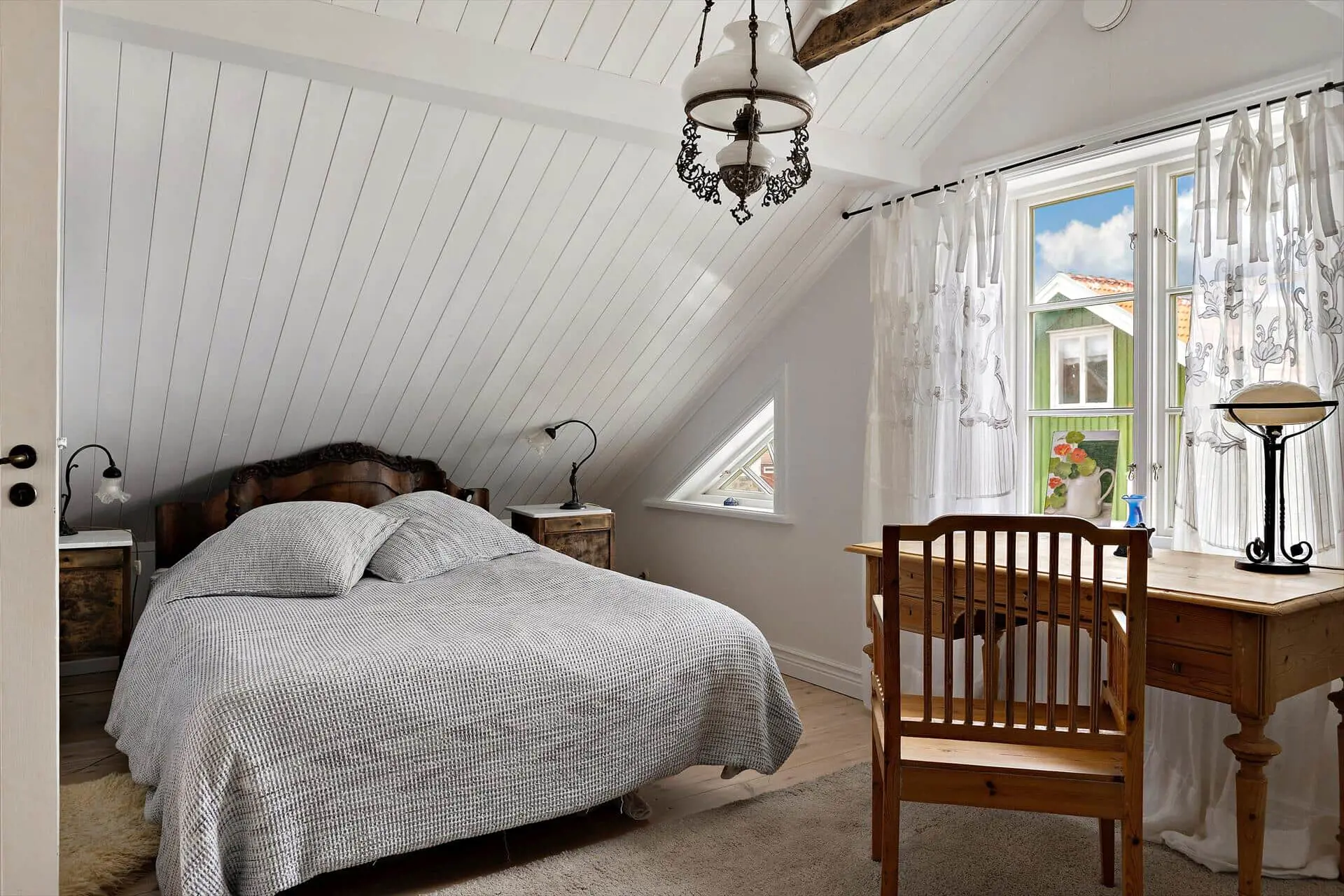 Das bereits 1890 erbaute, zweigeschossige ehemalige Fischerhaus wurde 2019 grundlegend renoviert und durch Anbauten auf eine Wohnfläche von etwa 120 m²erweitert. Neben einer voll möblierten, eingeglasten Veranda verfügt das Haus im Erdgeschoss über ein gemütliches, großes Wohnzimmer mit zwei Sitzgruppen und Kachelofen sowie über eine moderne Küche mit Dunstabzugshaube, Elektroherd mit separatem Backofen, Kaffeemaschine und Wasserkocher. Weiterhin befindet sich hier ein geräumiges Duschbad mit WC und Handwaschbecken. Ein weiterer, gemütlicher Aufenthaltsraum, mit einem Schlafsofa möbliert, befindet sich im Obergeschoß, in dem auch die beiden Schlafzimmer, jeweils mit einem Doppelbett ausgestattet, sowie ein weiteres Duschbad mit WC untergebracht sind. Von hier aus gelangt man auch auf einen mit Sommermöbeln ausgestatteten Balkon; weitere Sitzecken mit Gartenmöbeln gruppieren sich um das Haus. Den Gästen steht außerdem ein Internetzugang über WLAN zur Verfügung.