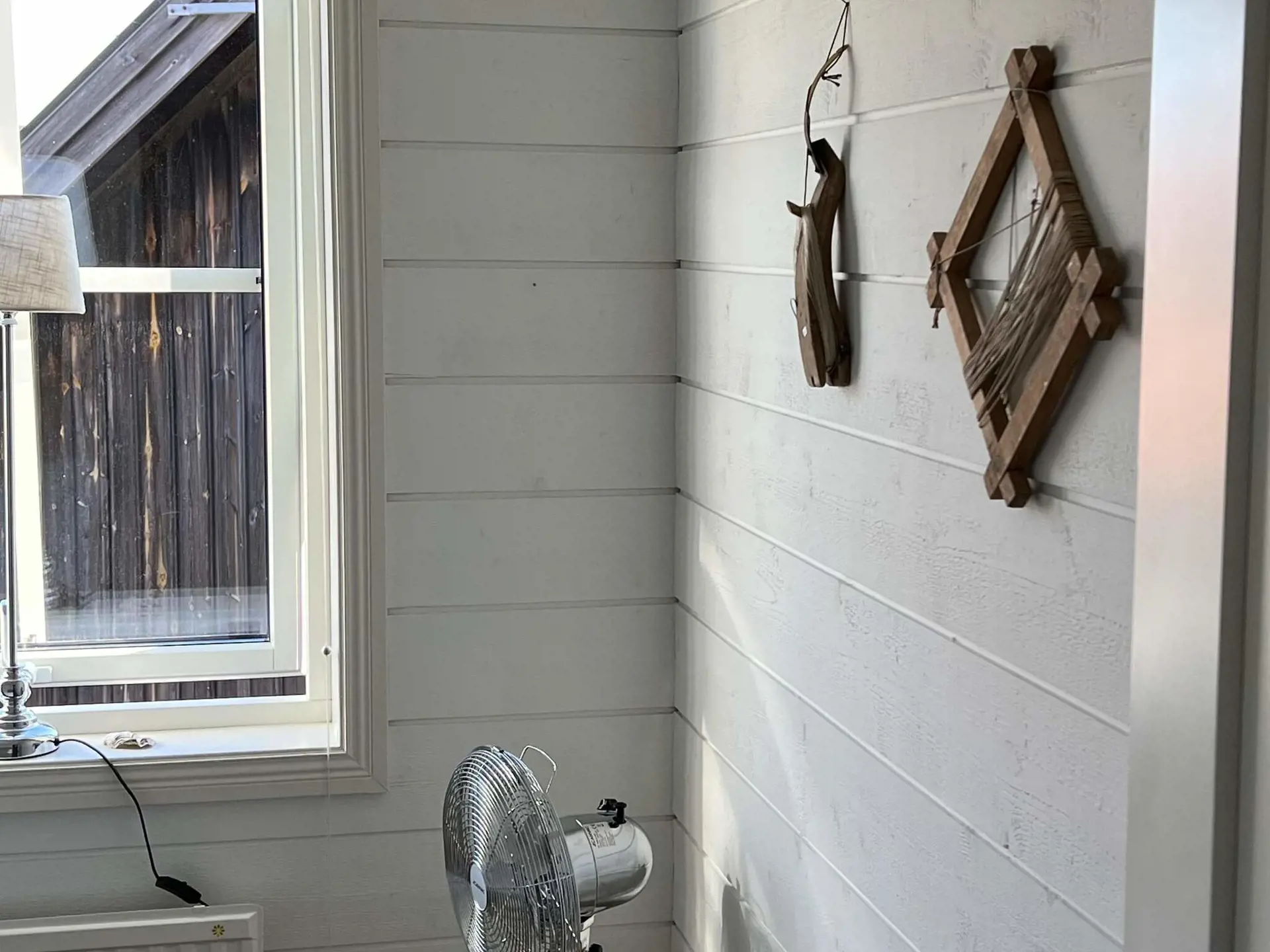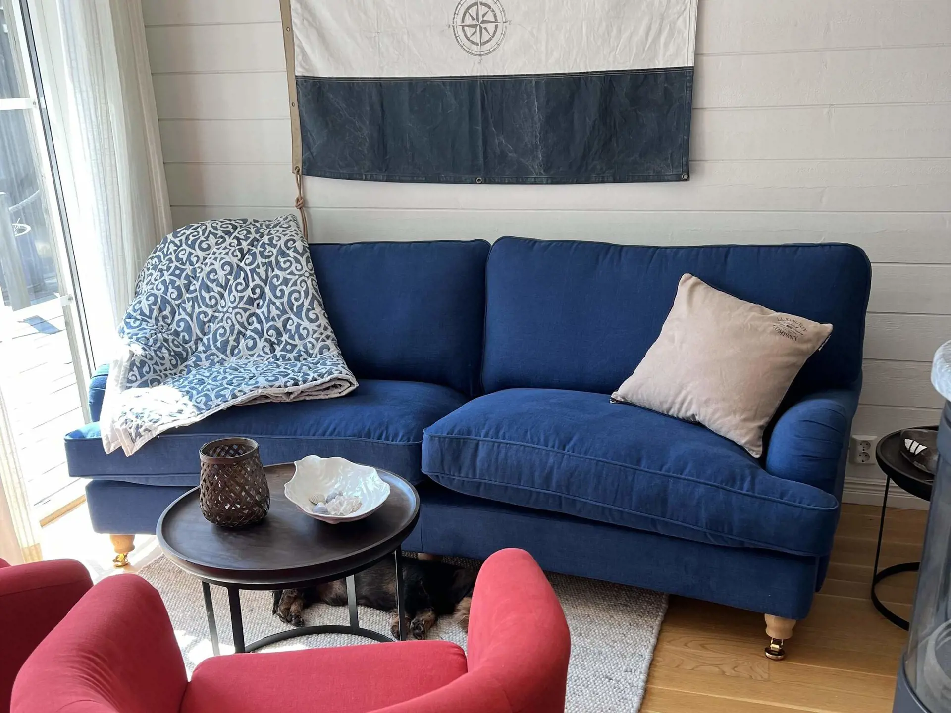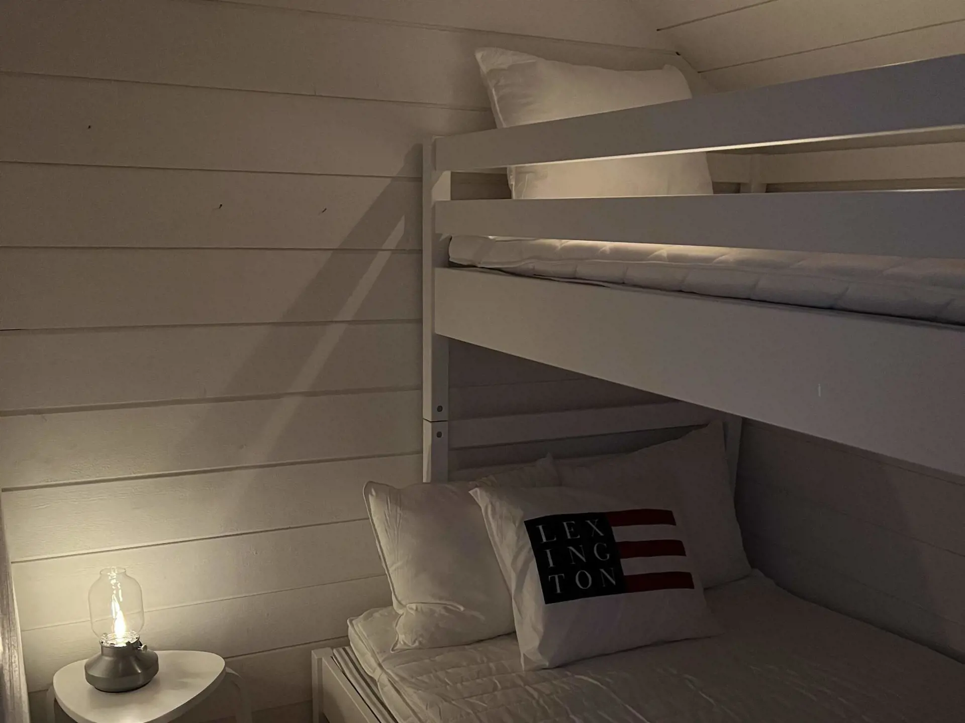 The house is on two levels with a living room and kitchen in an open floor plan on the lower level, where you also have a bathroom. From the living room, you have access to the house's terrace where the whole family can fit, and if the sun shines too brightly, there is an awning that can be pulled out. Upstairs, you will find three bedrooms, two of which are equipped with double beds, and the third room has a bunk bed with a wider, 120 cm, lower bunk.
