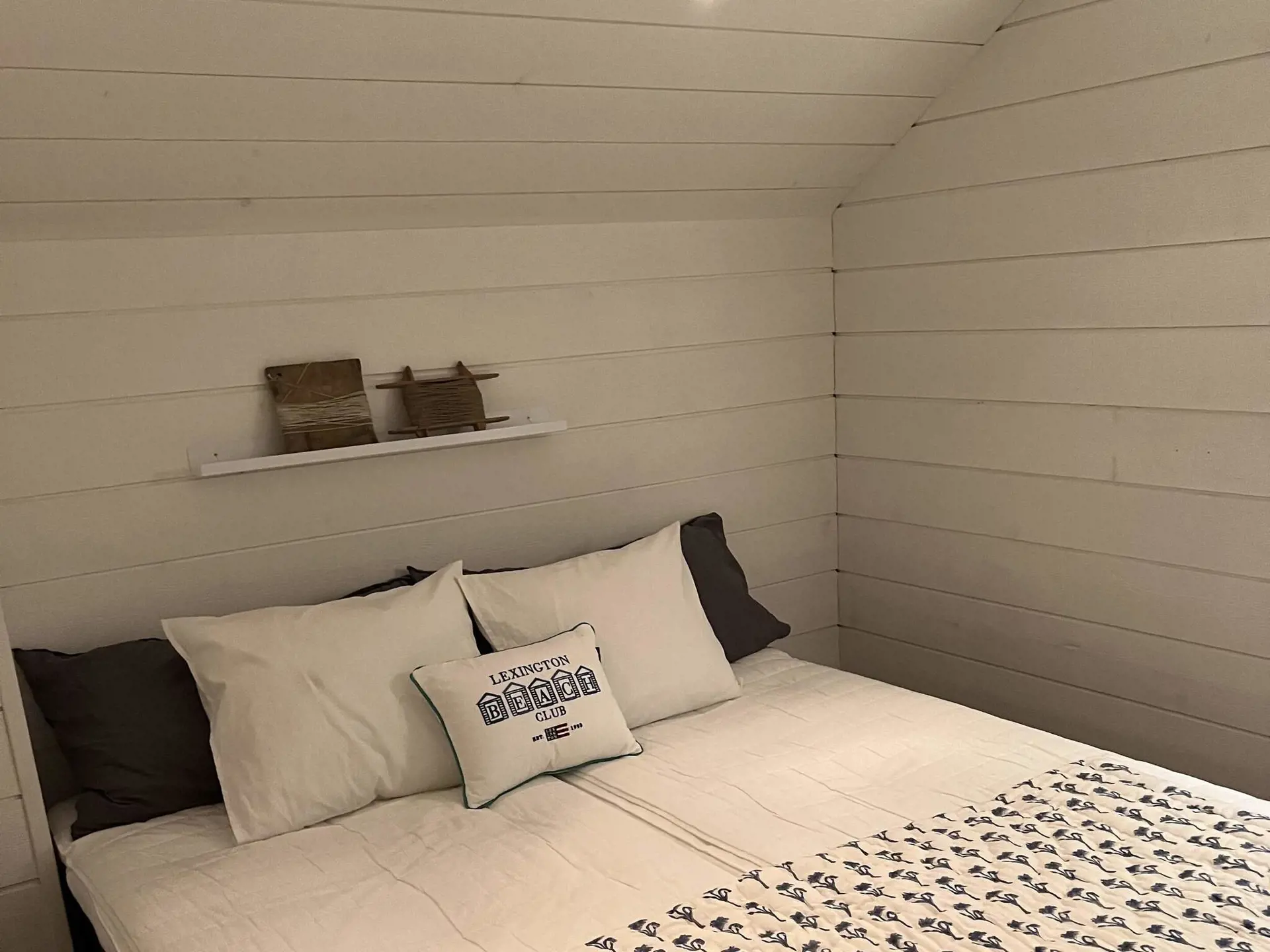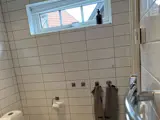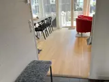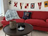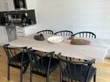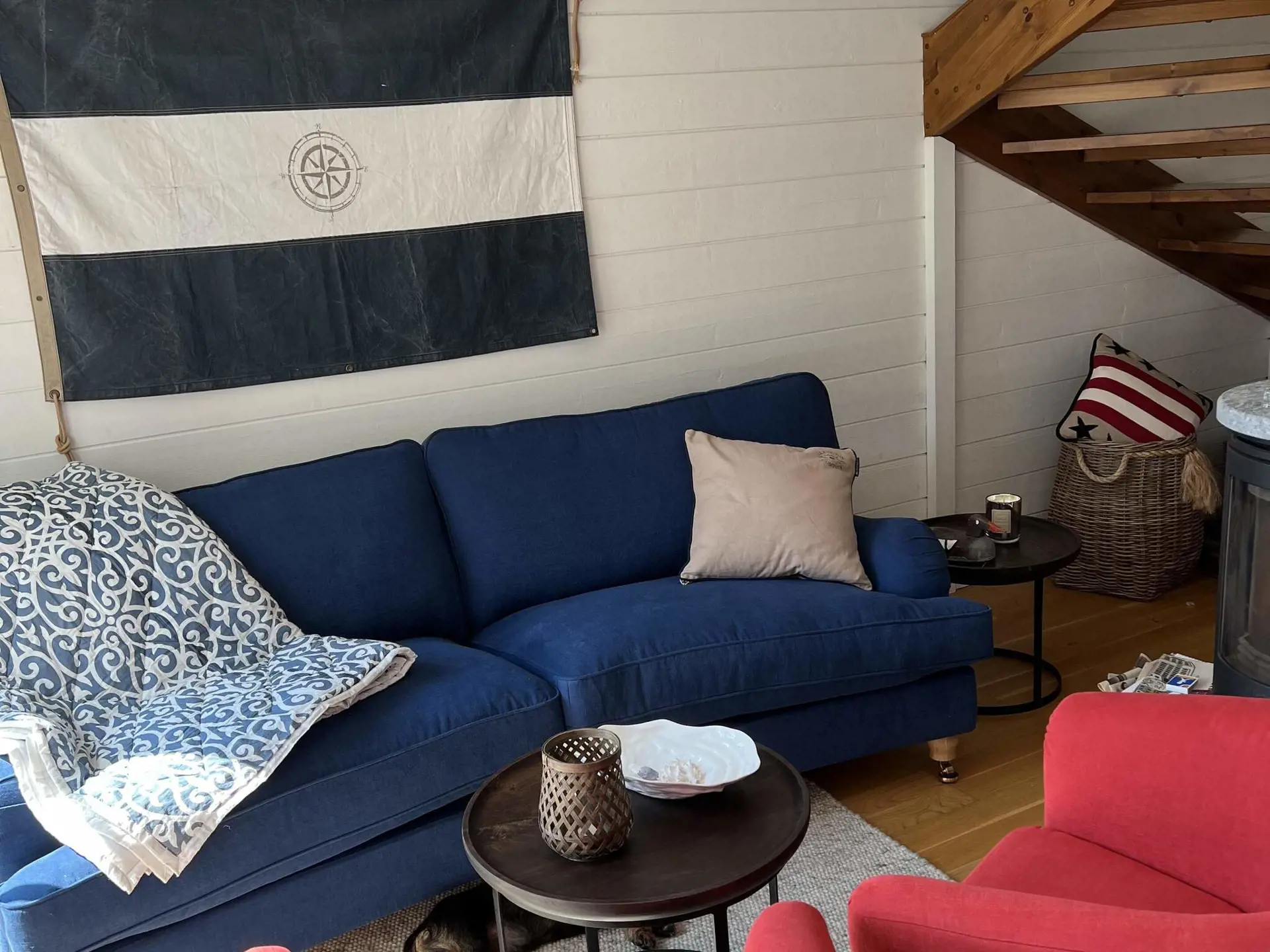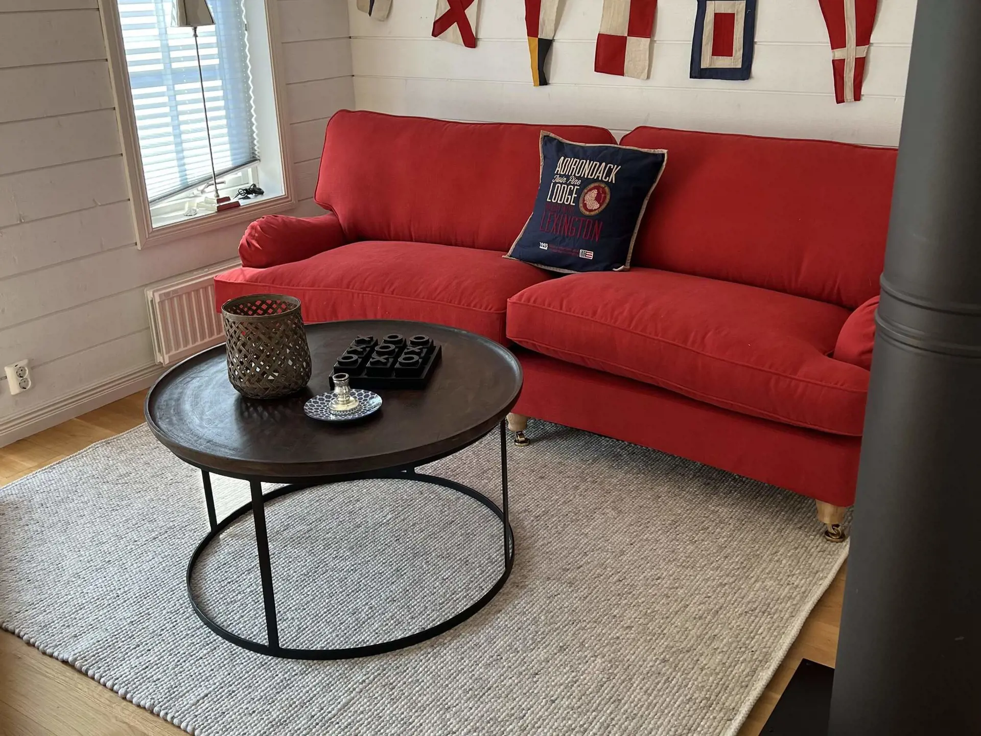 The house is on two levels with a living room and kitchen in an open floor plan on the lower level, where you also have a bathroom. From the living room, you have access to the house's terrace where the whole family can fit, and if the sun shines too brightly, there is an awning that can be pulled out. Upstairs, you will find three bedrooms, two of which are equipped with double beds, and the third room has a bunk bed with a wider, 120 cm, lower bunk.