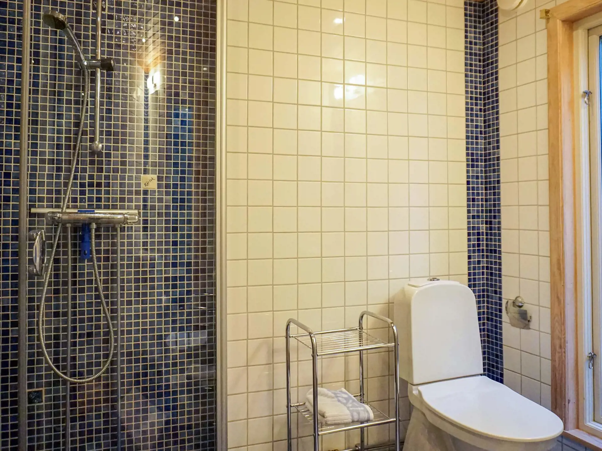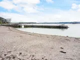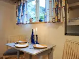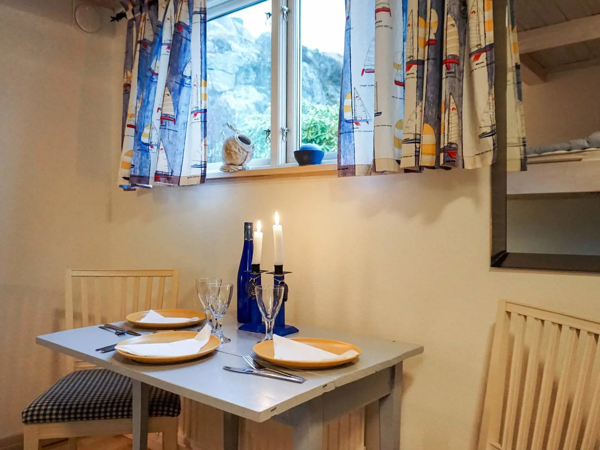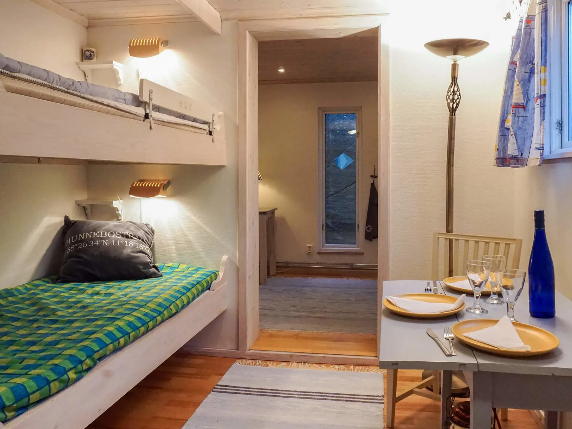 Das kleine Nebengebäude eines Privathauses ist über die Terrasse zu erreichen und öffnet sich zu einem warmen, gemütlichen Innenraum. Im Inneren finden Sie einen Eingangsbereich für Oberbekleidung, einen Essbereich und eine praktische Küchenzeile mit Herd, Mikrowelle, Kühlschrank mit Gefrierfach und Kaffeemaschine. Das Badezimmer verfügt über Fußbodenheizung und eine Dusche für zusätzlichen Komfort. Das Schlafzimmer ist mit zwei bequemen Einzelbetten, Sesseln und einem Fernseher ausgestattet, während ein eingebautes gemütliches Etagenbett neben dem Essbereich steht. Große Doppeltüren führen direkt auf die Terrassen, darunter eine erhöhte Terrasse mit herrlichem Blick auf das Meer und den Strand – ideal für morgendliches Schwimmen, ein entspanntes Frühstück oder abendliche Grillabende. WLAN ist verfügbar und Waschmöglichkeiten finden Sie im Gästehafen von Hunnebostrand.