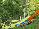 Große, geschützte Veranda draußen am Haus für sonnige Tage. Der Eigentümer wohnt gleich nebenan auf einem eigenen Grundstück, etwa 20 m vom Ferienhaus. Rutsche und Schaukeln nutzt man gemeinschaftlich.