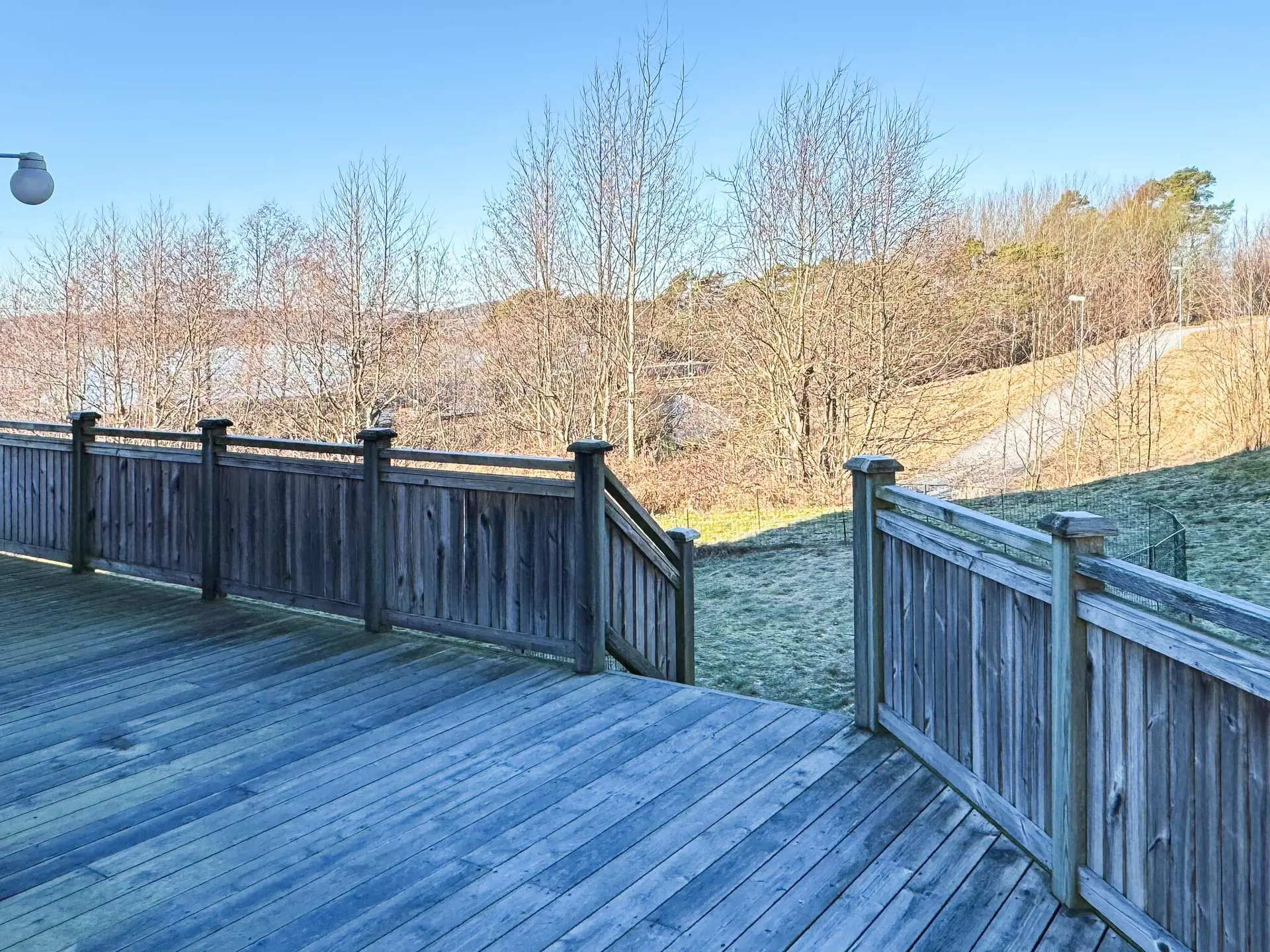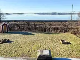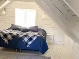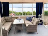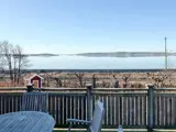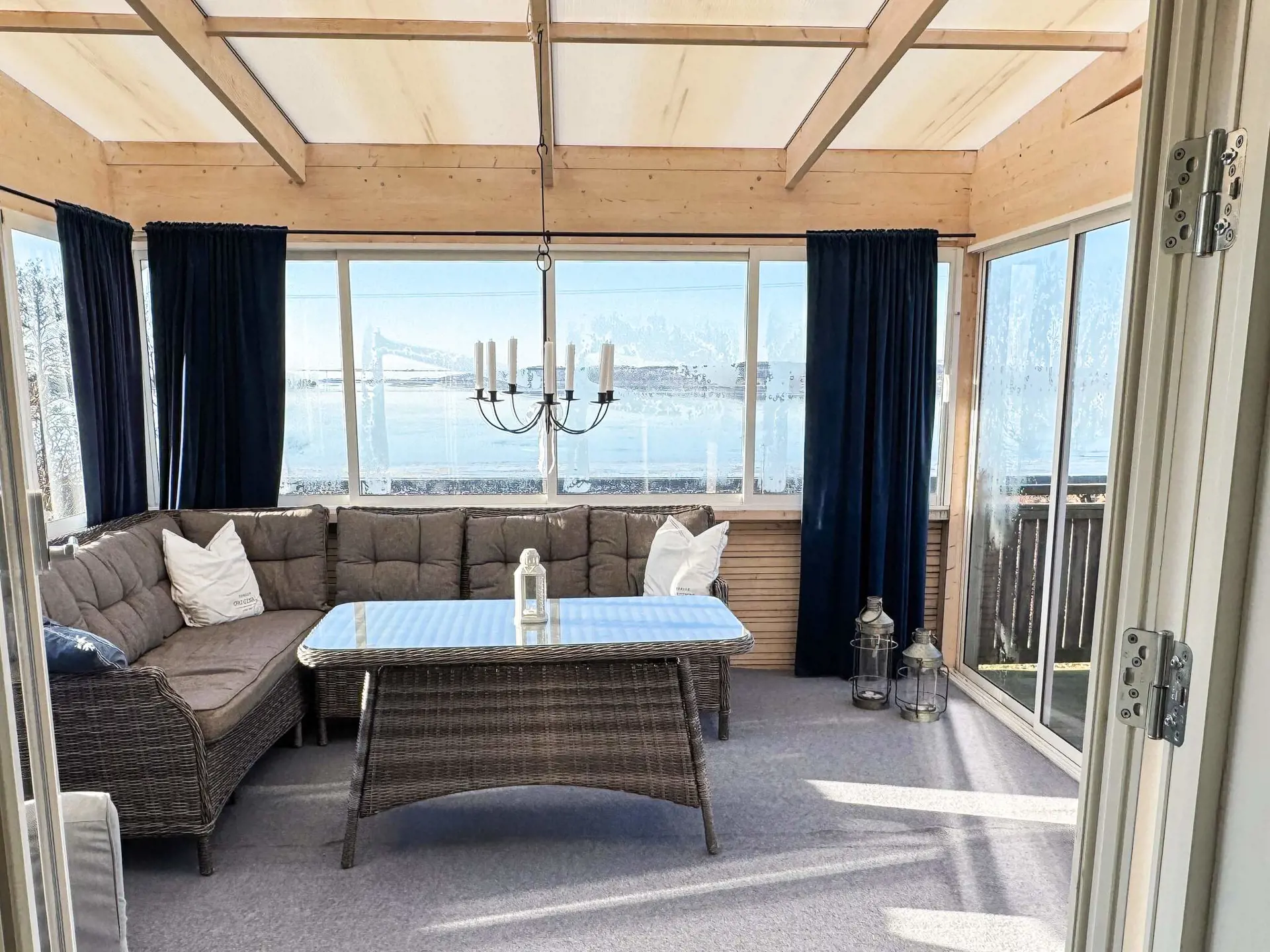 Der Dachboden hat eine etwas niedrigere Deckenhöhe, was zum gemütlichen Landhausgefühl beiträgt. Vom Wohnzimmer aus gelangt man in den verglasten Außenbereich mit einem schönen Rattan-Ecksofa und fantastischem Blick auf den Fjord. Auf der Terrasse stehen Gartenmöbel und ein Holzkohlegrill für lange Sommerabende bereit.
