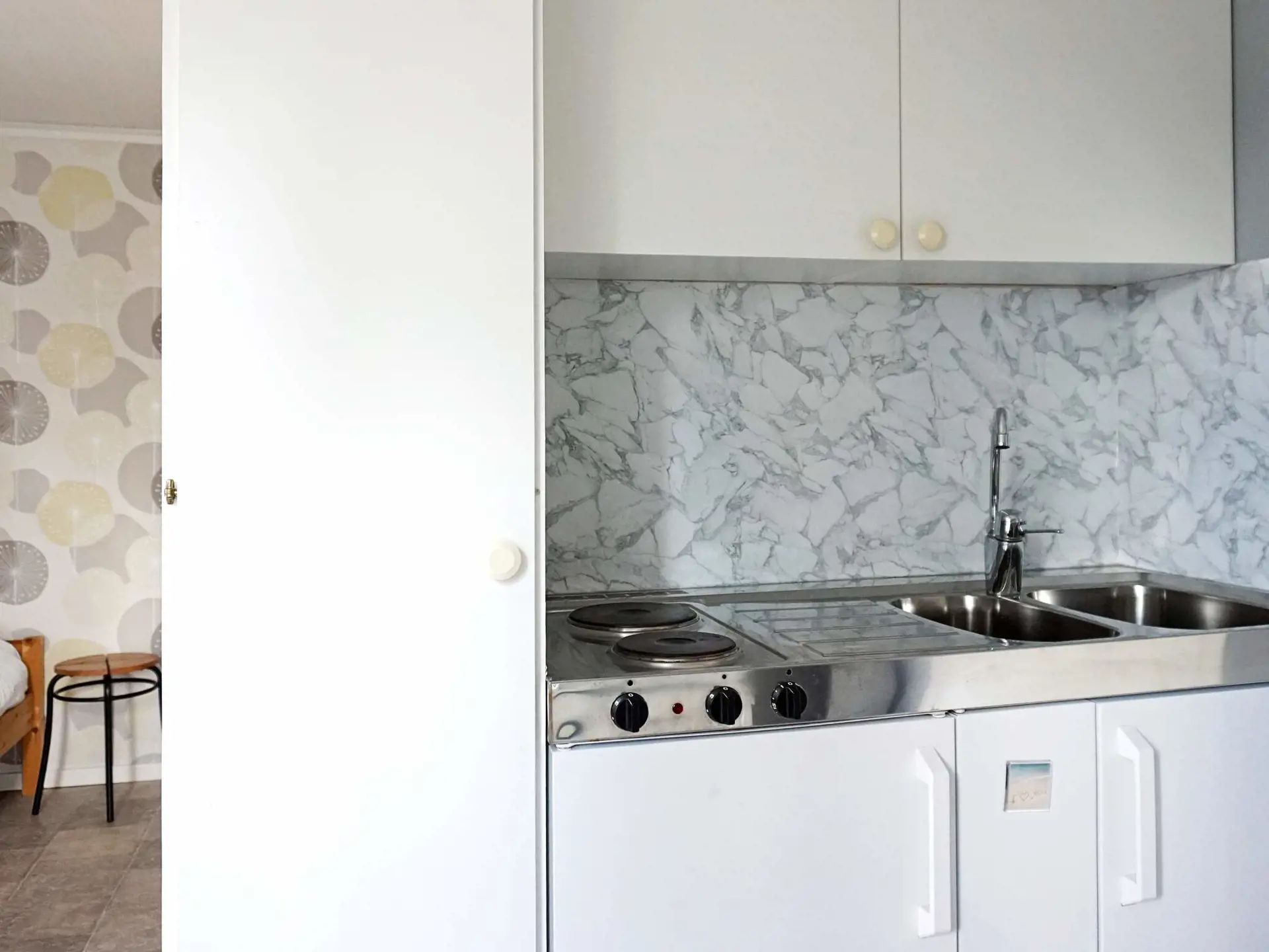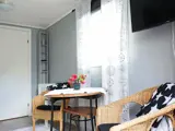 Zugang zur Wohnung über den Terrassenbereich. Im Inneren treffen Sie auf ein Wohnzimmer, einen Schlafbereich und eine Küchenzeile. Der Schlafbereich besteht aus einem Etagenbett (80 bzw. 120 cm Breite). Küchenzeile mit Herd, Mikrowelle, Kühlschrank mit Gefrierfach, Kaffeemaschine. Badezimmer mit Fußbodenheizung, WC und Dusche. Es gibt auch einen Fernseher und eine. Waschmaschine kann auf Anfrage bei der Eigentümerfamilie ausgeliehen werden. Am Eingang befindet sich auch ein Terrassenbereich mit Essplatz und Grill für Sommertage.