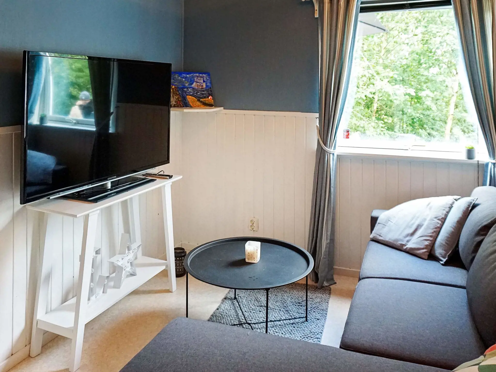 Das Ferienhaus liegt mit der weiten Natur als Nachbarn und bietet eine private Umgebung sowie Ruhe und sternenklare Nächte. Über die Veranda am Eingang gelangen Sie in den Flur des Ferienhauses und weiter in die offene Küche mit Herd, Mikrowelle, Kühl-/Gefrierschrank und Kaffeemaschine. Weiter geht es zur Essecke mit Küchenmöbeln und zum Wohnzimmer mit Schlafsofa für eine Person, TV-Bildschirm und DVD-Spieler. Im Haus außerdem zwei Schlafzimmer; eines mit schmalerem Doppelbett, das zweite mit zwei Etagenbetten bzw. vier Kojen. Badezimmer mit Dusche und Waschmaschine. Freies WLAN im Haus. Im Außenbereich des Hauses stehen Gartenmöbel für sonnige Tage bereit. Es gibt auch eine Spielfläche für die Kleinen und eine Rasenfläche für Ballspiele.