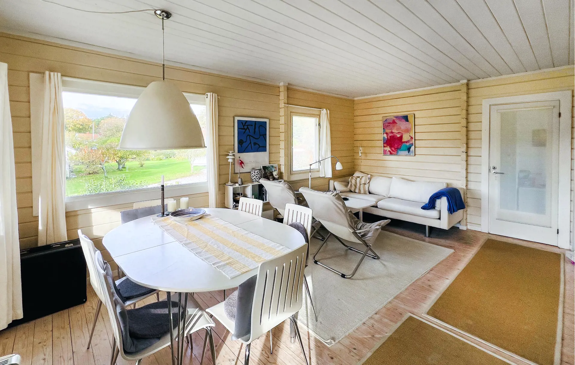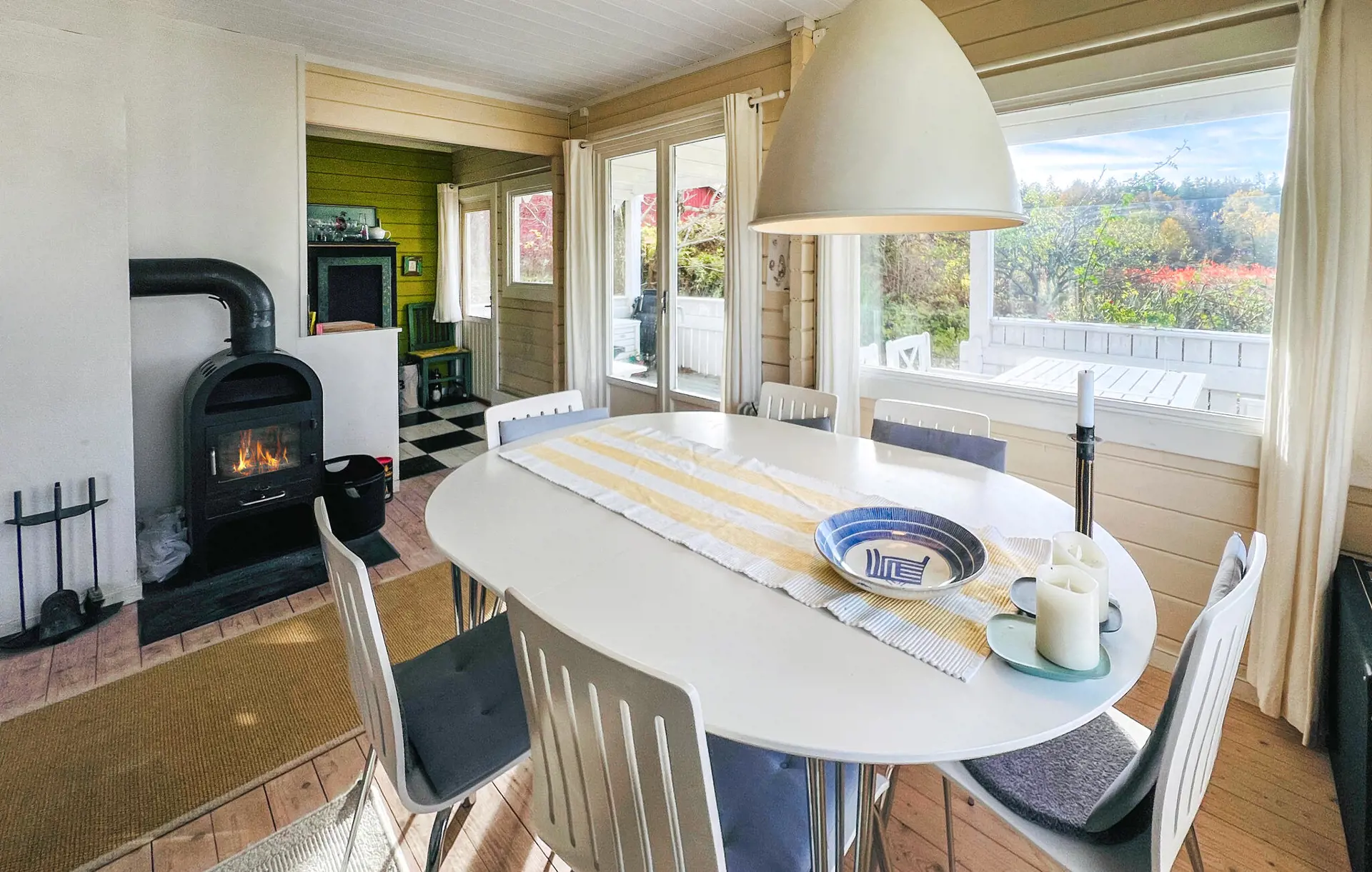 Genießen Sie eine erholsame Auszeit in diesem liebevoll gestalteten Ferienhaus auf der idyllischen Insel Öddö. Hier verbinden sich gemütliche Wohnatmosphäre, Naturerlebnis und die Nähe zur faszinierenden schwedischen Schärenküste zu einem unvergesslichen Urlaub. Der offene Wohnbereich mit bequemen Sitzmöbeln, stilvollen Details und einem wärmenden Kaminofen lädt zu entspannten Stunden ein. Die großen Fenster sorgen für viel Tageslicht und bieten Ausblicke auf die grüne Umgebung. In der kompakten Küche bereiten Sie mühelos Ihre Mahlzeiten zu und genießen diese anschließend am freundlichen Esstisch mit Blick auf den Garten.