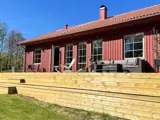 Enjoy the summer on a terrace beyond the ordinary! A large wooden deck that stretches along the back and gable of the house - with several cozy seating areas, a café group, dining table, lounge corners, sun loungers and parasols. Perfect for both sun and shade, morning coffee or evening hangout.