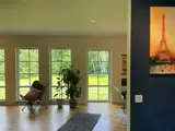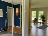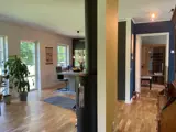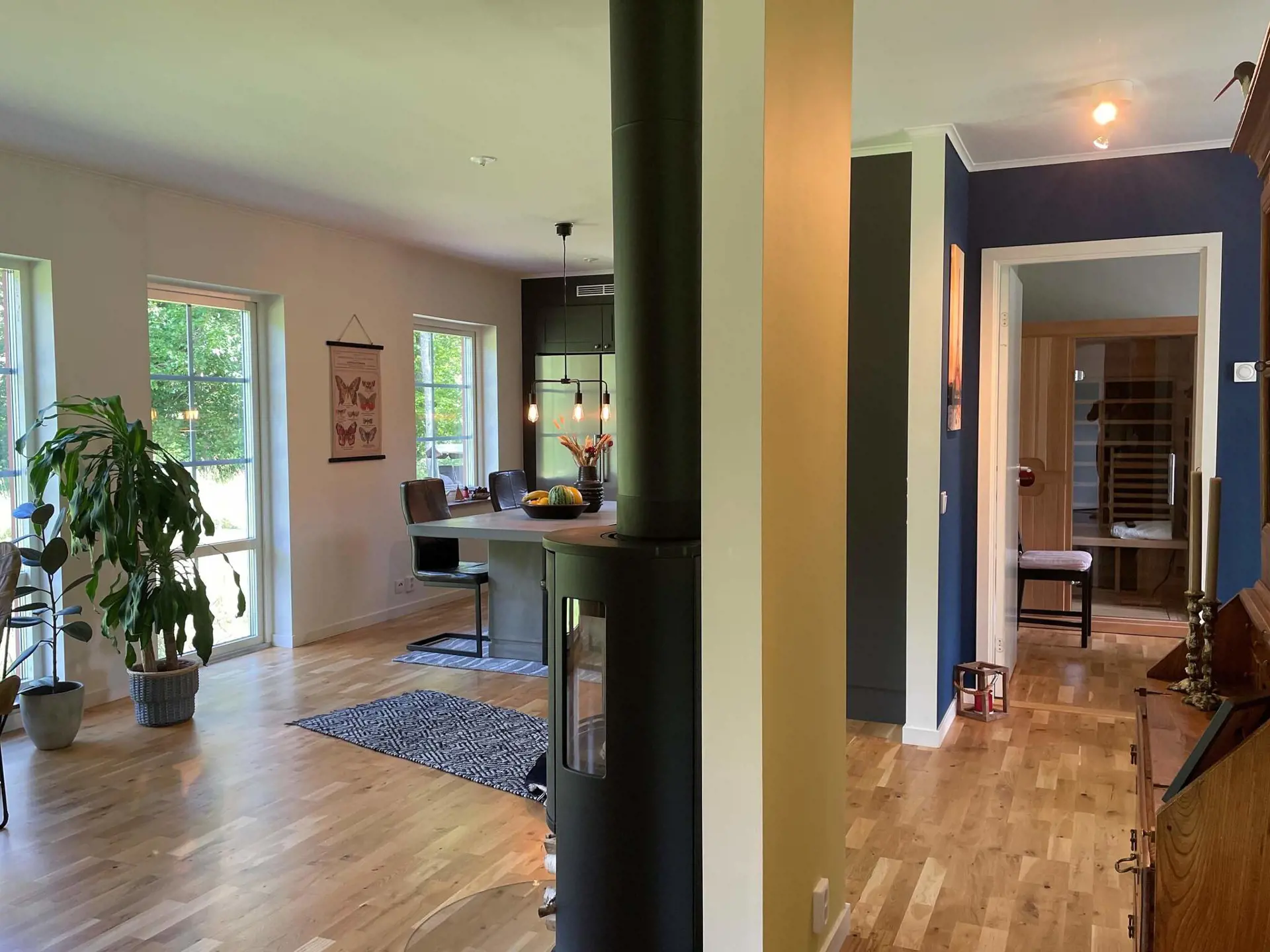 Entrance from the front with spacious hall with lots of storage. Two bedrooms, one with a 140cm bed and the second room with a bunk bed where the lower bunk is 120cm and the upper 80cm. In this room there is a lovely IR sauna for 2 people and a simple home gym for those who want to work out on holiday. There is an open kitchen with dining area and views towards both the short side and the back of the house. Spacious living room with large 65” TV and sofa and armchair and also large lovely windows towards the back.