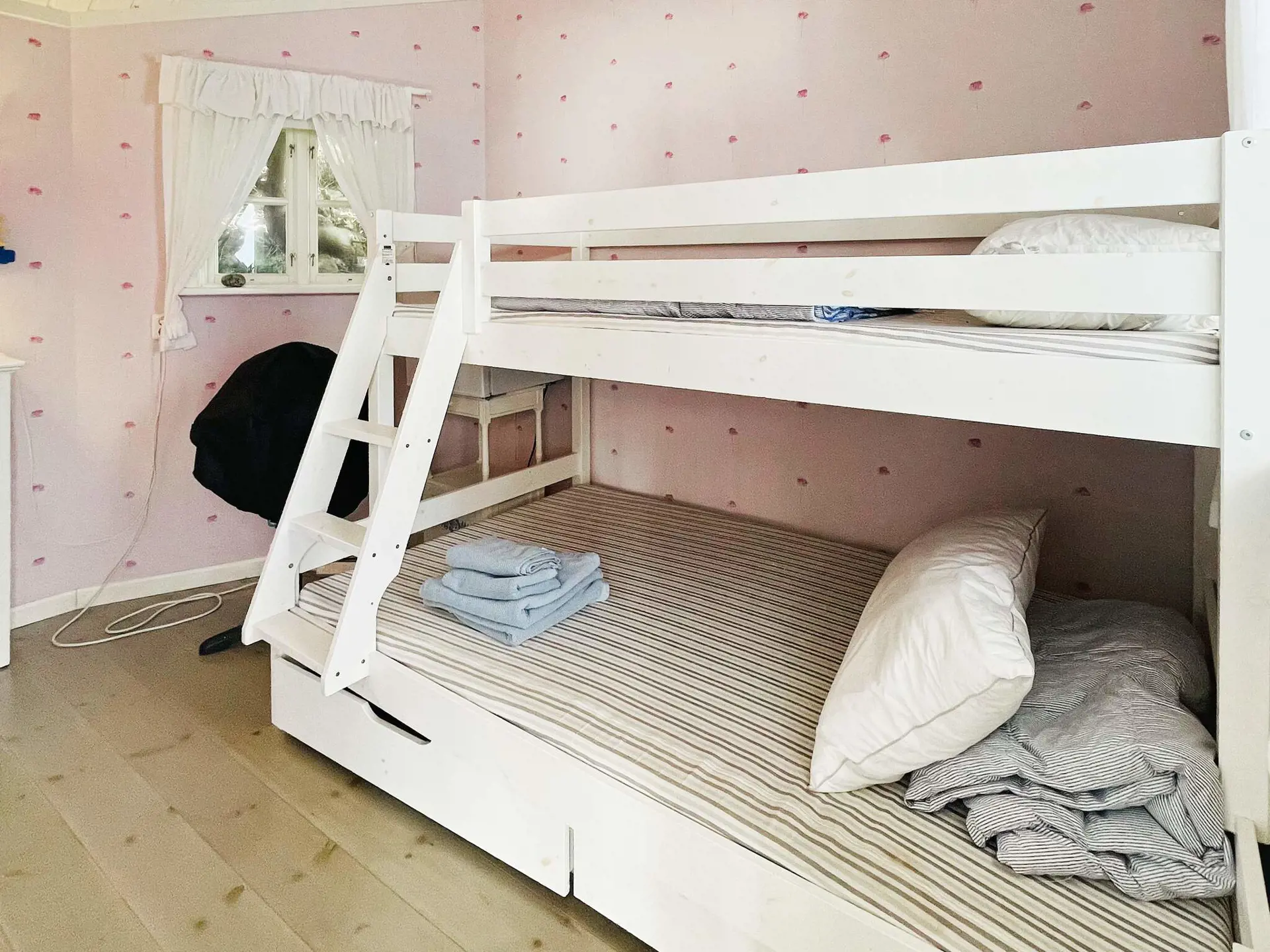 Im Annex nebenan befindet sich ein Etagenbett mit einer etwas breiteren unteren Koje für zwei Personen und einer Einzelkoje darüber, was es für drei Personen gemütlich macht. Es gibt auch ein Bad mit Toilette, Waschbecken und Dusche.