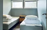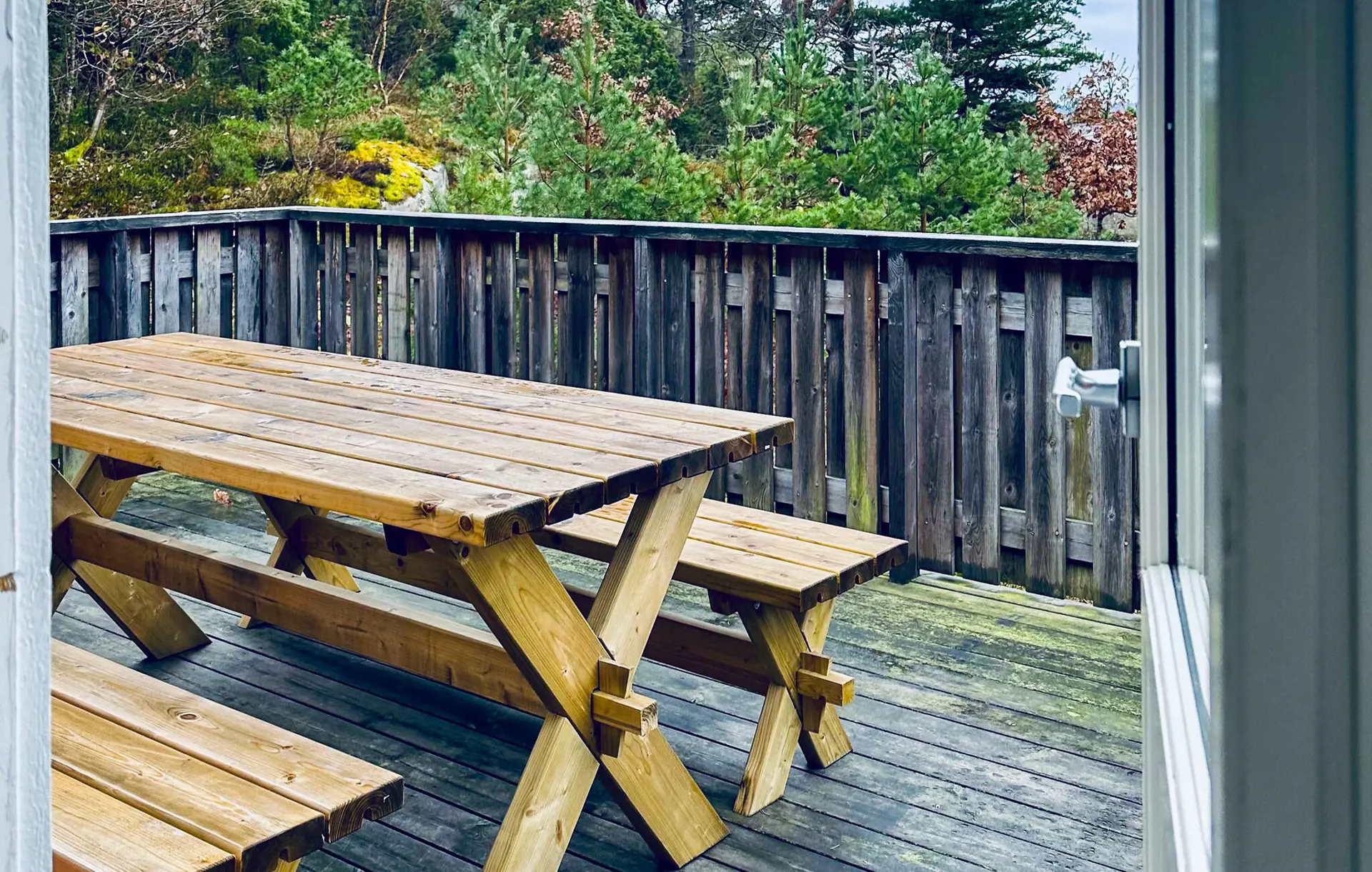 Gehen Sie hinaus auf die Holzterrasse mit rustikalem Charme und atmen Sie die frische Luft der Küstenlandschaft. Setzen Sie sich an die Sitzgarnitur und genießen Sie eine Pause mit Blick auf das Wasser und die felsige Küste. Die umliegende Natur mit ihren Bäumen und Felsen spendet Ruhe und lädt zu kleinen Spaziergängen ein. Nutzen Sie zusätzlich die gemeinschaftliche Sauna und die vielfältigen Möglichkeiten für ein wohltuendes Bad im Meer.