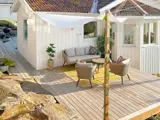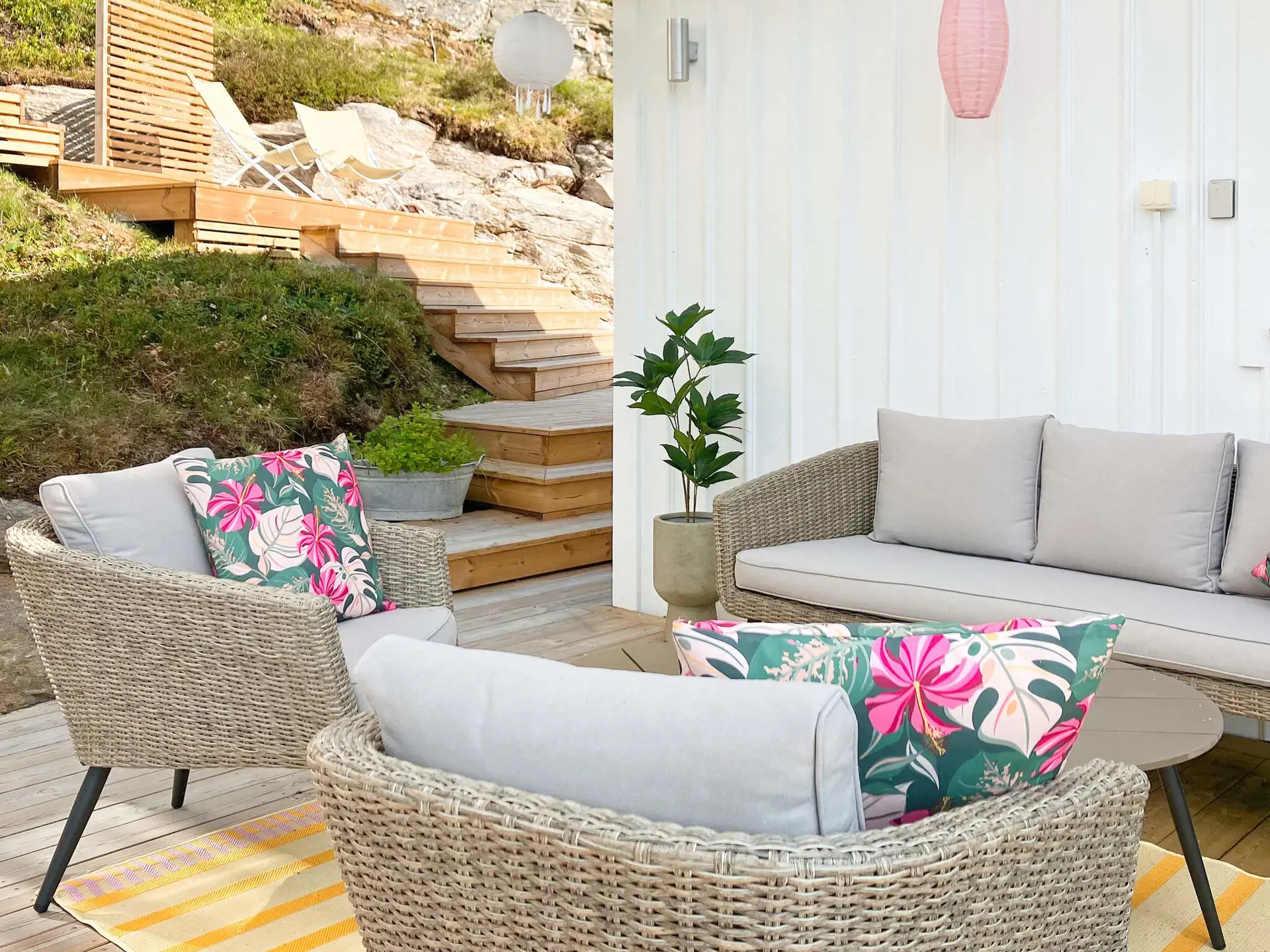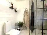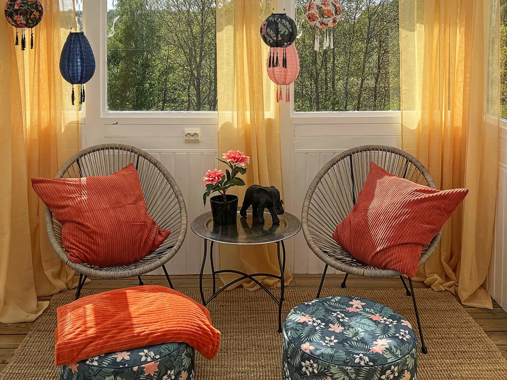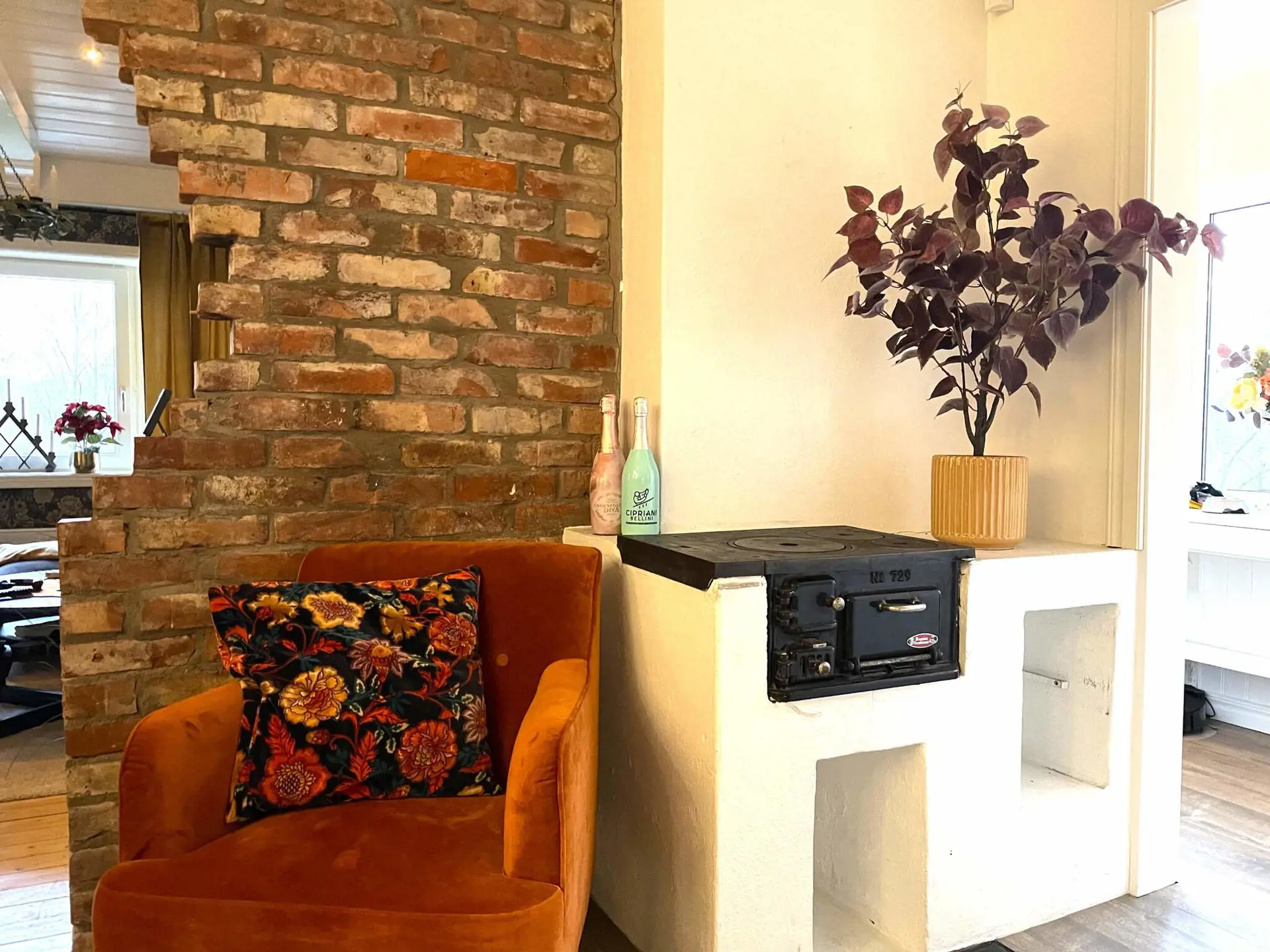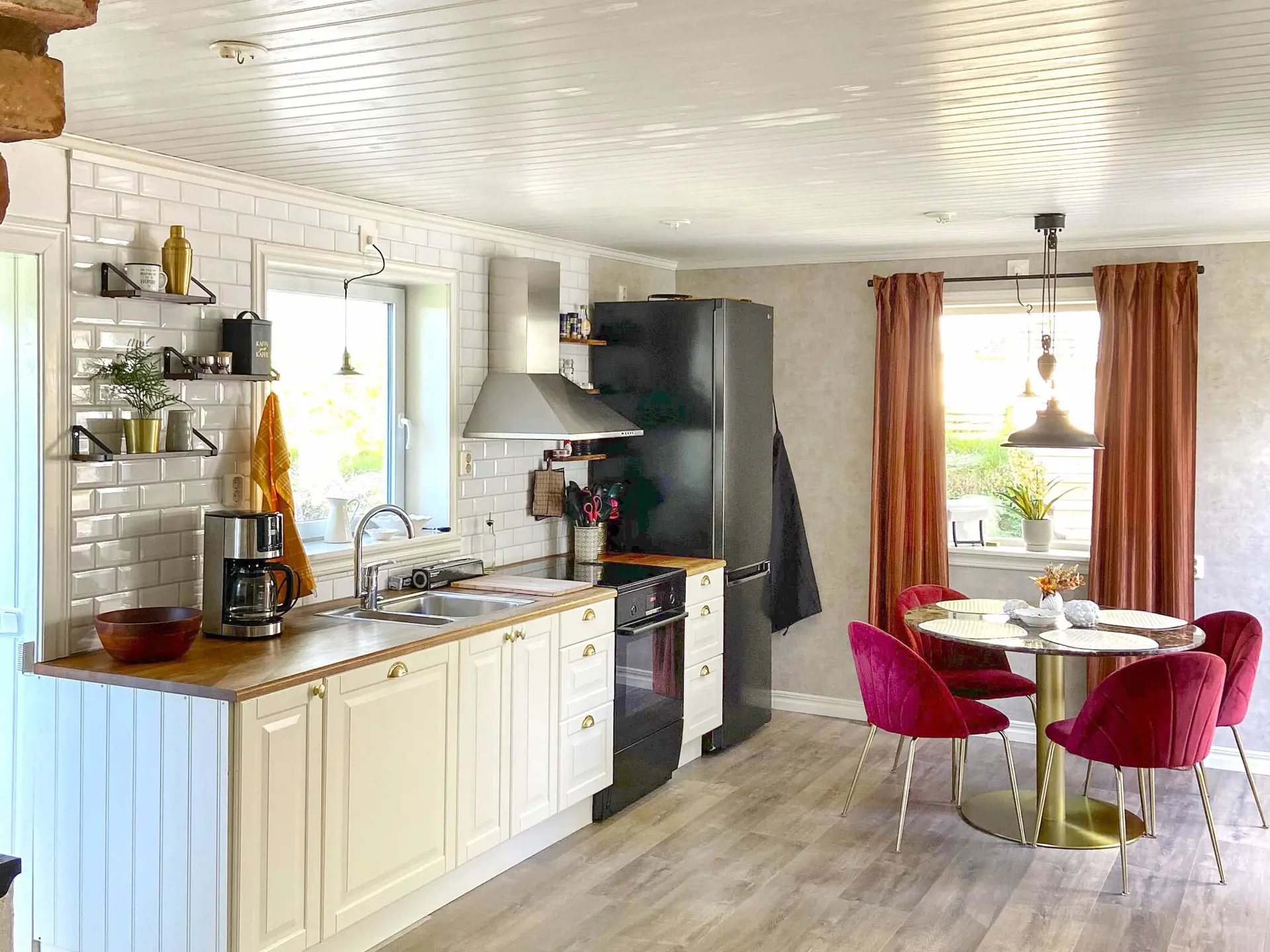 Sie werden im Außenraum mit einer schönen Sitzecke begrüßt. Die Halle ist länglich und bietet Platz zum Verweilen. Nebenan liegt das größere Schlafzimmer mit einem 180 cm großen Bett. Geradeaus befindet sich das Badezimmer, das hell und modern eingerichtet ist. Es gibt eine Dusche, eine Toilette sowie eine Waschmaschine und einen Trockner. Nach links öffnet sich der große, schöne Wohnraum mit schöner Einrichtung und ist zum Dachfirst hin offen. Eine massive Ziegelwand lädt Sie in den hellen Küchenbereich ein. Es gibt auch Tische mit Sitzgelegenheiten für 4–6 Personen. Neben der schönen Küche gibt es auch eine nette kleine Nische zum Entspannen/Schreiben/Arbeiten. Der Dachboden ist über eine steile Leiter vom Wohnzimmer aus erreichbar. Hier oben steht ein schöner Kriechraum mit einem Doppelbett und einem Fernseher mit Chromecast zur Verfügung.