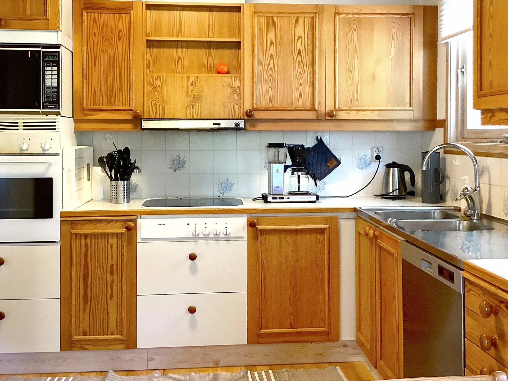 Im Wohnzimmer gibt es ausreichend Sitzgelegenheiten am Esstisch oder auf dem Sofa. Das Sofa ist auch ein Schlafsofa (ausgezogen 140 cm breit). Hier im Wohnzimmer gibt es einen Ofen, der an kühleren Abenden wohlig wärmt. Die Küche hat alles, was Sie für einen angenehmen Aufenthalt benötigen und einen kleinen Küchentisch für 4 Personen. Nebenan befindet sich auch eine Waschküche mit eigenem Eingang. Perfekt, wenn Sie länger bleiben möchten oder mit kleinen Kindern reisen und Wäsche waschen müssen.