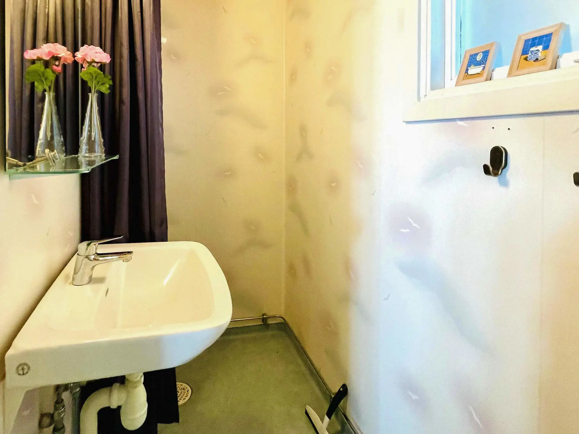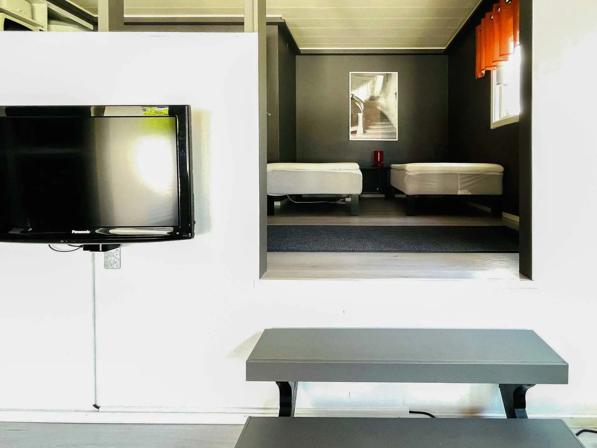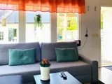 Das Ferienhäuschen bietet einen hellen und einladenden, offenen Grundriss mit großen Fenstern, die viel Tageslicht hereinlassen. Das bequeme Sofa lässt sich leicht in ein Schlafsofa für zwei Personen (140 cm) umwandeln, perfekt für eine erholsame Nachtruhe. Die Küche, die über zwei kleine Stufen zugänglich ist, ist voll ausgestattet mit allem, was Sie brauchen: Herd, Backofen, Kaffeemaschine, Mikrowelle, Kühlschrank und Gefrierschrank.